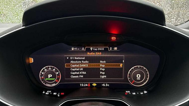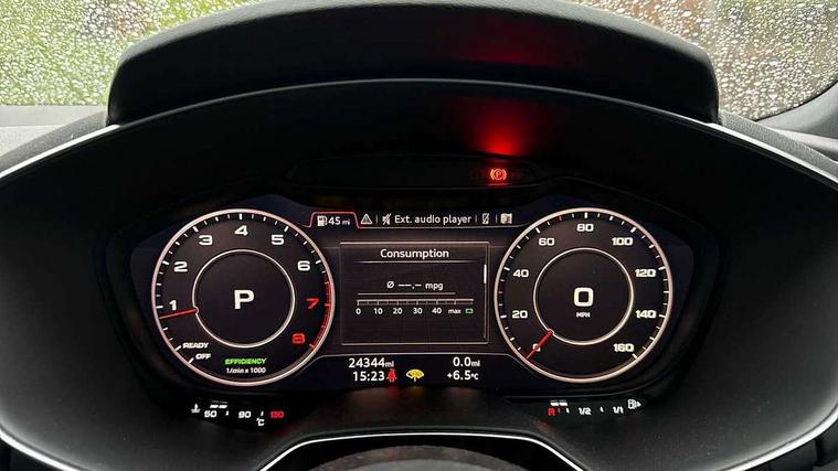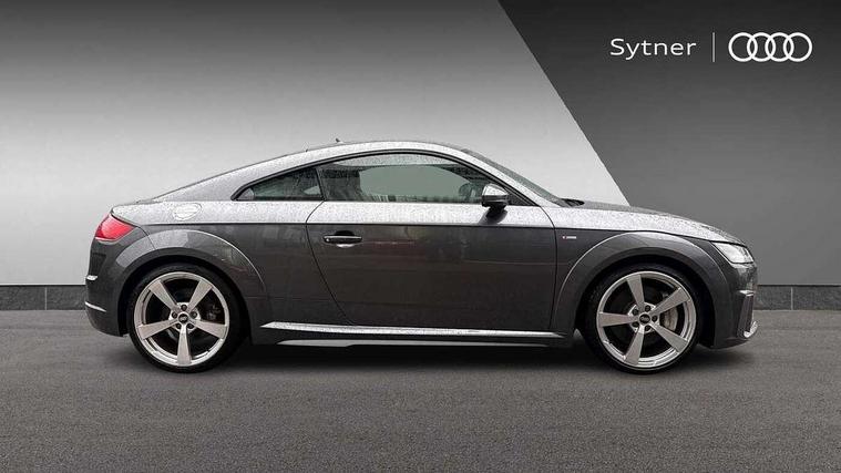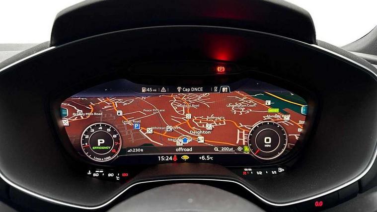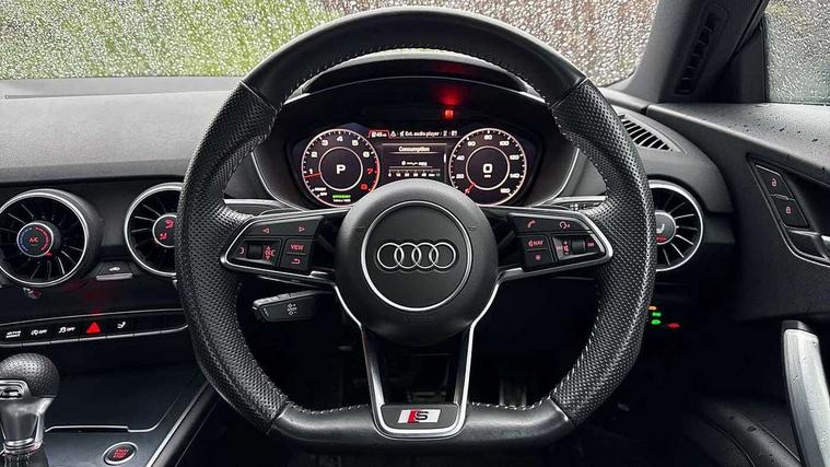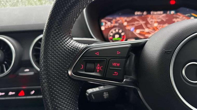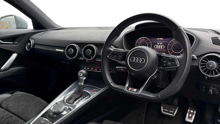 Audi drive select with 4 Pre configured modes, Audi smartphone interface, Audi virtual cockpit - 12.3" high-resolution LCD display with fully customisable instrument cluster, Cruise control + speed limiter, MMI touch panel, Mobile phone preparation with bluetooth interface, Progressive power assisted steering, Service interval indicator, Start/Stop system with energy recuperation, TP memo, S line sports suspension, AM/FM radio, Bluetooth audio streaming, DAB Digital radio, MMI Radio with CD player and SD/XC card slot, Auto dimming rear view mirror, Auto headlight range control, Body colour bumpers, Body colour electrically adjustable and heated door mirrors with built in LED side indicators, Electric folding door mirrors, Electric front windows, Front fog lights, Green tinted heat insulating glass, High gloss black radiator grille, LED daytime running lights, LED headlights with LED rear lights + dynamic rear indicators, Light and rain sensors, Retractable rear boot spoiler, S line badges on front wings, S Line front and rear bumpers, S line rear diffuser with platinum grey insert, S line side sills, Sunband for windscreen, 12V socket, 3 spoke flat bottomed high multi-function leather sport steering wheel with gearshift paddles, 4 way electric lumbar support for driver and front passenger, Black headlining, Door sill trims with S line logo, Extended aluminium look with stainless steel pedals, Front centre armrest, Front super sports seats, Heated front seats, Height adjustable driver's seat, Height adjustable front head restraints, Height/reach adjust steering wheel, ISOFIX child seat mounting for front passenger seat with airbag deactivation, Perforated leather gearknob in black, Rear head restraints, Rear top tether child seat ISOFIX attachment, S Line badge on steering wheel, Split folding rear seat, Non smoking pack - TT/TT RS, 3 point front seat belts, ABS, ASR traction control, Brake energy regeneration, Curtain airbags, Driver and front passenger airbag with front passenger airbag deactivation, EDL traction control, Electromechanical parking brake, ESP, First aid kit, Front side airbags, Head airbags, Hill hold assist, Seatbelt warning, Tyre pressure warning, Warning triangle, Anti theft alarm, Anti theft wheel bolts, Immobiliser, Keyless Go, Remote central locking, Matt brushed aluminium inlays, Tool kit, Tyre repair kit,