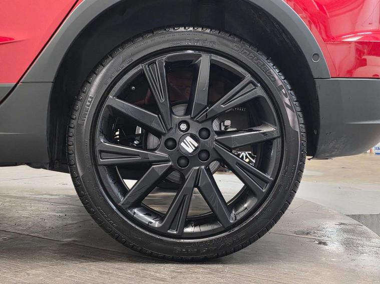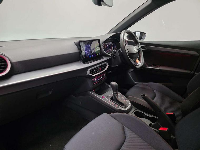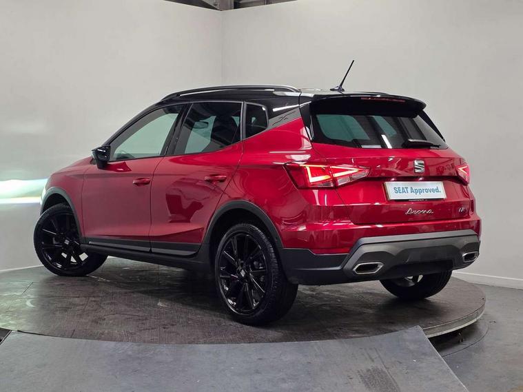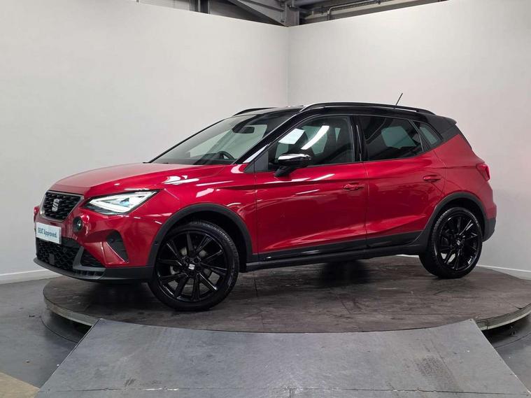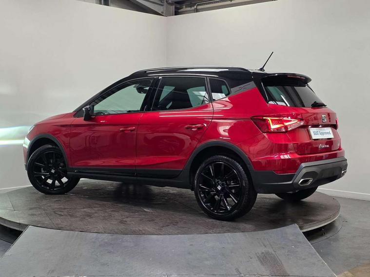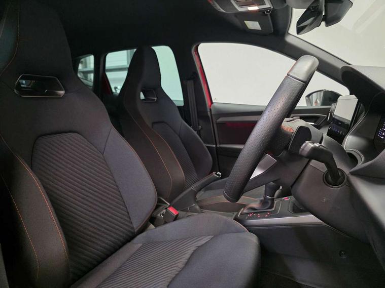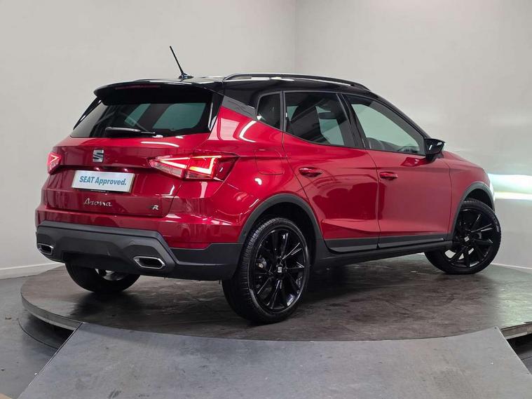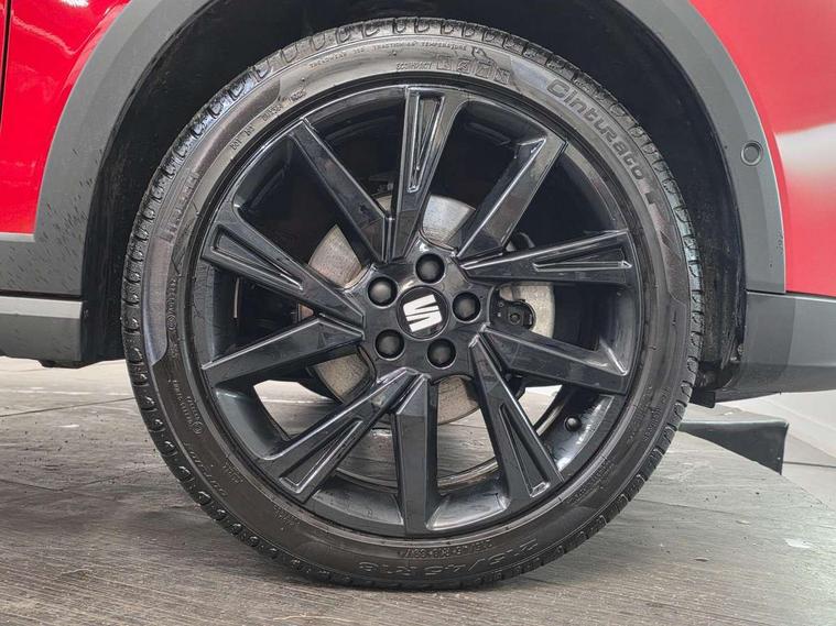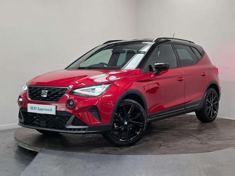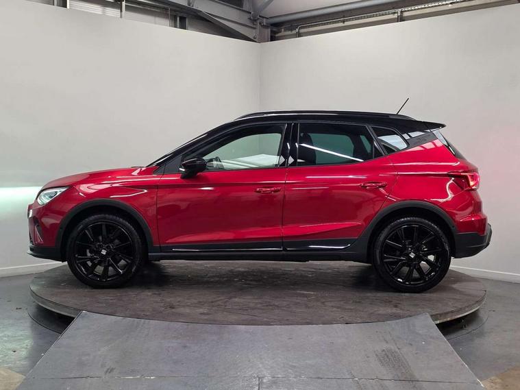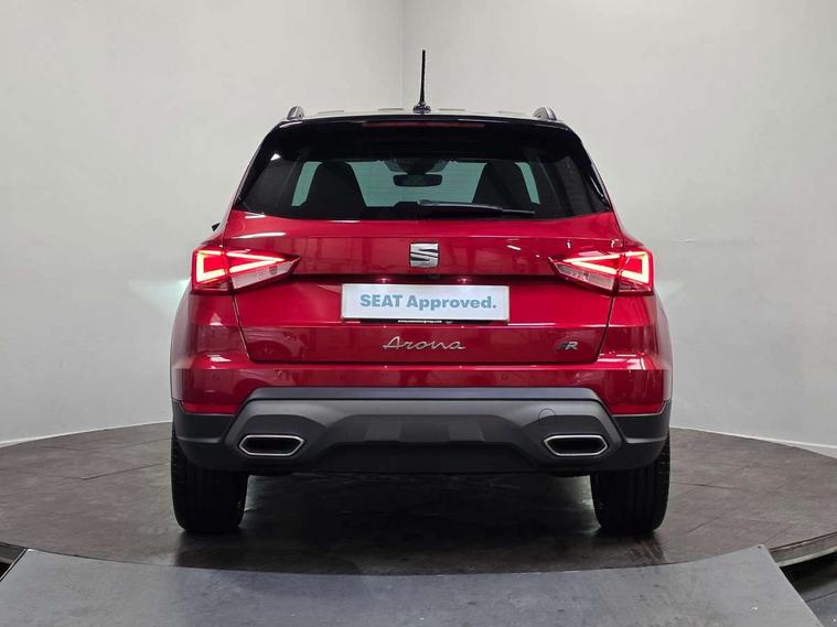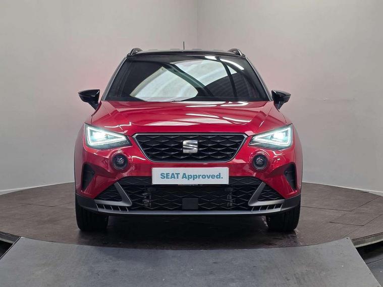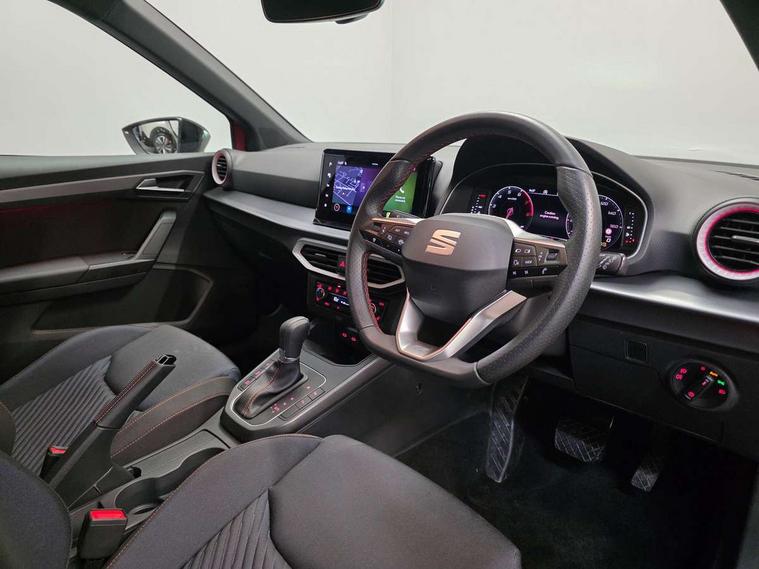 'Lights On' Reminder warning buzzer, 10" Digital cockpit, Digital clock, E-call, Electric speed sensitive power steering, Full link smartphone integration with mirror link, wireless apple carplay, Google android auto + USB Type C cable for apple and android devices, Lane keeping system, Low fuel warning light, Outside temperature display, Park assist system, Rear view camera, RPM counter, SEAT Drive profile - Four different models normal-sport-eco-individual, steering response, throttle response and gear shifts mode, Trip computer, Wireless phone charger, 6 speakers, 9.2" colour touchscreen with navigation system, voice control and USB port (type c), Bluetooth interface for hands free and audio streaming, DAB digital radio and AM/FM radio, Steering wheel mounted audio controls, Anti theft roof antenna, Auto dimming interior rear view mirror, Automatic activation of hazard warning lights, Black roof rails and window surrounds, Black side skirts, Body coloured bumpers, Body coloured door handle inserts, Dark tinted rear windows, Electric front/rear windows, Electrically adjustable, heated and folding door mirrors, Front fog lights with cornering function and rear fog light, FULL LED automatic headlights with dynamic headlight range control, coming and leaving home, LED daytime running lights, Lasered lettering on B pillar, LED rear tail lights and licence plate lights, Protective side mouldings, Rain sensing wipers, Rear side wing doors, Rear spoiler, Rear window wash/wipe, Roof colour door mirrors, Third brake light, Twin exhaust pipe styling hidden exhaust pipe, Visible VIN plate, 2 cupholders, 3 seat bench in 2nd row, 60/40 split folding rear seat, Aircare filter, Black interior roof, Double boot floor, Driver sunvisor with covered mirror + card holder, Dual zone climate control, Front courtesy light with front reading lights, Front seat back storage pockets, Gear shift indicator, Grey interior air vents, Heated front seats, Height adjustable front seats, Height/reach adjustable steering column, Illuminated air vent surrounds, Illuminated boot, Instrument lighting with brightness control, Interior ambient lighting, Interior light in footwell, central console and door panel, ISOFIX points in outer rear seats with top tether anchorage points, Microsuede cloth upholstery, Passenger sunvisor with vanity mirror, Perforated flat bottomed leather steering wheel/gear knob/handbrake with red stitching and FR logo, Potentiometer, Single front passenger seat, Sports cloth bucket seats, Steering wheel mounted gearshift paddles, Two front and three rear height adjustable headrests, Interior chrome pack - Arona, Safe and driving pack (S) - Arona, Safety and driving pack (M) - Arona, ABS, Active front headrests, Child locks on rear doors, Driver and front passenger airbags with front passenger airbag de activation, front side and curtain airbags, Emergency Brake Assist (EBA) and front assist, Front and rear seatbelt reminder, Hill hold control, Multi-Collision braking, Tiredness recognition system, Traction control, Tyre pressure monitoring system, Alarm with back up horn with tow away protection, Deadlock, Electronic engine immobiliser, KESSY Keyless entry and go, Locking wheel bolts, Remote central locking, Titan black dashboard, 18" Black alloy wheels,