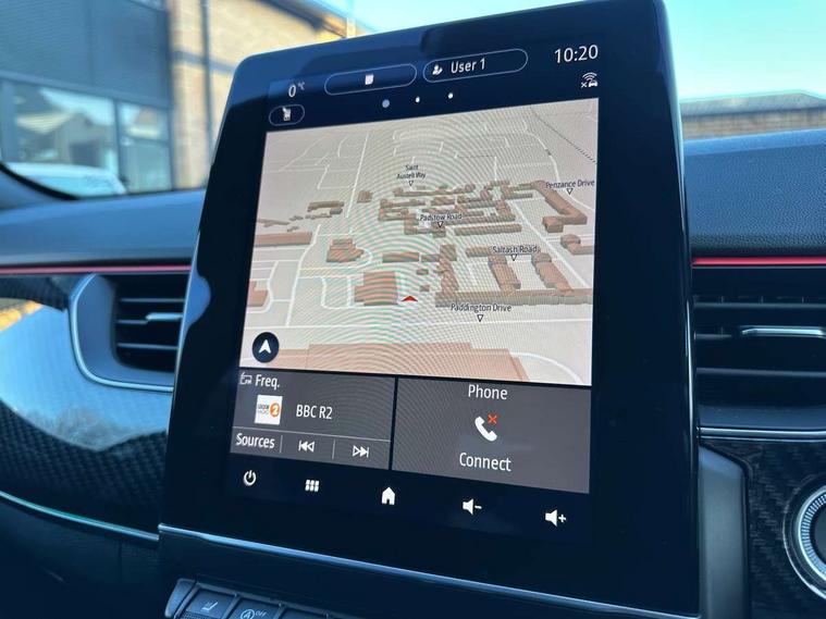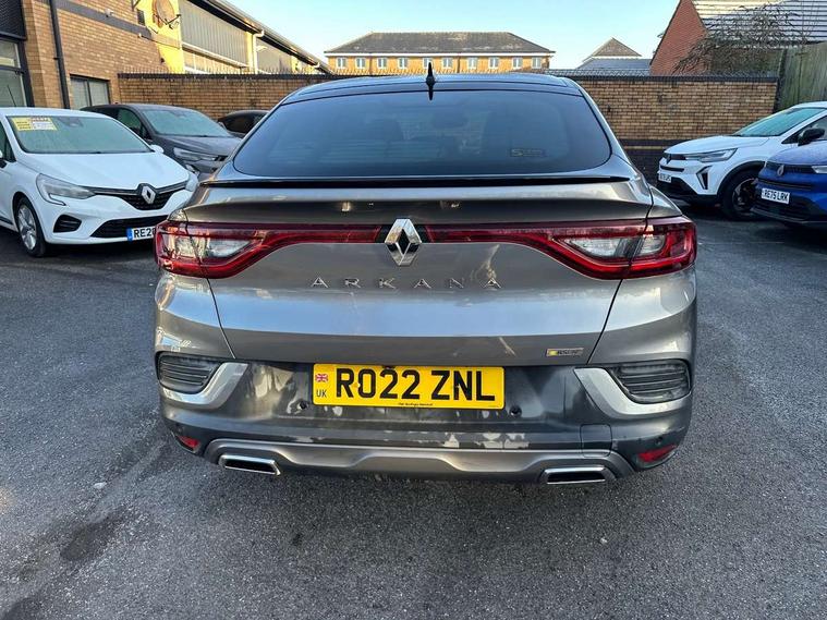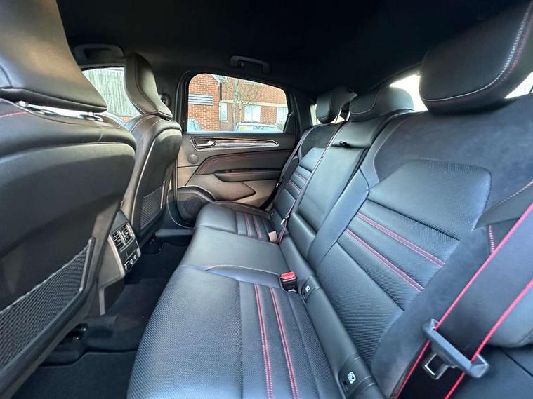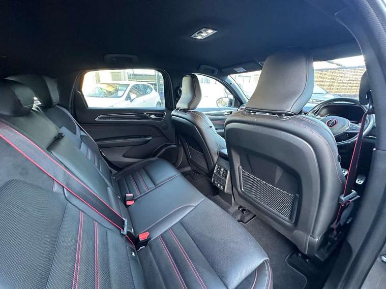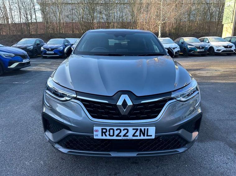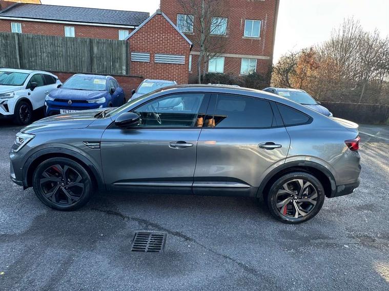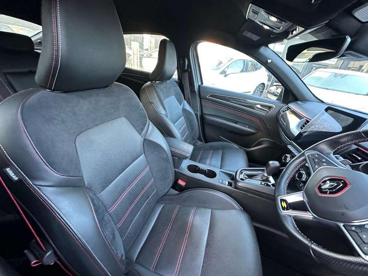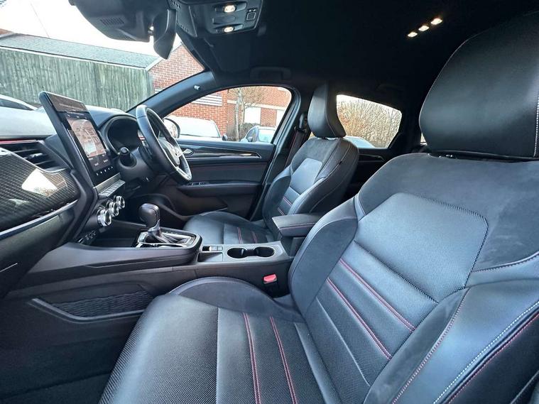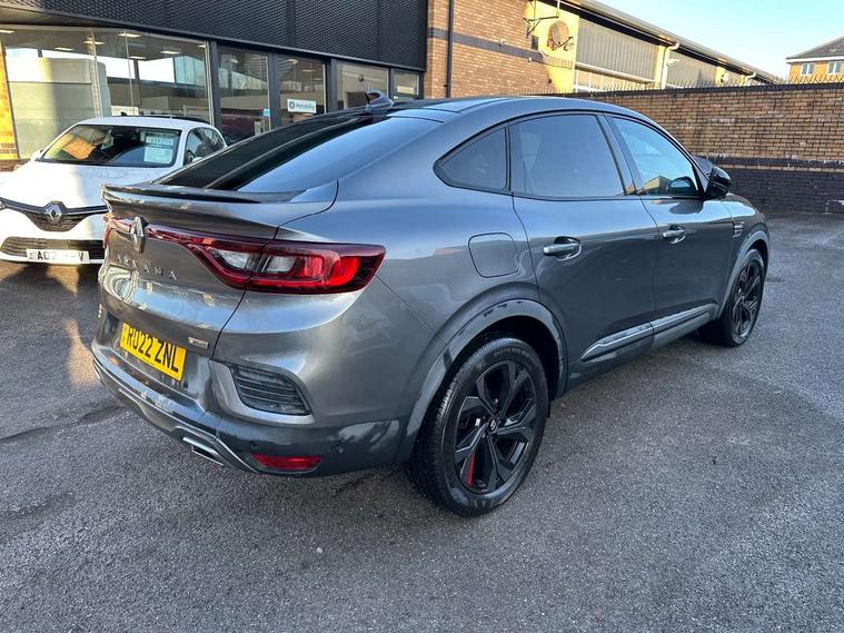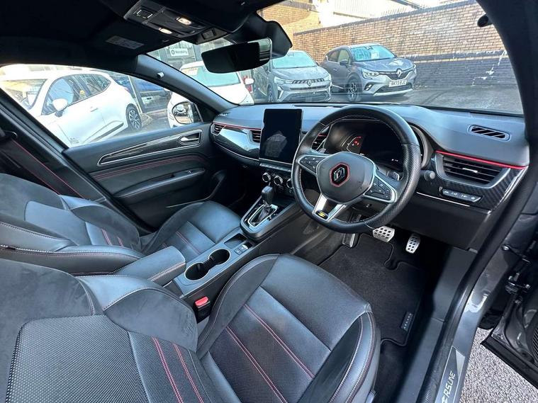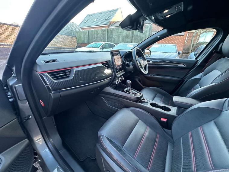 7" TFT Driver information display, Blind spot warning, Bluetooth system, EASY LINK 9.3" portrait touchscreen with navigation, Google search and traffic information, eCall emergency call system, Eco mode, Front and rear parking sensors, Gear change indicator, Lane departure warning, Lane keep assist, Multi-sense - 3 driving modes and 8 ambient lighting, Rear cross traffic alert, Rear view camera, Renault automatic emergency assist, Smartphone integration compatible with Apple CarPlay and Android Auto, Traffic sign recognition with over speed warning, Trip computer, Variable assistance electric power steering, Wireless phone charger, DAB radio, USB port, 3rd brake light, Auto dimming rear view mirror, Automatic headlights, Automatic high / low beam, Automatic windscreen wipers with rain sensor, Black side door protection with gun metal insert, Body coloured bumpers, C-shaped LED front signature lighting, Chrome decopart on wing (fender molding) with R.S. Line badge, Double chromed exhaust tailpipes elements, Extra tinted rear windows and tailgate, Frameless rear view mirror, Front and rear electric windows, Front bumper with F1 blade and honeycomb front grille, Front driver window with one touch facility and anti-pinch function, Front grille with chrome on upper part, Full LED headlights, Glossy black door mirror and lower window lining, Gun Metal front and rear skid plates, Heated rear window, R.S. Line badges on front wing and hatch door, Rain sensor, Rear windscreen wiper, Shiny black shark fin antenna, Side mirrors adjustable electrically, electrically foldable, with defrosting and temperature sensor, automatically foldable at vehicle closure, 3 seat bench in 2nd row, 60:40 split and fixed base rear seats, Aluminium pedals, Automatic climate control with combined filter, humidity sensor and AQS, Black interior roof lining, Carbon style dashboard, Central console with storage, Driver's seat height adjustment, Electrically adjustable front seats, Front and rear head restraints, Height and depth manually adjustable steering wheel, ISOFIX child seat fixing points on rear outermost seats, LED front and rear roof lights, Passenger seat height adjuster, R.S. line black suede-leather upholstery with red/grey stiching, R.S. Line perforated leather steering wheel with red/black harmony and R.S. Line badge, Rear air vents, Red inserts on air vents, Single front passenger seat, Parking Pack - Hands-free parking & flank protection - Arkana, Winter pack - Arkana, 3x3 point rear seat belts, ABS+EBA, Active emergency braking system, Distance warning alert, Driver airbag, Driver and passenger front and side airbag deactivation, Driver and passenger side airbags, Driver height adjustable seat belt, Electronic parking brake with auto hold, ESC (Electronic Stability Control), Front and rear no seatbelt warning sound, Front curtain airbags, Front head airbags, Hill start assist, Passenger airbag, Tyre pressure warning light, Anti drill door locks and locking fuel cap, Central door locking, Deadlocking system, Hands free keycard with Keyless access and start, RAID (Renault Anti-Intruder Device) automatic door locking, Rear side wing door and window child locking function (front driver door control panel), Superlocking, Thatcham alarm, 18" Silverstone diamond alloy wheels with red inserts,