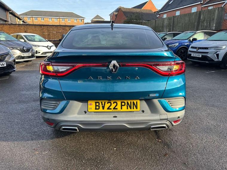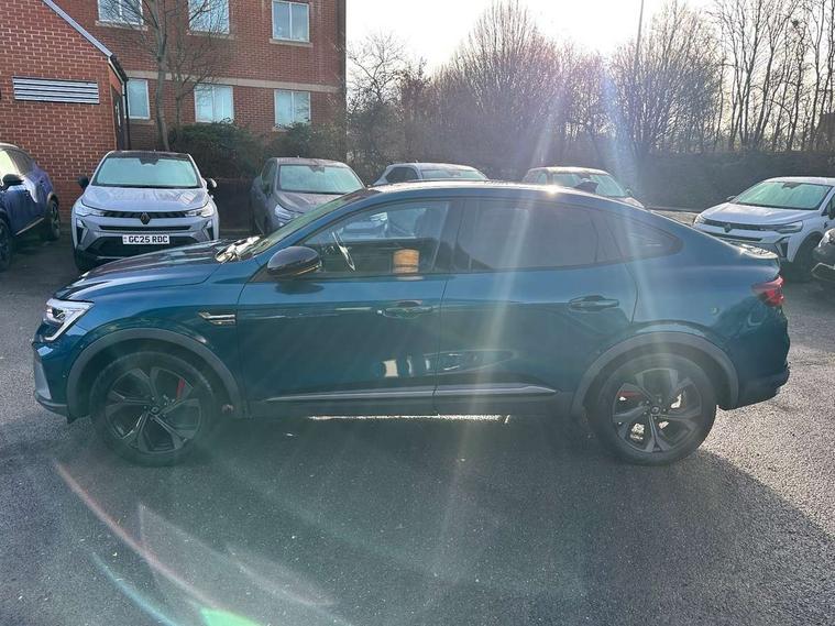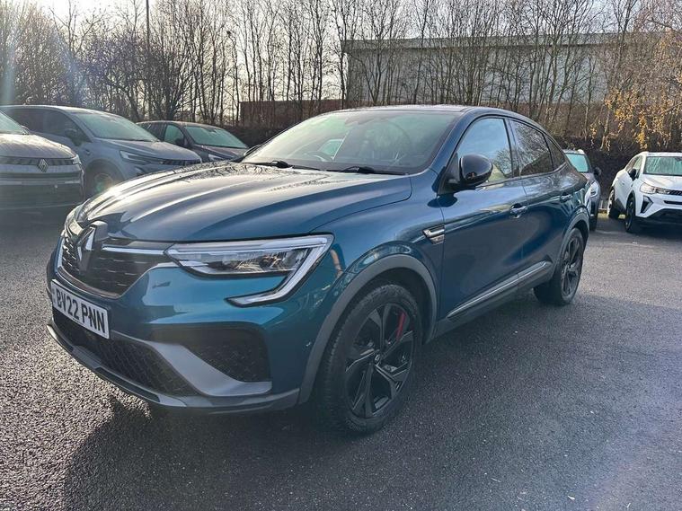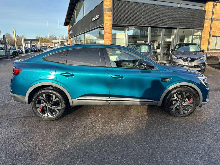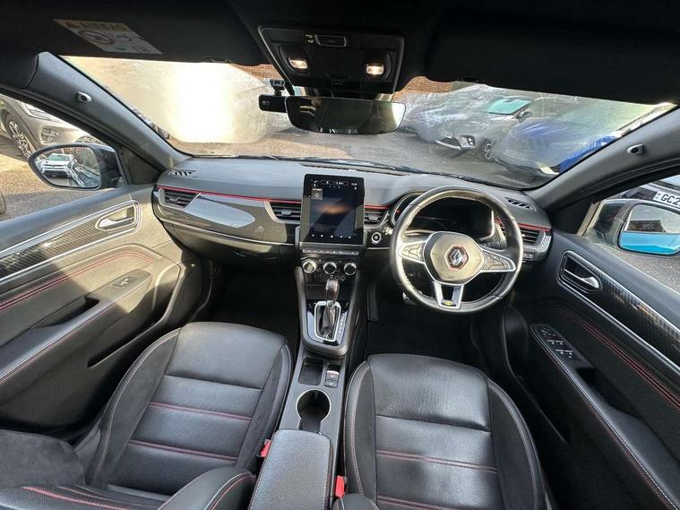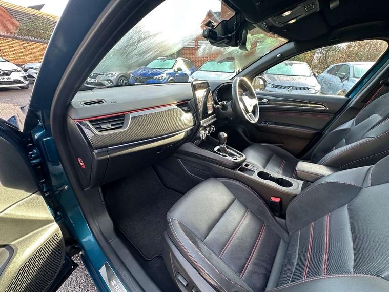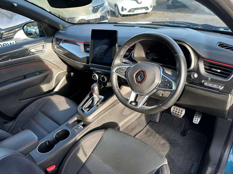 7" TFT Driver information display, Blind spot warning, Bluetooth system, EASY LINK 9.3" portrait touchscreen with navigation, Google search and traffic information, eCall emergency call system, Eco mode, EV button to activate pure mode, Front and rear parking sensors, Gear change indicator, Lane departure warning, Lane keep assist, Multi-sense - 3 driving modes and 8 ambient lighting, Rear cross traffic alert, Rear view camera, Renault automatic emergency assist, Smartphone integration compatible with Apple CarPlay and Android Auto, Traffic sign recognition with over speed prevention, Trip computer, Variable assistance electric power steering, Wireless phone charger, DAB radio, USB port, 3rd brake light, Auto dimming rear view mirror, Automatic headlights, Automatic high / low beam, Automatic windscreen wipers with rain sensor, Black side door protection with gun metal insert, Body coloured bumpers, C-shaped LED front signature lighting, Chrome decopart on wing (fender molding) with R.S. Line badge, Double chromed exhaust tailpipes elements, Extra tinted rear windows and tailgate, Frameless rear view mirror, Front and rear electric windows, Front bumper with F1 blade and honeycomb front grille, Front driver window with one touch facility and anti-pinch function, Front grille with chrome on upper part, Full LED headlights, Glossy black door mirror and lower window lining, Gun Metal front and rear skid plates, Heated rear window, R.S. Line badges on front wing and hatch door, Rain sensor, Rear windscreen wiper, Shiny black shark fin antenna, Side mirrors adjustable electrically, electrically foldable, with defrosting and temperature sensor, automatically foldable at vehicle closure, 3 seat bench in 2nd row, 60:40 split and fixed base rear seats, Aluminium pedals, Automatic climate control with combined filter, humidity sensor and AQS, Black interior roof lining, Carbon style dashboard, Central console with storage, Driver's seat height adjustment, Electrically adjustable front seats, Front and rear head restraints, Height and reach adjustable steering wheel, ISOFIX child seat fixing points on rear outermost seats, LED front and rear roof lights, Passenger seat height adjuster, R.S. line black suede-leather upholstery with red/grey stiching, R.S. Line perforated leather steering wheel with red/black harmony and R.S. Line badge, Rear air vents, Red inserts on air vents, Single front passenger seat, Parking Pack - Hands-free parking & flank protection - Arkana, Winter pack - Arkana, 3x3 point rear seat belts, ABS+EBA, Active emergency braking system, B Brake Mode - One pedal driving with increased regenerative braking, Distance warning alert, Driver airbag, Driver and passenger front and side airbag deactivation, Driver and passenger side airbags, Driver height adjustable seat belt, Electronic parking brake with auto hold, ESC (Electronic Stability Control), Front and rear no seatbelt warning sound, Front curtain airbags, Front head airbags, Hill start assist, Passenger airbag, Tyre pressure warning light, Anti drill door locks and locking fuel cap, Central door locking, Deadlocking system, Hands free keycard with Keyless access and start, RAID (Renault Anti-Intruder Device) automatic door locking, Rear side wing door and window child locking function (front driver door control panel), Superlocking, Thatcham alarm, 18" Silverstone diamond alloy wheels with red inserts,