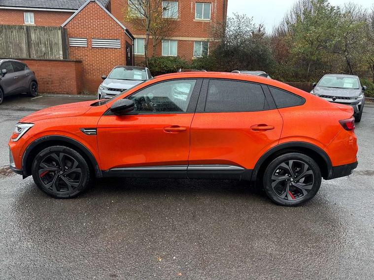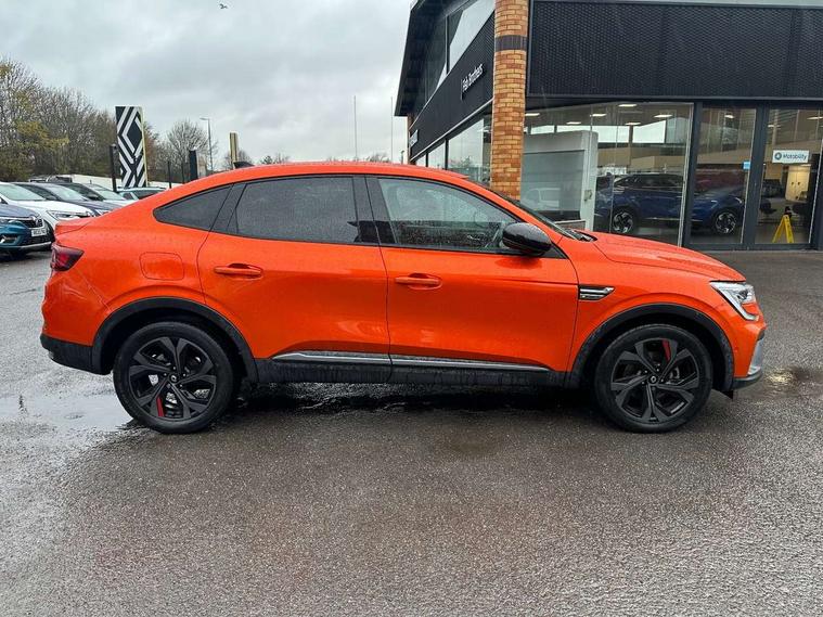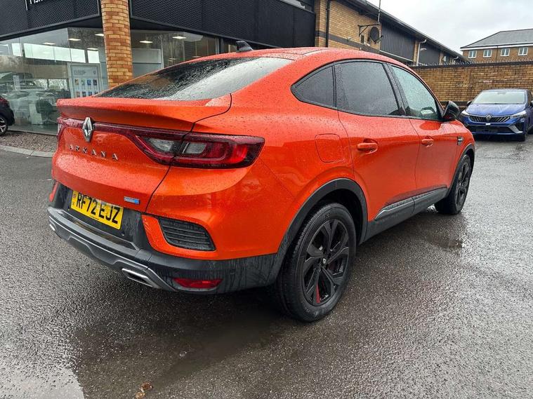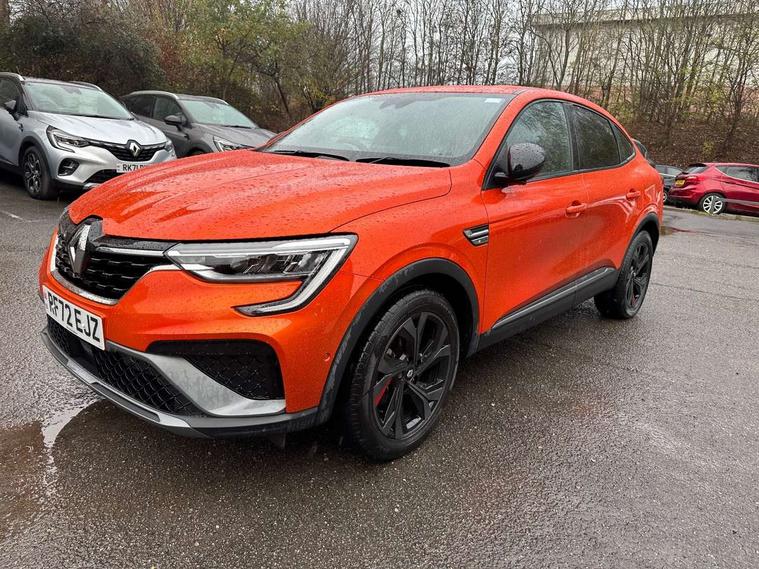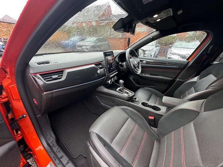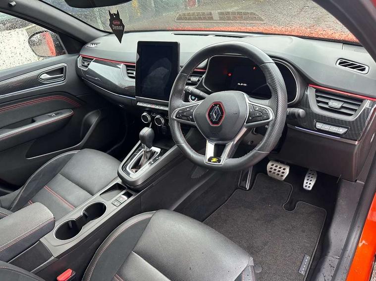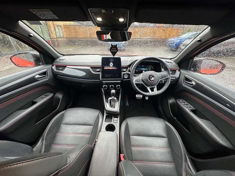 7" TFT Driver information display, Blind spot warning, Bluetooth system, EASY LINK 9.3" portrait touchscreen with navigation, Google search and traffic information, eCall emergency call system, Eco mode, EV button to activate pure mode, Front and rear parking sensors, Gear change indicator, Lane departure warning, Lane keep assist, Multi-sense - 3 driving modes and 8 ambient lighting, Rear cross traffic alert, Rear view camera, Renault automatic emergency assist, Smartphone integration compatible with Apple CarPlay and Android Auto, Traffic sign recognition with over speed prevention, Trip computer, Variable assistance electric power steering, Wireless phone charger, DAB radio, USB port, 3rd brake light, Auto dimming rear view mirror, Automatic headlights, Automatic high / low beam, Automatic windscreen wipers with rain sensor, Black side door protection with gun metal insert, Body coloured bumpers, C-shaped LED front signature lighting, Chrome decopart on wing (fender molding) with R.S. Line badge, Double chromed exhaust tailpipes elements, Extra tinted rear windows and tailgate, Frameless rear view mirror, Front and rear electric windows, Front bumper with F1 blade and honeycomb front grille, Front driver window with one touch facility and anti-pinch function, Front grille with chrome on upper part, Full LED headlights, Glossy black door mirror and lower window lining, Gun Metal front and rear skid plates, Heated rear window, R.S. Line badges on front wing and hatch door, Rain sensor, Rear windscreen wiper, Shiny black shark fin antenna, Side mirrors adjustable electrically, electrically foldable, with defrosting and temperature sensor, automatically foldable at vehicle closure, 3 seat bench in 2nd row, 60:40 split and fixed base rear seats, Aluminium pedals, Automatic climate control with combined filter, humidity sensor and AQS, Black interior roof lining, Carbon style dashboard, Central console with storage, Driver's seat height adjustment, Electrically adjustable front seats, Front and rear head restraints, Height and reach adjustable steering wheel, ISOFIX child seat fixing points on rear outermost seats, LED front and rear roof lights, Passenger seat height adjuster, R.S. line black suede-leather upholstery with red/grey stiching, R.S. Line perforated leather steering wheel with red/black harmony and R.S. Line badge, Rear air vents, Red inserts on air vents, Single front passenger seat, Parking Pack - Hands-free parking & flank protection - Arkana, Winter pack - Arkana, 3x3 point rear seat belts, ABS+EBA, Active emergency braking system, B Brake Mode - One pedal driving with increased regenerative braking, Distance warning alert, Driver airbag, Driver and passenger front and side airbag deactivation, Driver and passenger side airbags, Driver height adjustable seat belt, Electronic parking brake with auto hold, ESC (Electronic Stability Control), Front and rear no seatbelt warning sound, Front curtain airbags, Front head airbags, Hill start assist, Passenger airbag, Tyre pressure warning light, Anti drill door locks and locking fuel cap, Central door locking, Deadlocking system, Hands free keycard with Keyless access and start, RAID (Renault Anti-Intruder Device) automatic door locking, Rear side wing door and window child locking function (front driver door control panel), Superlocking, Thatcham alarm, 18" Silverstone diamond alloy wheels with red inserts,