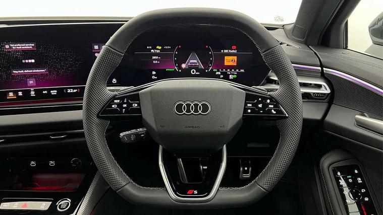 Adaptive cruise control, Advanced driver attention and fatigue montior, Audi application store, Audi assistant, Audi connect emergency call and service, Audi drive select, Audi smartphone interface, Audi virtual cockpit plus with 11.9" OLED colour display, Automatic start/stop system with coasting functionality, Camera based traffic sign recognition, Intersection assist, Lane departure warning, MMI navigation plus with high resolution 14.5" OLED touchscreen colour display, Park assist plus, Parking system plus with 360 display, Progressive steering with servotronic, Rear view camera, Swerve assist and turn assist, Traffic sign based speed limiter, Sports suspension lowered by 20mm, 2 USB-C ports in both the front and rear, Audi sound system impressive sound with 10 loudspeakers including centre speaker and subwoofer, 6-channel amplifier with a total output of 180 watts, DAB digital radio reception, Smartphone compartment with wireless charging, Aluminium roof rails, Aluminium window trims, Auto dimming rear view mirror, Body colour door mirrors, Door mirrors - electrically adjustable, heated, folding and auto dimming on both sides, Front and rear electric windows, Front door sill trims with aluminium inlays, illuminated with 'S' logo, High beam assist, LED headlights Plus incl. digital daytime running lights, turning light, all-weather light, motorway light, manouevring light and intersection light, LED rear lights pro incl. dynamic rear indicators and illuminated light strip with animated coming and leaving home function, LED third brake light, Privacy glass, Rear and side windows with heat insulating glass, Rear side wing doors, Rear wash/wipe, S Line badges on the front wings, S line bumpers, radiator grille and diffuser in phantom black and diffuser insert in matt anthracite, White rhombus logo projection light in exterior mirrors, Windscreen with acoustic glazing, 3 rear headrests, 3 seat rear bench, 3 spoke leather steering wheel with multi-function buttons with touch control, flattened on top and bottom, with S badging and contrast stitching, 3-zone automatic climate control, 40:20:40 split folding rear seat bench with centre armrest and cup holders, Comfort front centre armrest, Front and rear floor mats, Front seats with manual adjustment for position and 4-way electric lumbar support, Front sport seats with integrated headrest and S embossed logo, Headlining in black cloth, Heated front seats, i-Size child seat mounting on the front passenger side and outer rear seats, i-Size and top tether on the outer rear seats, Luggage compartment lid, electrically opening and closing, Manual steering column height and depth adjustment, Single front passenger seat, Stainless steel pedals and footrest, Steering wheel grips in perforated leather and shift paddles, Ambient lighting package plus - A5, 3x3 point rear seat belts, Driver airbag, Electric child safety locks, First aid kit with warning triangle and vests, Front emergency brake assist, Front passenger airbag, Front passenger airbag deactivation, Front side airbags with head airbag system and front interaction airbag, Hill hold assist, Seat belt monitoring with rear seat occupant reminder, Tyre pressure loss indicator, Anti theft alarm, Anti-theft wheel bolts, Keyless Go, Accent surfaces and control buttons in gloss black, Black dashboard with contrast stitching, Inlays in matt brushed aluminium with linear embossing, anthracite, Softwrap in leatherette with contrast stitching, Upper and lower interior elements in leatherette, Tyre repair kit,