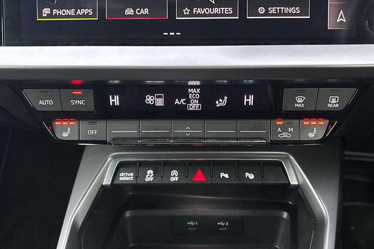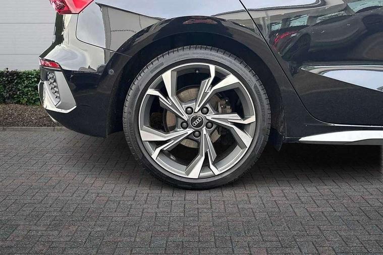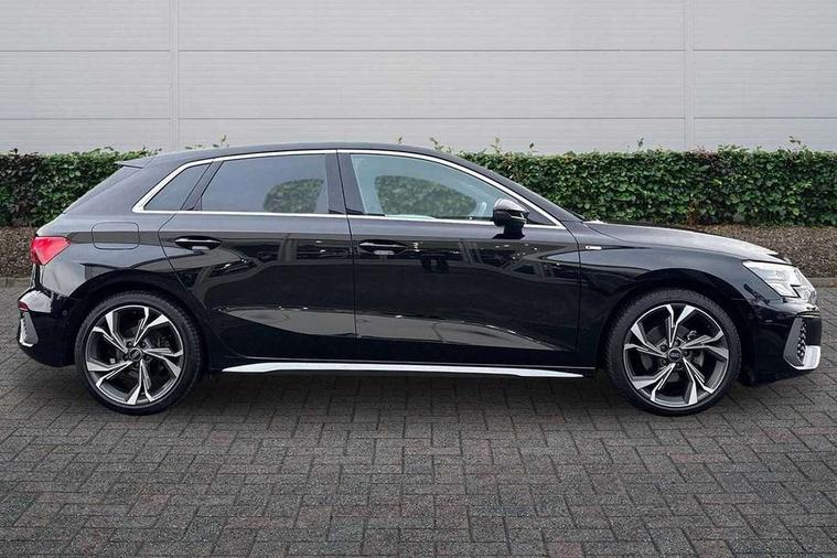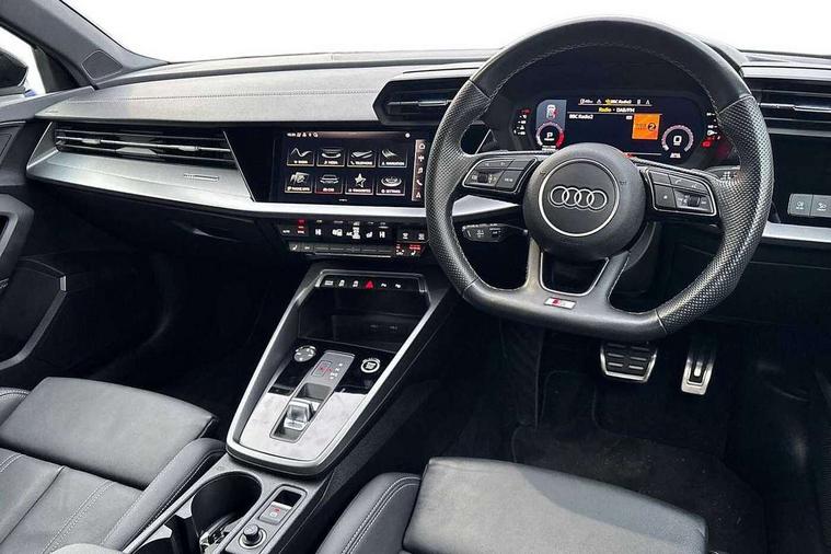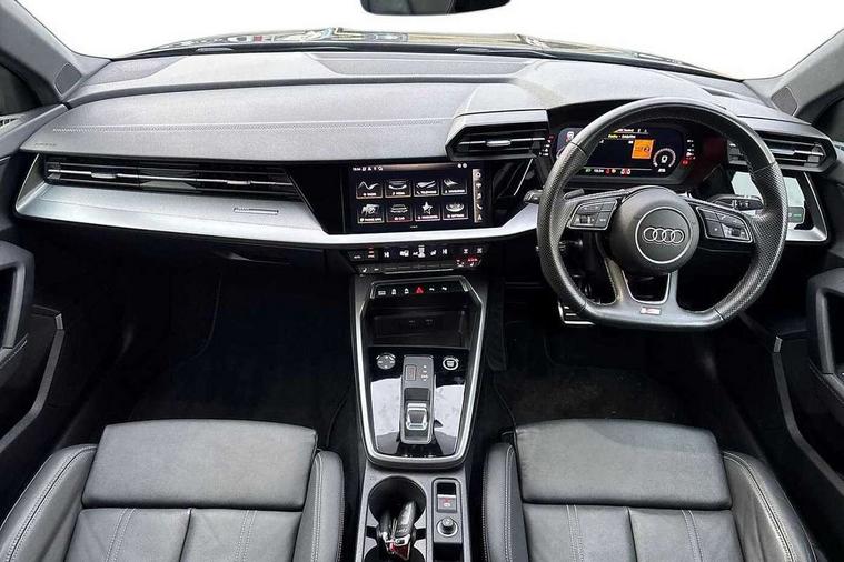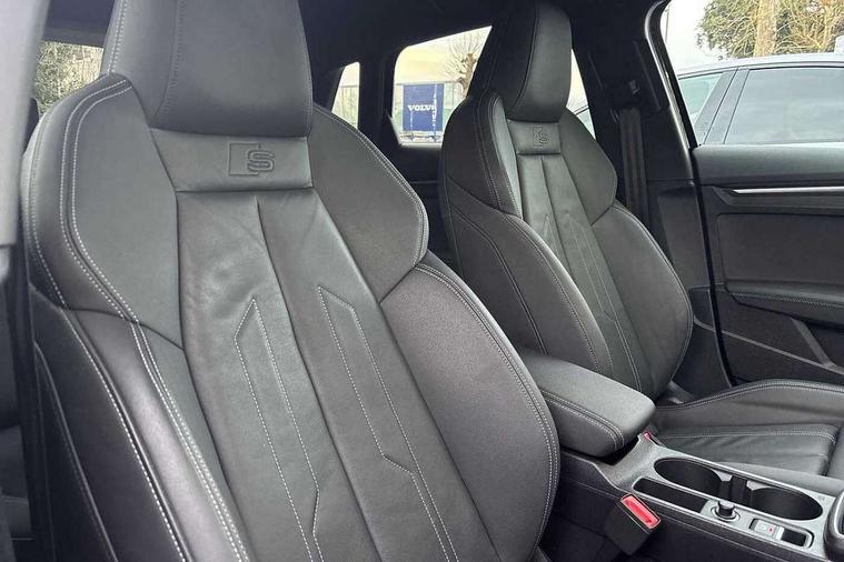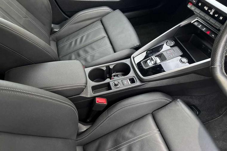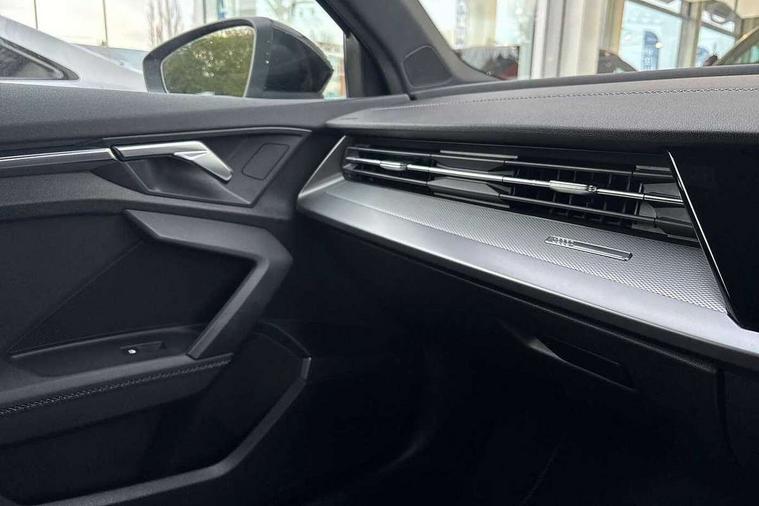 Audi drive select (Auto, Comfort, Dynamic, Efficiency and Individual), Audi smartphone interface, Audi Virtual Cockpit - 10.25" digital and colour instrument cluster, Automatic start/stop system with recuperation, Bluetooth interface, Collision avoidance assistant, e-Call (emergency call), Electromechanical power speed sensitive steering, Lane departure warning system, MMI Navigation Plus with high resolution 10.1" colour touch screen display, Service indicator, Trip computer, Voice control system with natural language interaction, Sports suspension, 2xUSB-C connection with data and charging functions, 6 passive loudspeakers, DAB Digital radio, 3rd brake light, Acoustic glass windscreen, Aluminium window trim, Auto dimming frameless rear view mirror, Body colour exterior mirrors, Electrically adjustable/heated/folding/auto dimming door mirrors with integrated LED indications + kerb view function for passenger side, Front electric windows, Illuminated aluminium inserts front door sills with S logo, LED daytime running lights, LED headlights with LED rear lights and dynamic rear indicators, Light and rain sensors, Privacy glass - dark tinted rear window, rear door and side windows, Rear electric windows, Rear side air outlets in grained matt black, Rear side wing doors, Rear wiper, S line bumpers, S roof spoiler, 12V socket and storage compartment in front centre console, 3 seat bench in 2nd row, 3 spoke leather multifunction steering wheel with paddle shift, 4 way electrically adjustable lumbar support for driver and front passenger, 60/40 split folding rear seat bench, Black cloth headlining, Dual zone electronic climate control, Front and rear centre armrest in leather, Front and rear headrests, Front/rear floor mats, Height and reach adjustable steering wheel, Interior lighting - glove compartment light and right hand side, Luggage compartment floor covering, Manual boot compartment lid, Manually adjustable front seats, Seat side bolsters, Single front passenger seat, Stainless steel pedals and front footrest in black, Twin leather upholstery with front sports seats S embossed logo, Aluminium interior elements pack - A3 Sportback, LED interior lighting pack - A3 Sportback, S line styling pack - A3 Sportback, 3x3 point rear seat belts, Driver and front passenger airbag with passenger airbag deactivation, Electronic Stabilisation Control (ESC) including ABS, ASR and EDL, First aid kit with warning triangle and 2 safety vests, Front side airbags with head airbags and interaction airbag, Pre-sense front with pedestrian and cyclist detection, Seatbelt monitoring, Tyre pressure loss indicator, Anti theft alarm, Anti-theft wheel bolts, Electronically operated child lock, Immobiliser, Remote control central locking, Dark spectrum aluminium inlays, accent surfaces in the dashboard and centre console in platinum grey silk effect paint finish,