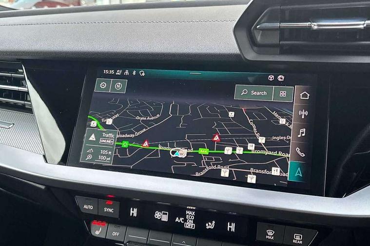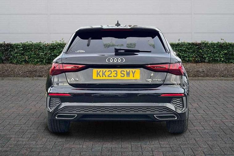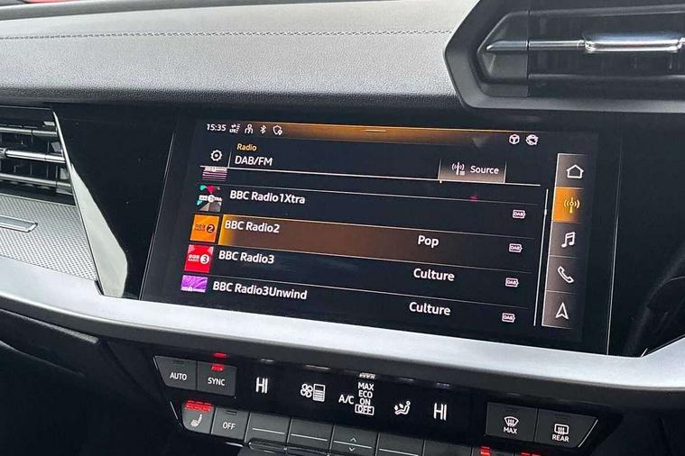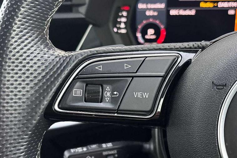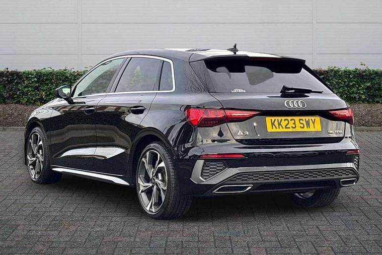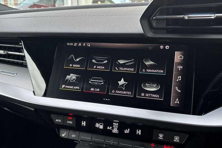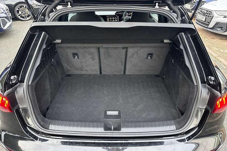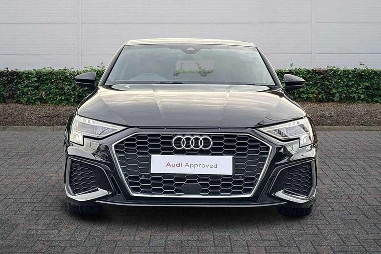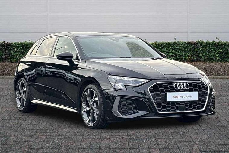 Audi drive select (Auto, Comfort, Dynamic, Efficiency and Individual), Audi smartphone interface, Audi Virtual Cockpit - 10.25" digital and colour instrument cluster, Automatic start/stop system with recuperation, Bluetooth interface, Collision avoidance assistant, e-Call (emergency call), Electromechanical power speed sensitive steering, Lane departure warning system, MMI Navigation Plus with high resolution 10.1" colour touch screen display, Service indicator, Trip computer, Voice control system with natural language interaction, Sports suspension, 2xUSB-C connection with data and charging functions, 6 passive loudspeakers, DAB Digital radio, 3rd brake light, Acoustic glass windscreen, Aluminium window trim, Auto dimming frameless rear view mirror, Body colour exterior mirrors, Electrically adjustable/heated/folding/auto dimming door mirrors with integrated LED indications + kerb view function for passenger side, Front electric windows, Illuminated aluminium inserts front door sills with S logo, LED daytime running lights, LED headlights with LED rear lights and dynamic rear indicators, Light and rain sensors, Privacy glass - dark tinted rear window, rear door and side windows, Rear electric windows, Rear side air outlets in grained matt black, Rear side wing doors, Rear wiper, S line bumpers, S roof spoiler, 12V socket and storage compartment in front centre console, 3 seat bench in 2nd row, 3 spoke leather multifunction steering wheel with paddle shift, 4 way electrically adjustable lumbar support for driver and front passenger, 60/40 split folding rear seat bench, Black cloth headlining, Dual zone electronic climate control, Front and rear centre armrest in leather, Front and rear headrests, Front/rear floor mats, Height and reach adjustable steering wheel, Interior lighting - glove compartment light and right hand side, Luggage compartment floor covering, Manual boot compartment lid, Manually adjustable front seats, Seat side bolsters, Single front passenger seat, Stainless steel pedals and front footrest in black, Twin leather upholstery with front sports seats S embossed logo, Aluminium interior elements pack - A3 Sportback, LED interior lighting pack - A3 Sportback, S line styling pack - A3 Sportback, 3x3 point rear seat belts, Driver and front passenger airbag with passenger airbag deactivation, Electronic Stabilisation Control (ESC) including ABS, ASR and EDL, First aid kit with warning triangle and 2 safety vests, Front side airbags with head airbags and interaction airbag, Pre-sense front with pedestrian and cyclist detection, Seatbelt monitoring, Tyre pressure loss indicator, Anti theft alarm, Anti-theft wheel bolts, Electronically operated child lock, Immobiliser, Remote control central locking, Dark spectrum aluminium inlays, accent surfaces in the dashboard and centre console in platinum grey silk effect paint finish,