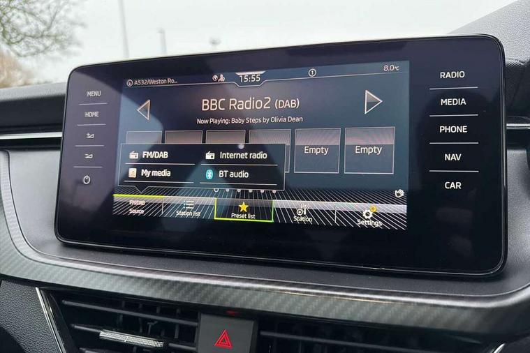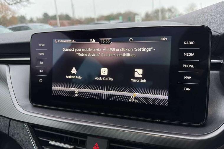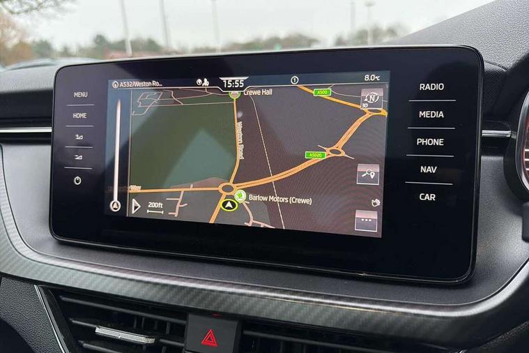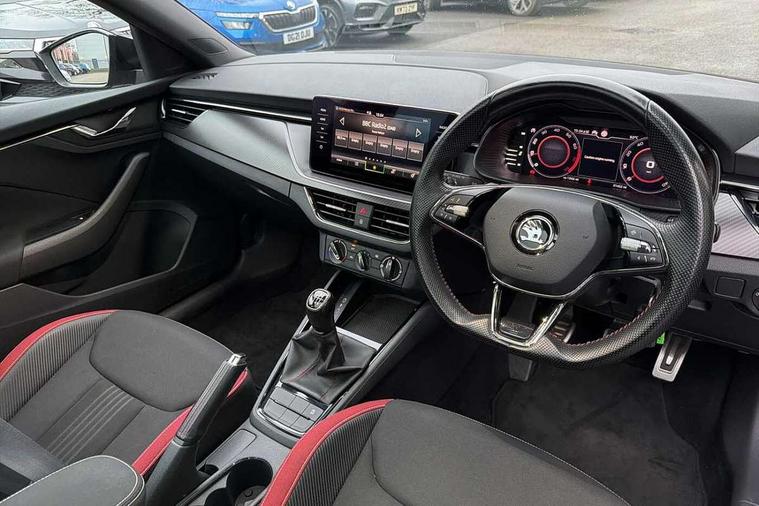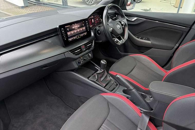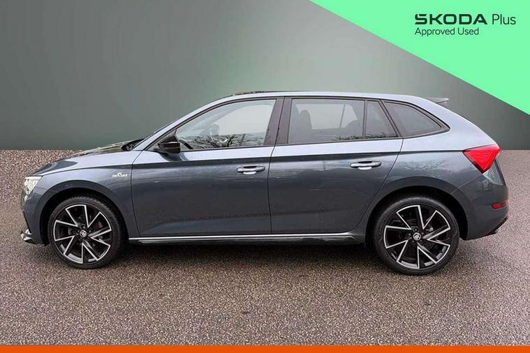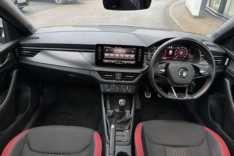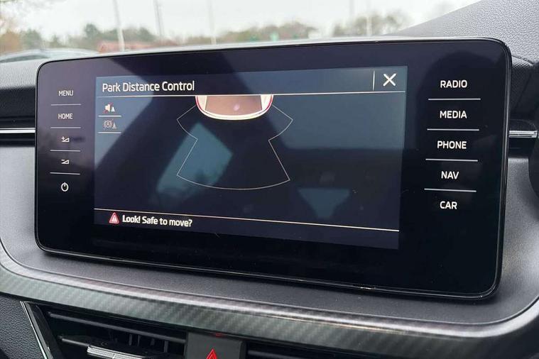 Amundsen satellite navigation with 9.2" glass colour touchscreen with virtual cockpit, web radio and traffic sign recognition, Bluetooth system, Easy light assist, Front assist system, Lane assist, Monte carlo instrument cluster, PAS, Rain and light assist with auto dimming rear view mirror, Speed limiter, 2 USB - C ports, 8 loudspeakers, DAB Digital radio, Black door mirrors, Black radiator grille, Black rear diffuser, Black roof spoiler, Black sill cover, Body colour door handles, Boot lettering in black, Electric folding door mirrors, Electrically adjustable and heated door mirrors, Front and rear electric windows, Front fog lights, Front sport bumper, LED daytime running lights, Monte carlo plaque, Privacy glass, Skoda across tailgate in black, Tinted windows, 12V Accessory socket in centre console, Aluminium pedals, Black roof lining, Chrome inner door handles, Cloth upholstery, Decor strip on dashboard and door panel, Door sills with lettering, Front centre armrest with stitching, Front gesture control, Front head restraints, Front sport seats, Glasses storage in roof liner, Height adjustable passenger seat, ISOFIX for rear passenger seat, Leather gearknob and handbrake lever, Manual lumbar support for front seats, Reading lights for driver and front passenger, Sun visor with make up mirror for front passenger, Textile floor mats, Third rear headrest, Umbrella, Exterior design pack - Scala, 3x3 point rear seatbelts, Curtain airbags, Emergency call and proactive services, Front head and side airbags, Hill hold control, One tone horn, Passenger airbag switch off function, Seat belt reminder for all seats, Alarm, Anti-theft wheel bolts, Remote central locking with 2 remote folding keys, SAFE function for remote central locking, Chrome air vent surrounds, 18" Vega alloy wheels in black, Temporary space saver wheel,