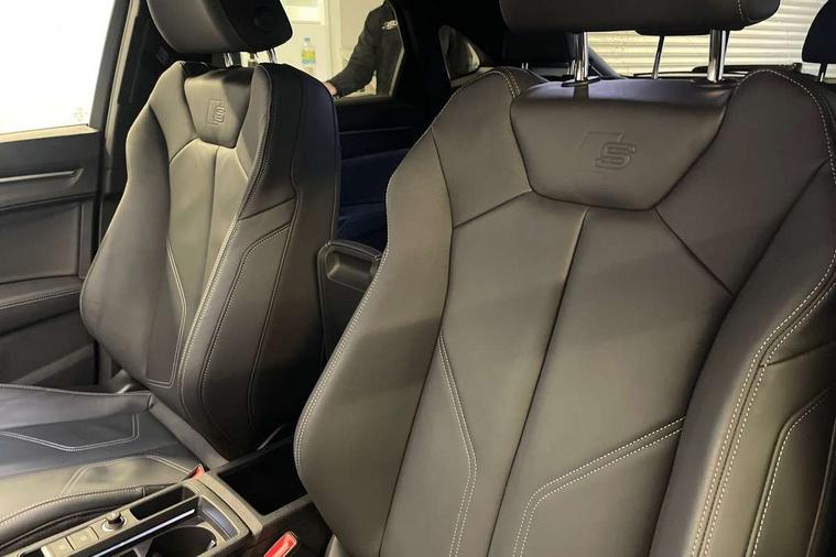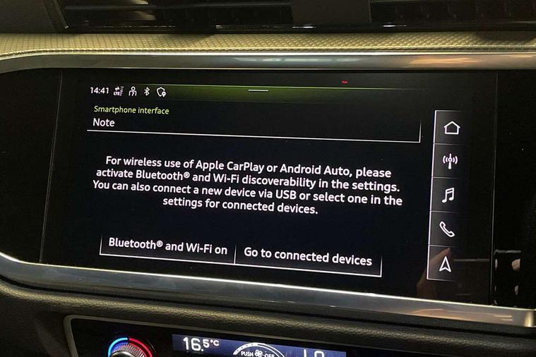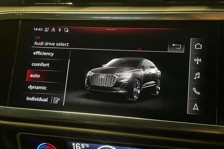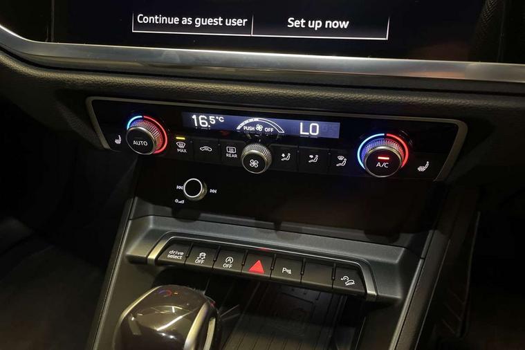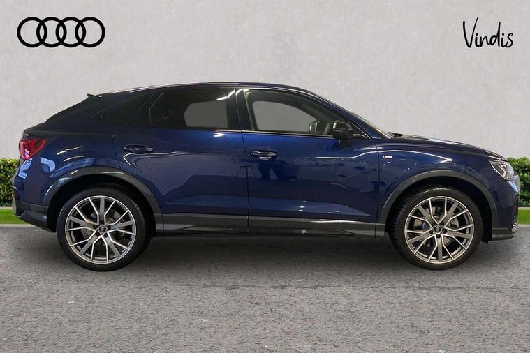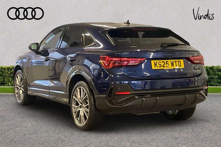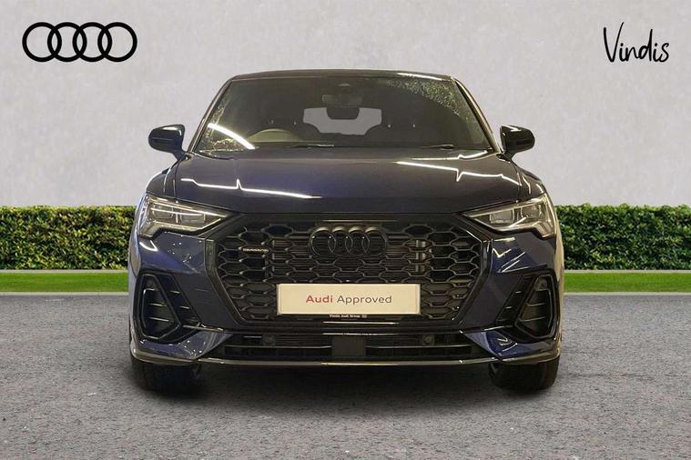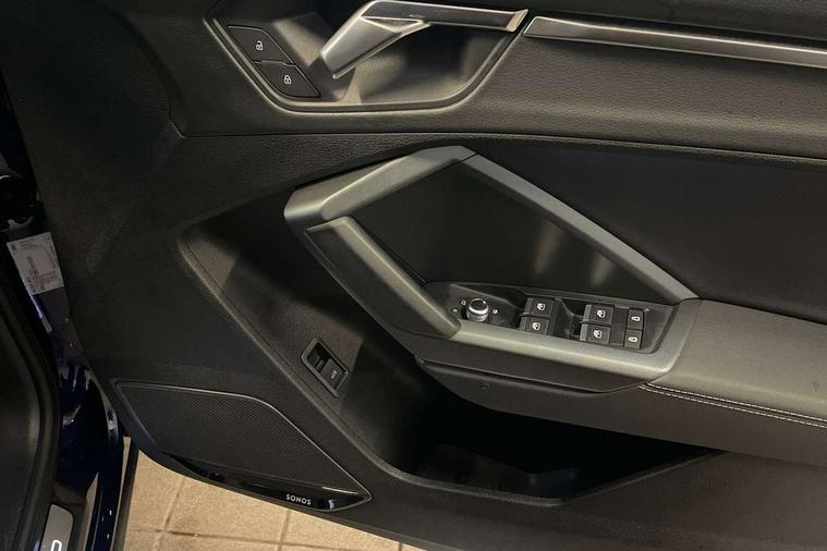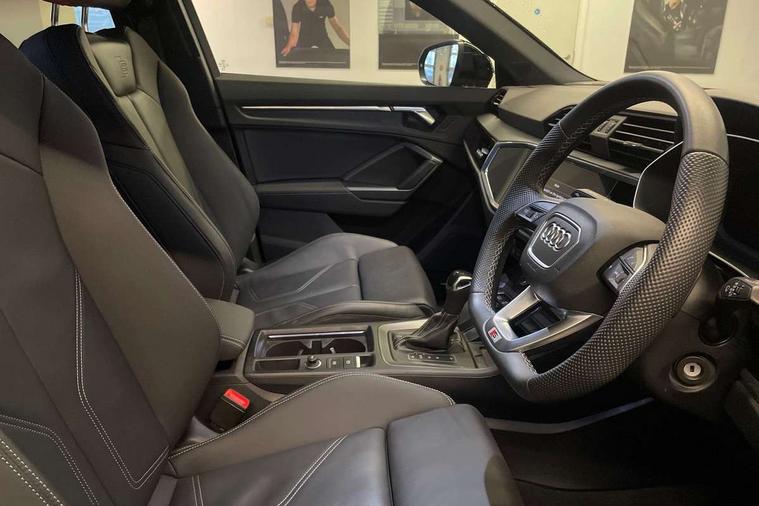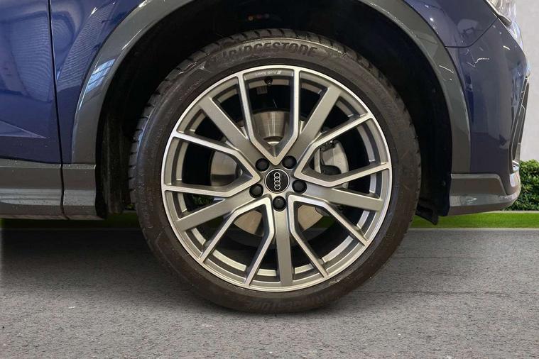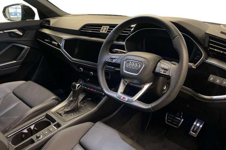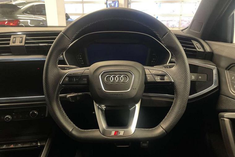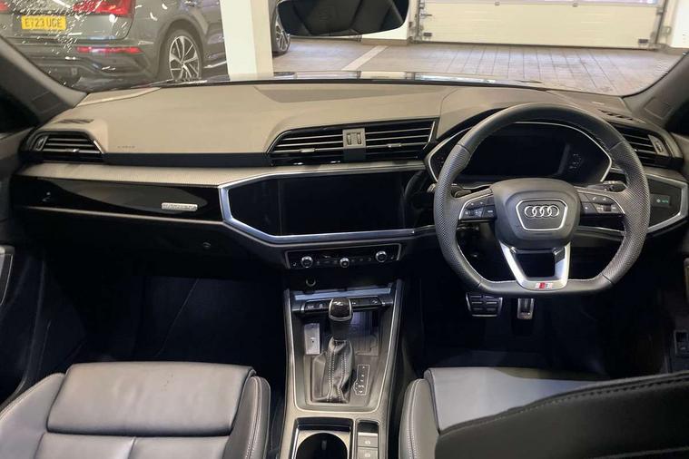 Audi connect safety and service, Audi drive select, Audi lane departure warning, Audi Virtual Cockpit - 10.25" display, Bluetooth interface, Camera based traffic sign recognition, Distraction and Fatigue warning, Legal emergency call, MMI Navigation Plus with high resolution 10.1 inch touchscreen colour display, Power operated tailgate, Progressive steering, Service interval indicator, Smartphone interface includes wireless Apple carplay/Android Auto, Start stop system with recuperation, Voice control system with natural language interaction, Diesel particulate filter, Sports suspension, 2 USB-C ports with charge and data functions, 6 passive loudspeakers, DAB digital radio module, Acoustic windscreen, Audi Beam uses LEDs to project the Audi logo onto the ground as you exit your Q3, Auto dimming door mirrors, Auto dimming frameless rear view mirror, Electrically folding, adjustable and heated door mirrors with integrated LED side indicators and kerb view function for passenger side, Front and rear electric windows, Front fog lights, Front underbody protection in manhattan grey paint finish, High gloss black finish B and C pillars, Honeycomb design radiator grille in matt anthracite black, LED Dynamic rear indicators, LED headlights with LED daytime running lights, LED rear lights, LED third brake light, Privacy glass dark tinted rear and rear-side windows (from B-pillar backwards), Rain and light sensors, Rear diffuser grille in grained matt black, Rear diffuser strip in matt anthracite black, Rear side wing doors, Rear underbody protection in matt black, Rear wiper, S line front and rear bumpers and side skirts in contrasting Manhattan grey paint finish, Variable front intermittent wipers, 12V socket in rear centre console, 3 seat bench in 2nd row, 40:20:40 folding with manual adjustment for 60:40 forwards/backwards position and backrest angle, Adjustable rear seat bench/backrest with centre armrest and cupholder, Black carpet mats, Black cloth headlining, Dual zone electronic climate control, Electric lumbar support, Front and rear black floor mats with contrast stitching in rock grey, Front and rear headrests, Front centre armrest, Height and reach adjustable steering wheel, Illuminated door sill trims with S logo, ISOFIX child seat mounting for front passenger with airbag deactivation and outer rear seat including top tether attachment point for outer rear seats, Luggage compartment sill protection in stainless steel, Manual front seats with height adjustment, Perforated leather gearknob, Single front passenger seat, Stainless steel pedals, Twin leather upholstery with front sport seats + S embossing, Black styling pack - Q3, Non smoking pack - Q3, 3x3 point rear seatbelts, 6 airbags - Driver, front passenger, curtain and side windows, Audi pre-sense front with pedestrain and cyclist recognition, Electrically operated child locks on rear doors, Electromechanical parking brake, Electronic stabilisation control including ABS, ASR and EDL, Front seatbelt reminder, Hill descent control, Hill hold assist, Pre sense basic, Seatbelt monitoring, Tyre pressure warning, Warning triangle and first aid kit, Anti theft wheel bolts, Immobiliser, Remote central locking, Thatcham approved category 1 anti theft alarm, Aluminium look interior elements, Detail dashboard around MMI touch colour display in glass look, black with surround in aluminium look, Leatherette door armrest, Piano black inlay,