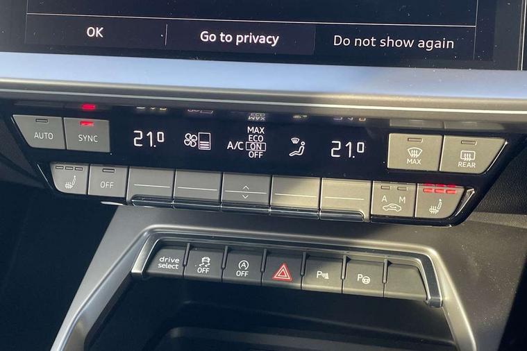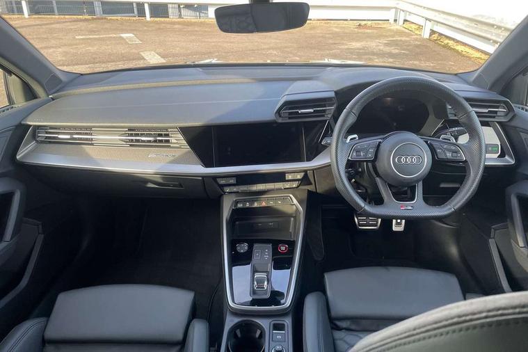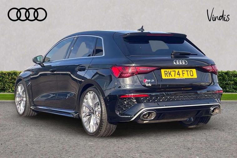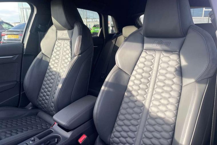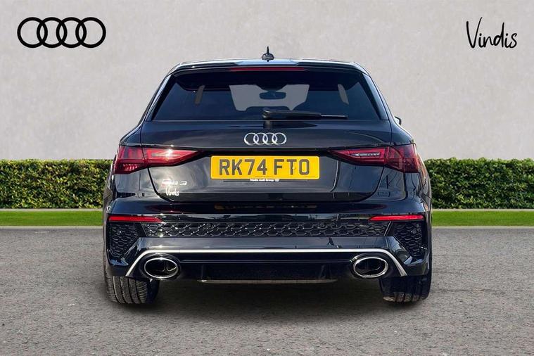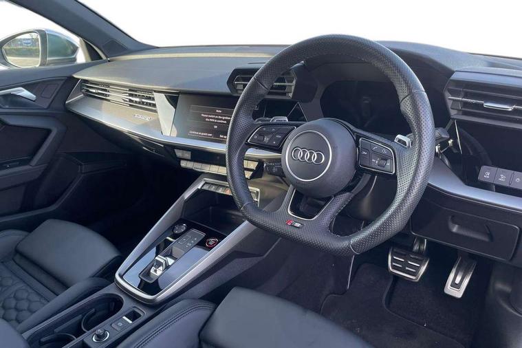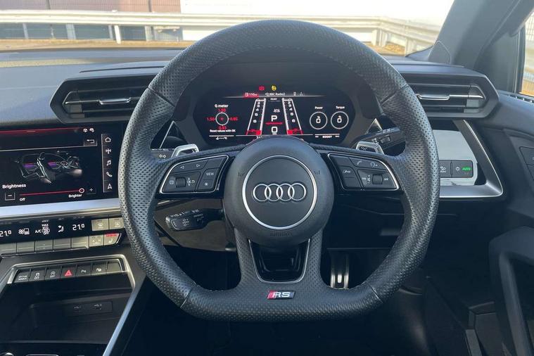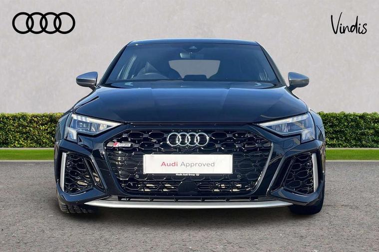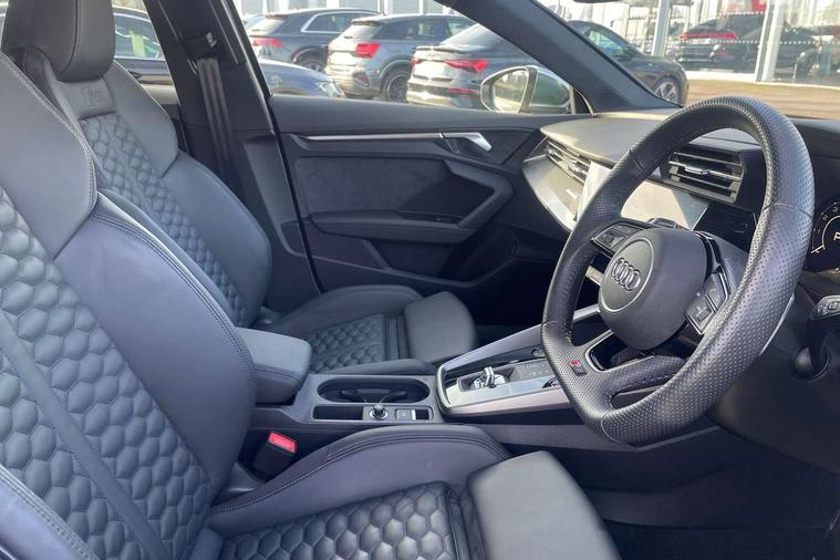 Audi smartphone interface, Audi virtual cockpit with RS specific display 12.3" full colour digital instrument cluster, Automatic start/stop system with recuperation, Bluetooth interface, Collision avoidance assistant, Emergency e-call, Lane departure warning system, Legal emergency call, Manual boot opening, Parking assist with parking system plus, Progressive power assisted steering, Quattro permanent four wheel drive, Rear suspension, Audi sound system impressive sound with 10 loudspeakers including centre speaker and subwoofer, 6-channel amplifier with a total output of 180 watts, DAB Digital radio, 3rd brake light, Acoustic glass windscreen, Audi beam uses LEDs to project the Audi sport logo onto the ground as you exit your RS 3, Auto dimming rear view mirror, Black side skirts, Body colour roof, Daytime running lights, Door mirrors - electrically adjustable, heated, folding and auto dimming on both sides, Headlight washers, LED headlights with LED rear lights + dynamic rear indicators, Light and rain sensors, Matt aluminium door mirrors, Matt aluminium window trims, Privacy glass - dark tinted rear and rear side windows from B-pillar backwards, Rear side wing doors, Rear window wiper and washer system, 3 seat bench in 2nd row, 40/20/40 split folding rear seat bench, Black cloth headlining, Dual zone electronic climate control, Front and rear headrests, Front centre armrest, Front sports seats RS embossed logo, Front/rear floor mats, Heated front seats, Honeycomb stitching and RS embossing, Illuminated door sill trims inlays in aluminium with RS 3 logo, Illuminated vanity mirror, Manually adjustable front seats, RS emblems, Single front passenger seat, Stainless steel pedals and front footrest in black, Aluminium interior elements pack - RS3, Ambient lighting pack - RS3, MMI navigation plus with MMI touch - RS3, RS bodystyling - RS3, Storage Pack - RS3, 3x3 point rear seat belts, ABS/EBD, ASR, Audi pre sense front, Driver/Front Passenger airbags, EDL, ESC - Electronic Stability Control + traction control, Front passenger airbag deactivation, Front side airbags with head airbags and interaction airbag, Hill hold assist, Seat belt reminder with passenger presence detection in rear, Tyre pressure loss indicator, Warning triangle and first aid kit, Anti theft alarm, Anti-theft wheel bolts, Electronically operated child lock, Remote control central locking, Carbon inlays, accent surfaces in the dashboard and centre console in platinum grey silk effect paint finish, 19" 10 Y spoke platinum grey, gloss turned finish alloy wheels, Tool kit, Tyre repair kit,