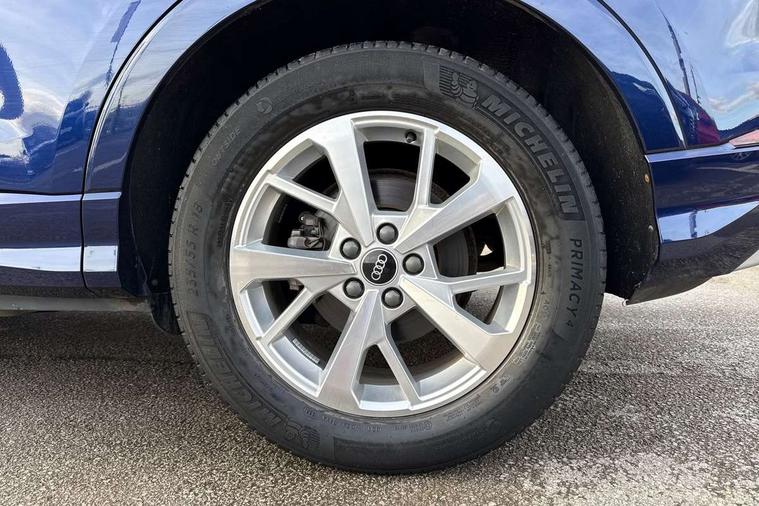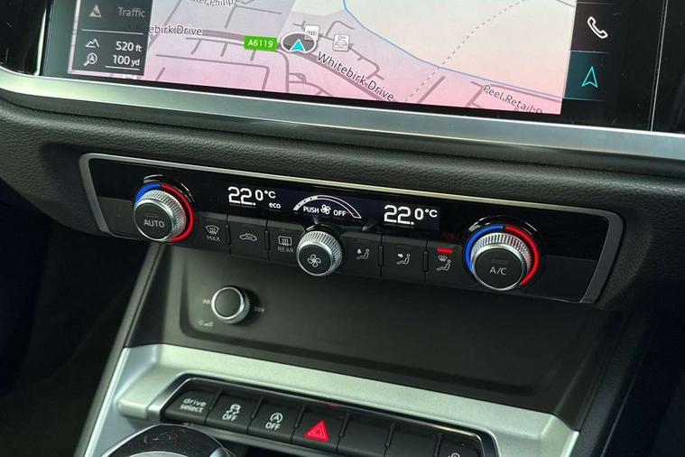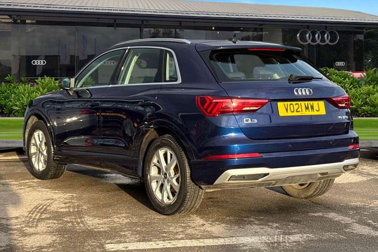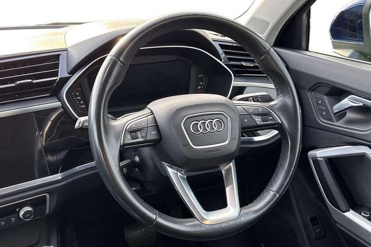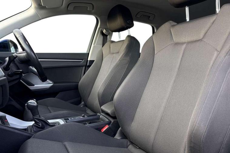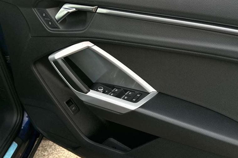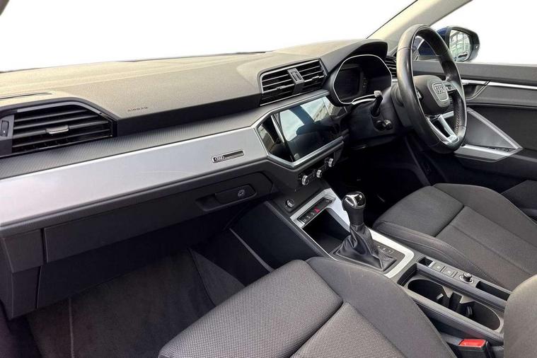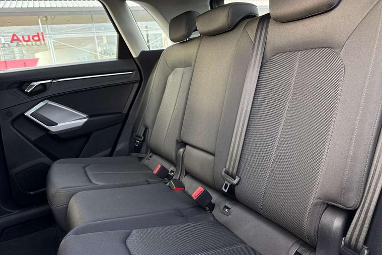 Audi connect safety and service (e-call), Audi drive select, Audi lane departure warning, Audi Virtual Cockpit - 10.25" display, Bluetooth interface, Camera based traffic sign recognition, MMI Navigation Plus with high resolution 10.1 inch touchscreen colour display, Power operated tailgate, Progressive steering, Service interval indicator, Smartphone interface includes wireless Apple carplay/Android Auto, Start stop system with recuperation, Voice control system with natural language interaction, 48V Mild hybrid technology, Standard suspension, 2 USB-C ports with charge and data functions, 6 passive loudspeakers, DAB digital radio module, Acoustic windscreen, Aluminium roof rails, Aluminium window trim, Auto dimming frameless rear view mirror, Body coloured bumpers, Electrically folding, adjustable and heated door mirrors with integrated LED side indicators and kerb view function for passenger side, Front and rear electric windows, Front fog lights, Front side air inlets in matt selenite silver, Front spoiler in matt selenite silver, Grille vertical bars in aluminium silver/Matt, High gloss black finish B and C pillars, LED headlights with LED daytime running lights and dynamic rear indicator, LED rear lights, Rain and light sensors, Rear diffuser strip in matt selenite silver, Silver chrome grille surround, Titanium black radiator grille, 12V socket in rear centre console, 3 spoke multi-function leather steering wheel, 40:20:40 folding with manual adjustment for 60:40 forwards/backwards position and backrest angle, Adjustable rear seat bench/backrest, Aluminium door sill trims, Dual zone electronic climate control, Front and rear floor mats, Front and rear headrests, Front and rear roof module including reading lights, Front centre armrest, Glove compartment lighting, Height and reach adjustable steering wheel, ISOFIX child seat mounting for front passenger with airbag deactivation and outer rear seat including top tether attachment point for outer rear seats, Luggage compartment light, Lunar silver cloth headlining, Manual front seats with height adjustment, Stainless steel luggage compartment sill finisher, Non smoking pack - Q3, 3x3 point rear seatbelts, 6 airbags - Driver, front passenger, curtain and side windows, Audi pre-sense front with pedestrain and cyclist recognition, Electrically operated child locks on rear doors, Electromechanical parking brake, Electronic stabilisation control including ABS, ASR and EDL, Hill descent control, Hill hold assist, Pre sense basic, Seatbelt monitoring, Tyre pressure warning, Warning triangle and first aid kit, Anti theft alarm, Anti theft wheel bolts, Remote central locking, Detail dashboard around MMI touch colour display in glass look, black with surround in aluminium look, Micrometallic silver inlay, Tool kit, Tyre repair kit,