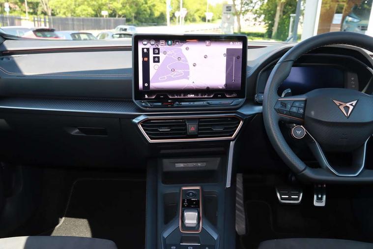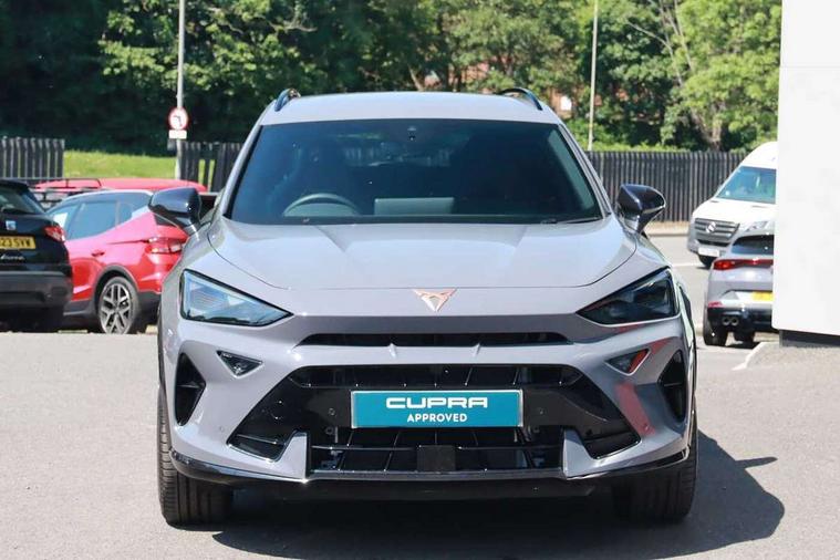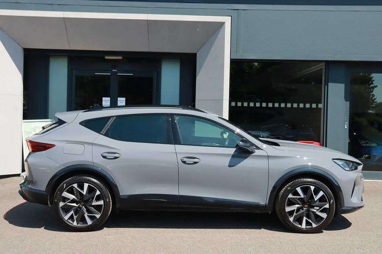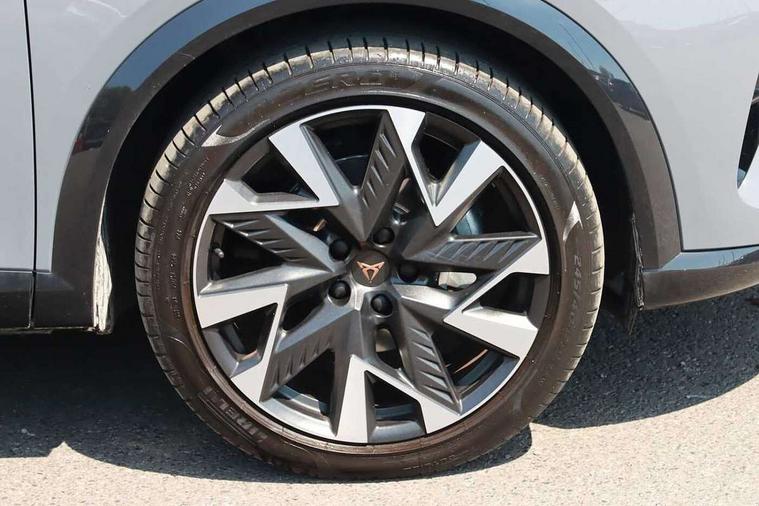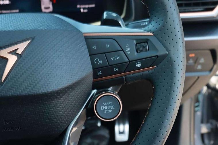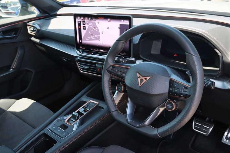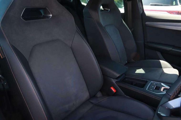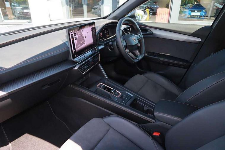 10.25" digital cockpit and configurable dashboard, Adaptive cruise control with follow-to-stop and speed limiter, Advanced driver alert system, Driving profile selection, Dynamic road sign display, Emergency steering support with turn assist, Forward collision warning with automatic braking, Front and rear parking sensors, Full link phone integration, Lane assist, Progressive steering, Rear view camera, RPM, trip computer, outside temp gauge, instrument light brightness, low fuel warning light, lights on reminder, gearshift indicator, Service interval indicator, Start/stop system with regenerative braking, Virtual pedal and electric tailgate, Voice control system, Wired Android Auto, Wireless apple carplay, Wireless phone charger, 10 amp mode 2 charging cable, 32 amp mode 3 charging cable, CUPRA sport suspension, Electronic locking differential and dynamic traction support, 2 front and 2 rear USB type C sockets, Media system with navigation, 12.9" touchscreen display, voice control, DAB, steering wheel mounted controls, Auto dimming rear view mirror, Body colour door handles, Body coloured bumpers, Dark grey wing mirror, Daytime running light with automatic headlight control and coming home feature, Door panel ambient lighting, Dynamic headlight range control, Electric front/rear windows, Electrically adjustable heated and folding door mirrors with memory function, Gloss black roof rails and window surrounds, High beam assist, LED 3rd brake light, LED front fog lamps with cornering function, LED Headlights, LED Taillights with dynamic indicator, Rain sensing wipers, Rear diffuser with copper simulated exhaust pipes, Rear fog lights, Rear side wing doors, Rear wash/wipe, Tinted rear windows, Welcome lights (within exterior mirror housing), 12V socket, 2 front and 2 rear reading lights, 3 seat bench in 2nd row, 60/40 split rear bench seat with armrest and mechanical seat release, Black headlining, Black interior roof lining, Cupra sports pedals, Dust/pollen filter, Electrically adjustable driver's seat with memory and lumbar support, Front and rear head restraints, Front centre armrest, Heated front seats, Heated supersports multifunction leather steering wheel with satellite buttons and gear shift paddles, Height/reach adjust steering wheel, Illuminated aluminium doorsteps, Illuminated interior front door sills, Illuminated sunvisor with mirror, Isofix, Leather dashboard, door insert and side trim panel, LED smart wraparound lighting, PVC/Dinamica microfiber upholstery + bucket seats, Satellite steering wheel, Single front passenger seat, Storage pockets on rear of front seats, Three zone climate control with control panel in rear, 3 point seatbelts on all rear seats, ABS, Brake control system - ESC and brake booster, Child proof door locks, Driver and front passenger airbags with front passenger airbag de-activation, Electronic parking brake, Front and rear disc brakes, Front side curtain airbags, Hill hold control, Public e-call, Seat belt reminder for front and rear seats, Tyre pressure monitoring system, Anti theft alarm system, KESSY Advanced - Keyless start, keyless entry with SAFELOCK, Locking wheel bolts, Copper and aluminium interior detailing, 19" Sandstorm machined sport black and silver alloy wheels, Breakdown and tool kit,
