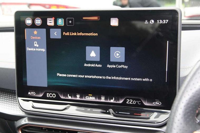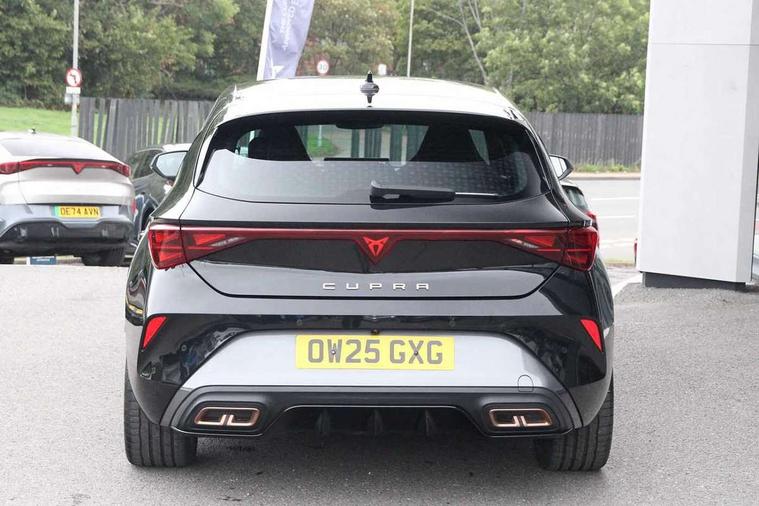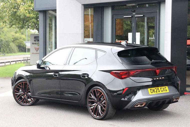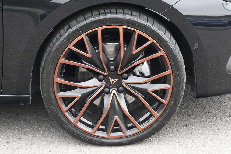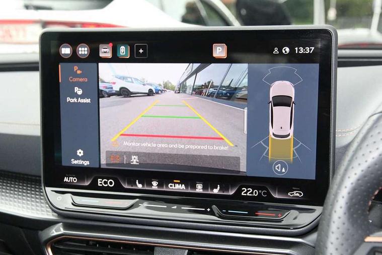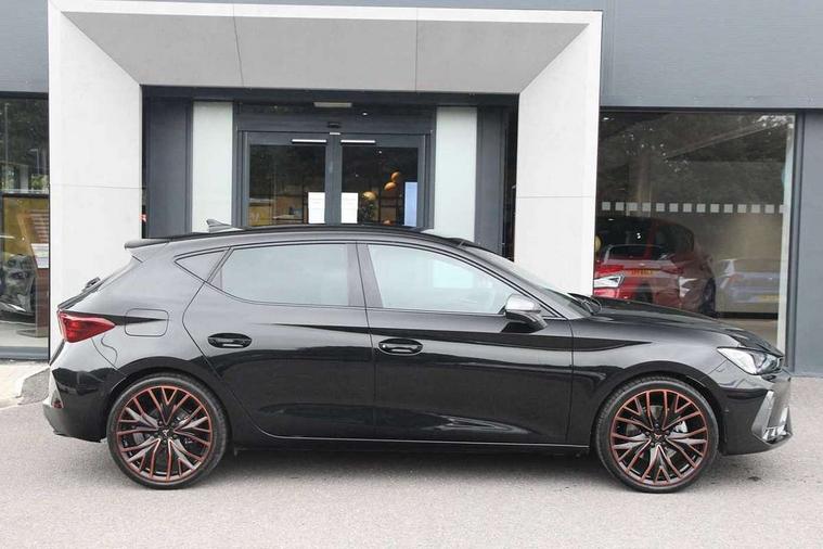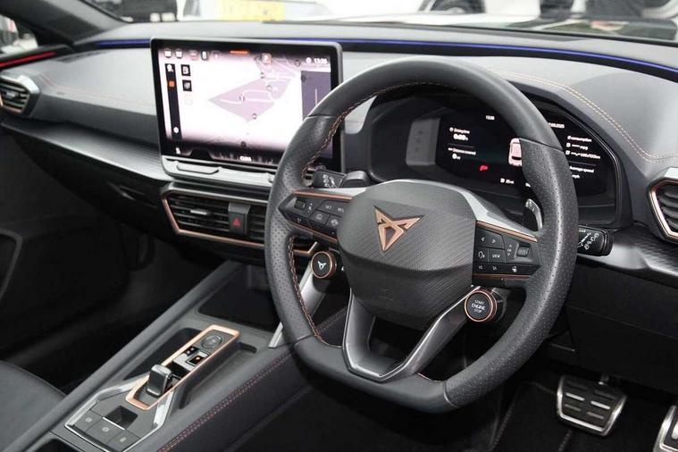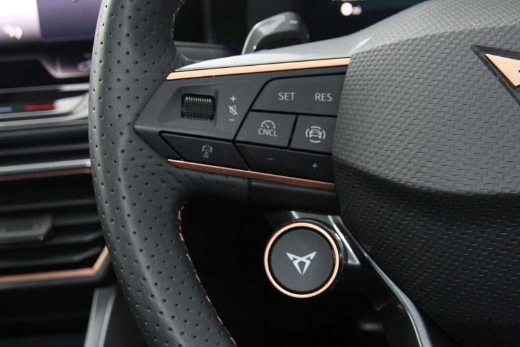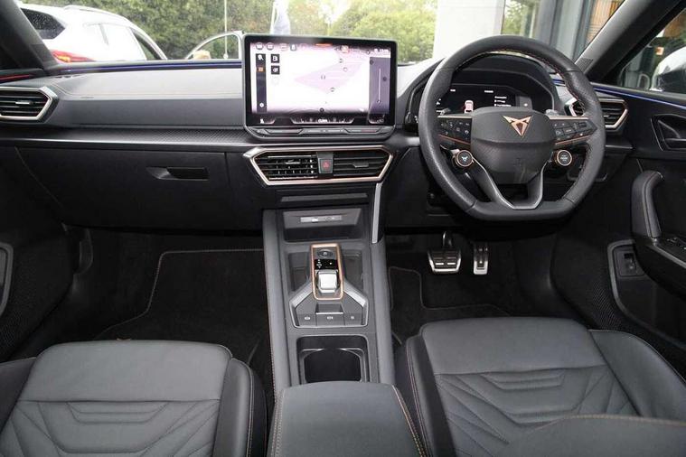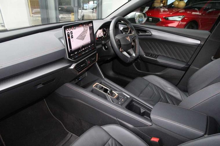 Adaptive cruise control with follow-to-stop and speed limiter, CUPRA drive profile selection with (Comfort/Performance/Individual), throttle response and gearshift mode, Digital cockpit, Driver alert system, Dynamic road sign display, E-call, Front and rear parking sensors, Front assist with forward collision warning braking reaction to vehicles, pedestrians and cyclists, Front cross traffic assist, Full link smartphone integration with Mirror Link, wireless Apple CarPlay and wired Google Android Auto, Intelligent park assist, Lane change assist with emergency assist, Lockable tailgate, Rear view camera, RPM, trip computer, outside temp gauge, instrument light brightness, low fuel warning light, lights on reminder, gearshift indicator, Service interval indicator, Side and exit assist, Start/stop system with regenerative braking, Wireless phone charger, 10 amp mode 2 charging cable, 16 amp mode 3 charging cable, Auxiliary input socket, Auto dimming rear view mirror, Body colour door handles, Body coloured bumpers, Cupra sports bumpers, Dark tinted rear windows, Electric front/rear windows, Electrically adjustable, heated and folding door mirrors, High beam assist, LED front fog lamps with cornering function, LED headlights with dynamic turn signals, tail lights, rear fog lights with rear coast to coast lighting, LED rear fog lamp, Rain sensing wipers, Rear diffuser with copper simulated exhaust pipes, Rear side wing doors, Rear wash/wipe, Separate daytime running light with automatic headlight control and coming home feature, Third brake light, Welcome light with logo projector in door mirrors, 12v power supply in centre console, 3 seat bench in 2nd row, 5 headrests, 60/40 split rear bench seat with armrest, Ambient lighting (glovebox, footwell, ambient lighting multicoloured), Black headlining, Cupra sports pedals, CUPRA Supersports, heated steering wheel with satellite buttons, Electrically adjustable driver seat and lumbar support with memory function + manually adjustable passenger seat, Folding boot cover, Four x USB Type C ports (2 in front and 2 in rear), Front and rear reading lights X 4, Front centre armrest, Heated front seats, Height/reach adjust steering wheel, Illuminated interior front door sills, Interior wraparound lighting, ISOFIX points in outer rear seats with top tether anchorage points, Leather upholstery, Single front passenger seat, Storage pockets on rear of front seats, Sunvisors with illuminated mirror, Three zone climate control, Dynamic and comfort pack - Leon Cupra, Media system plus with 12.9" display + navigation pack - Leon Cupra, 3 point seatbelts on all rear seats, ABS, Brake control system - ESC and brake booster, Child proof door locks, Cupra black brake calipers, Disc brakes in front, Driver and front passenger airbags with front passenger airbag de-activation, front side and curtain airbags, Electronic parking brake, Hill hold control, Pre-crash front and rear seat belt tensioner, window closure and hazard lights, Rear disc brakes, Seat belt reminder for front and rear seats, Tiredness recognition system, Tyre pressure monitoring system, Anti theft alarm system with interior monitoring in cab, backup horn and towing protection, KESSY Advanced - Keyless start, keyless entry, Locking wheel bolts, Chrome and copper interior detailing, Breakdown kit, Tool kit,