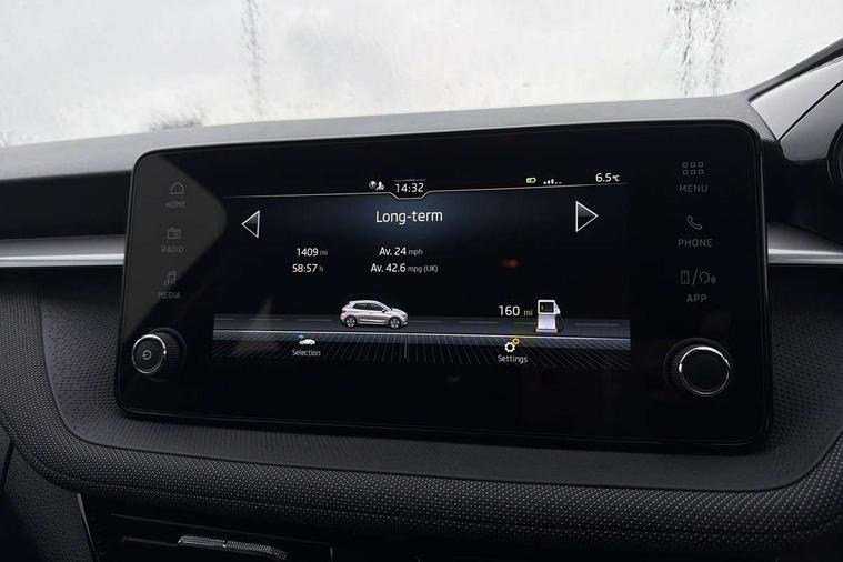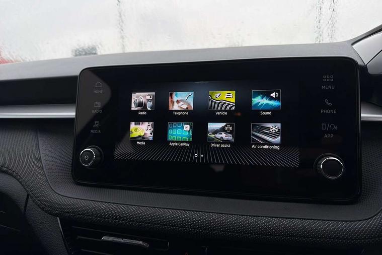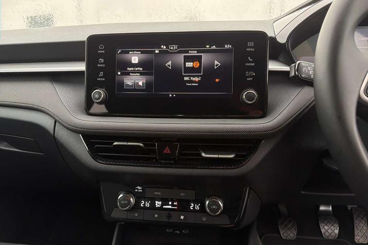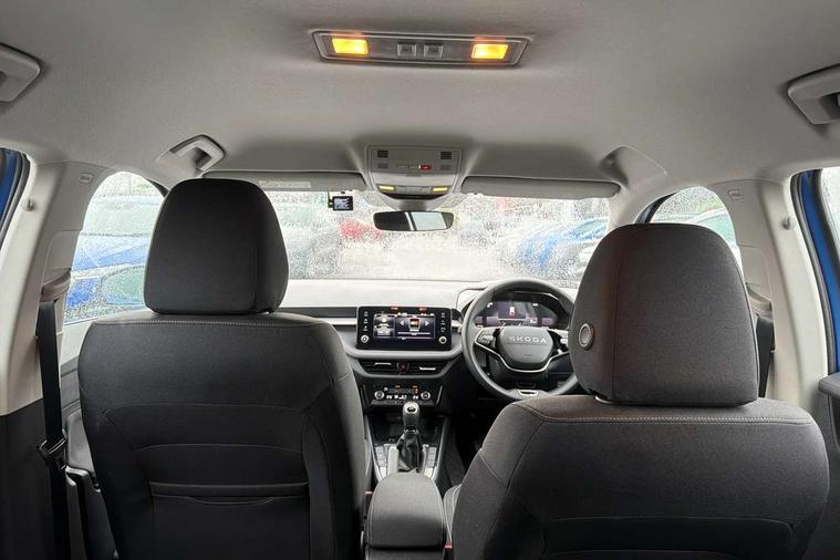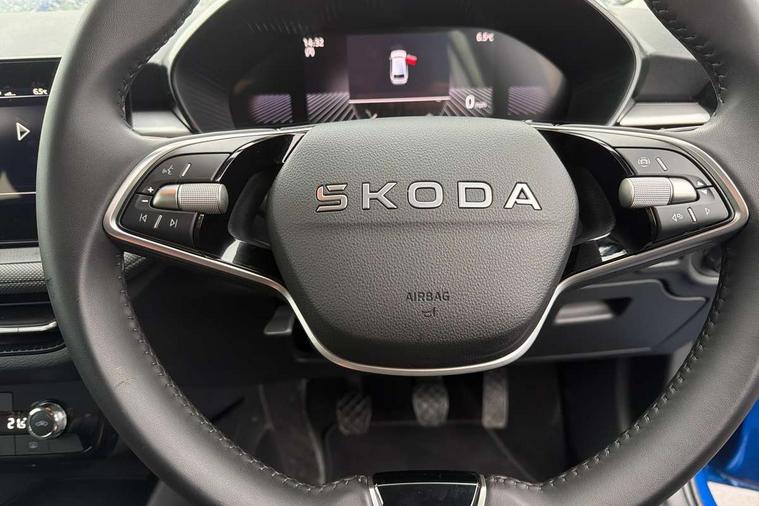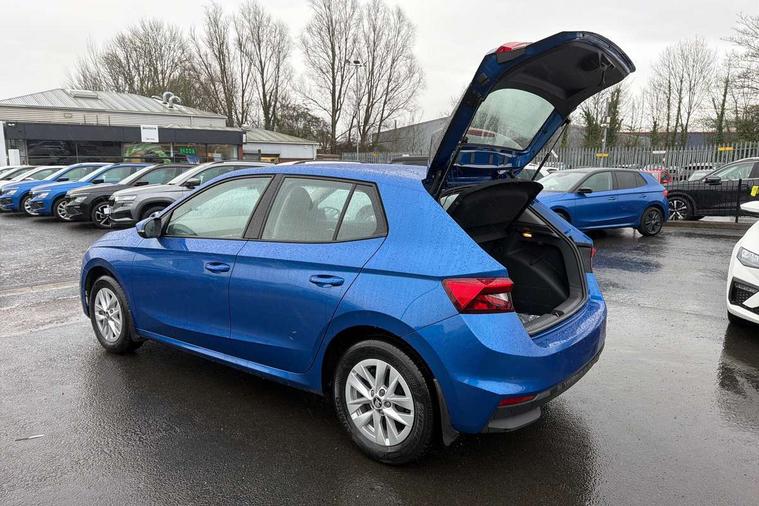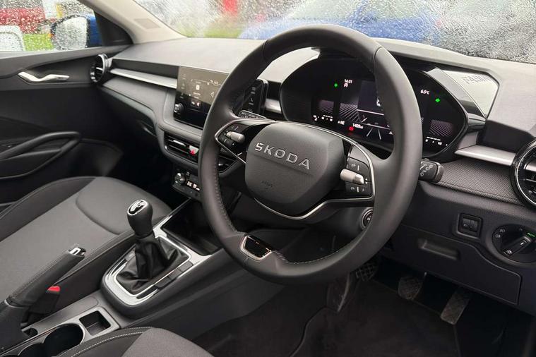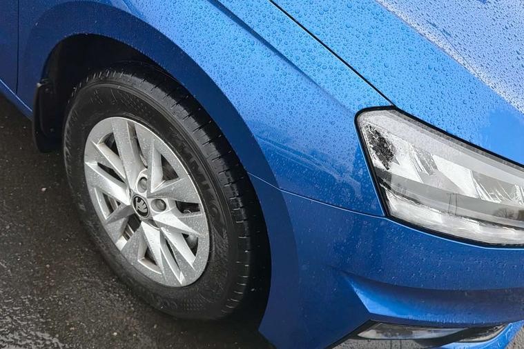 8" Digital instrument display, Advanced driver attention and drowsiness monitor, Bluetooth connection, Driver alert system, Electromechanical power steering, Exterior temperature gauge, Service interval indicator, Traffic sign recognition, Wireless SmartLink for Apple CarPlay and Android Auto, 6 Speakers (4 in front and 2 in rear), 8.25" Skoda infotainment touchscreen display, Auxiliary socket for external MP3 player, DAB digital radio reception, Auto dimming rear view mirror, Body colour door mirrors, Body coloured bumpers, Door mirror integrated indicators, Front and rear electric windows, Front window wiper intermittent control, Headlight range control - Automatic, LED 3rd brake light, LED daytime running lights with coming and leaving home feature, LED rear lights, Rear LED fog light, Rear side wing doors, Rear window wiper with washing nozzles, Roof mounted spoiler, SKODA tailgate lettering in chrome, Unique dark chrome design logo on alloy wheels, 2 reading lights in front and 2 reading lights in rear, 3 rear headrests, Backrest split and folding, Central console with removable cup holder and storage box, Chrome handbrake release button, Dual zone air conditioning with climatronic electronic control, Fabric upholstery, Front centre armrest, Gearshift knob/handle in leather, Grain satin black interior door handles, Hand brake lever handle in leather, Height adjustable front headrests, Height adjustable front seats, Height adjustable steering wheel, ISOFIX and TopTether anchorage points to the outer rear seats, ISOFIX and TopTether on the front passenger seat, Luggage compartment lighting, Manually adjustable lumbar support in front seats, Pollen filter, Rear seat bench unsplit, Single front passenger seat, Skoda lettering on steering wheel, Storm grey headlining, Sun visors with mirror and airbag label on passenger side, Textile floor mats, Ambient lighting pack - Fabia Hatchback, 3-point height adjustable front seats belts with pretensioner and force limiter, Automatic warning lights in case of crash, Driver and passengers airbag with switch off function, e-Call+, ESC including ABS, MSR, ASR, EDS, HBA and XDS, Front and rear seat belt warning, FRONT ASSIST (AEB City and AEB Inter Urban), Front side airbags, Head airbags, One tone horn, Pedestrian protection, Three rear 3-points safety seat belts with pretensioner and force limiter including stop function for outer rear seat belts, Tyre pressure monitoring system, Anti-theft alarm system including immobiliser, interior monitoring, backup horn, and towing protection, Central locking with radio remote control, interior controls, SAFE function and 2 foldable keys, Black painted air vents, Grain satin black central console cover, Metallic grey upper decorative trim, Satin black door and side trim panel in front, Textile Kota grey lower decorative inserts, Anti-theft wheel bolts protection, Super-low rolling resistance tyres,