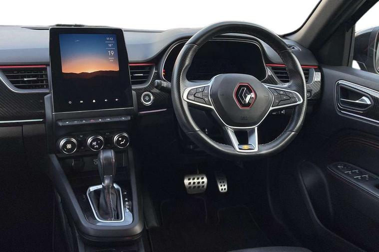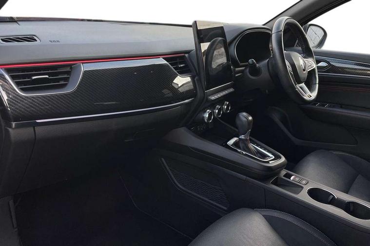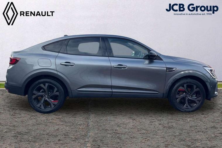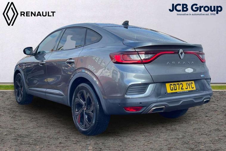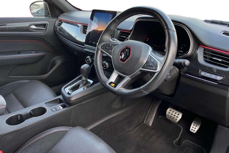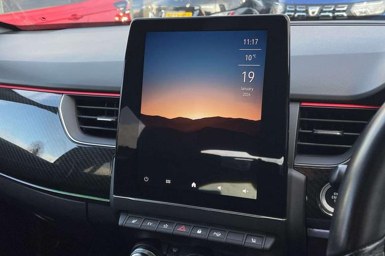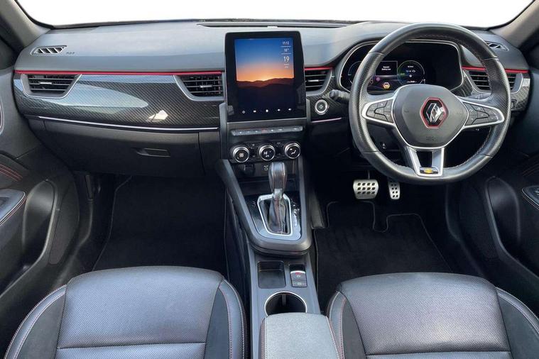 7" TFT Driver information display, Blind spot warning, Bluetooth system, EASY LINK 9.3" portrait touchscreen with navigation, Google search and traffic information, eCall emergency call system, Eco mode, EV button to activate pure mode, Front and rear parking sensors, Gear change indicator, Lane departure warning, Lane keep assist, Multi-sense - 3 driving modes and 8 ambient lighting, Rear cross traffic alert, Rear view camera, Renault automatic emergency assist, Smartphone integration compatible with Apple CarPlay and Android Auto, Traffic sign recognition with over speed prevention, Trip computer, Variable assistance electric power steering, Wireless phone charger, DAB radio, USB port, 3rd brake light, Auto dimming rear view mirror, Automatic headlights, Automatic high / low beam, Automatic windscreen wipers with rain sensor, Black side door protection with gun metal insert, Body coloured bumpers, C-shaped LED front signature lighting, Chrome decopart on wing (fender molding) with R.S. Line badge, Double chromed exhaust tailpipes elements, Extra tinted rear windows and tailgate, Frameless rear view mirror, Front and rear electric windows, Front bumper with F1 blade and honeycomb front grille, Front driver window with one touch facility and anti-pinch function, Front grille with chrome on upper part, Full LED headlights, Glossy black door mirror and lower window lining, Gun Metal front and rear skid plates, Heated rear window, R.S. Line badges on front wing and hatch door, Rain sensor, Rear windscreen wiper, Shiny black shark fin antenna, Side mirrors adjustable electrically, electrically foldable, with defrosting and temperature sensor, automatically foldable at vehicle closure, 3 seat bench in 2nd row, 60:40 split and fixed base rear seats, Aluminium pedals, Automatic climate control with combined filter, humidity sensor and AQS, Black interior roof lining, Carbon style dashboard, Central console with storage, Driver's seat height adjustment, Electrically adjustable front seats, Front and rear head restraints, Height and reach adjustable steering wheel, ISOFIX child seat fixing points on rear outermost seats, LED front and rear roof lights, Passenger seat height adjuster, R.S. line black suede-leather upholstery with red/grey stiching, R.S. Line perforated leather steering wheel with red/black harmony and R.S. Line badge, Rear air vents, Red inserts on air vents, Single front passenger seat, Parking Pack - Hands-free parking & flank protection - Arkana, Winter pack - Arkana, 3x3 point rear seat belts, ABS+EBA, Active emergency braking system, B Brake Mode - One pedal driving with increased regenerative braking, Distance warning alert, Driver airbag, Driver and passenger front and side airbag deactivation, Driver and passenger side airbags, Driver height adjustable seat belt, Electronic parking brake with auto hold, ESC (Electronic Stability Control), Front and rear no seatbelt warning sound, Front curtain airbags, Front head airbags, Hill start assist, Passenger airbag, Tyre pressure warning light, Anti drill door locks and locking fuel cap, Central door locking, Deadlocking system, Hands free keycard with Keyless access and start, RAID (Renault Anti-Intruder Device) automatic door locking, Rear side wing door and window child locking function (front driver door control panel), Superlocking, Thatcham alarm, 18" Silverstone diamond alloy wheels with red inserts,