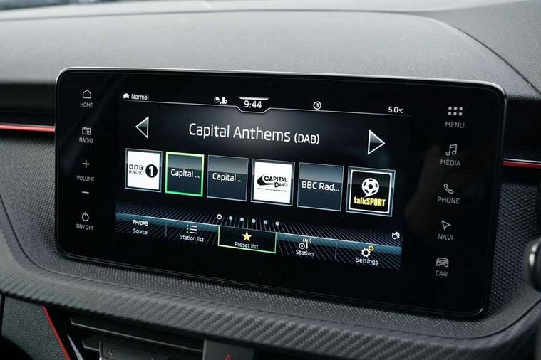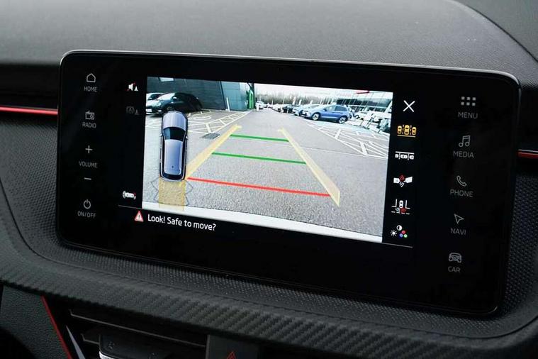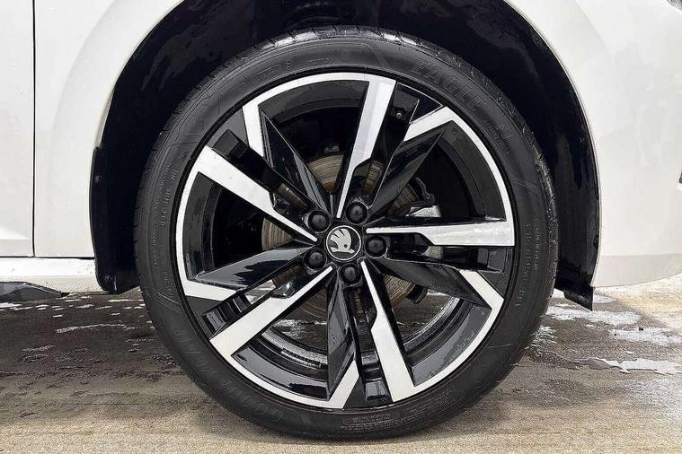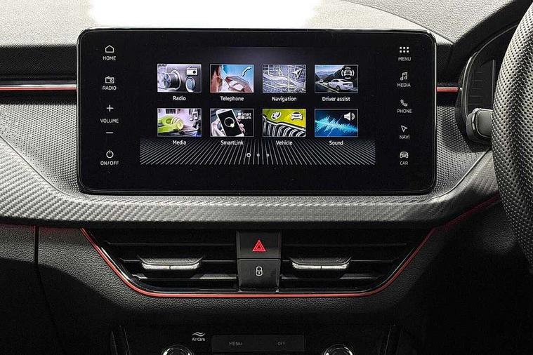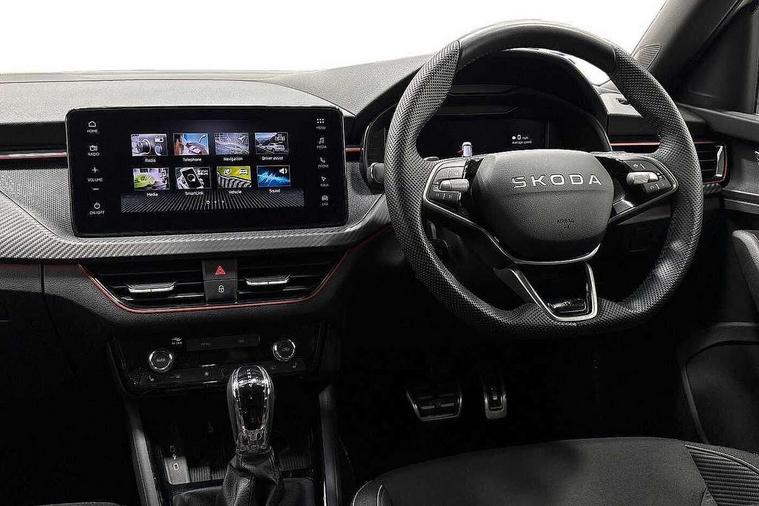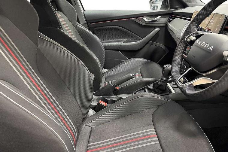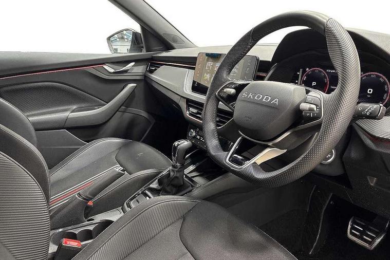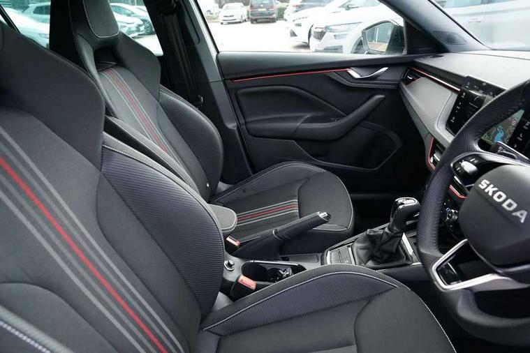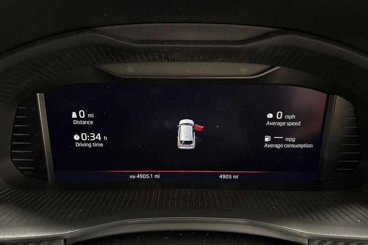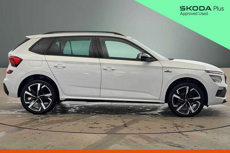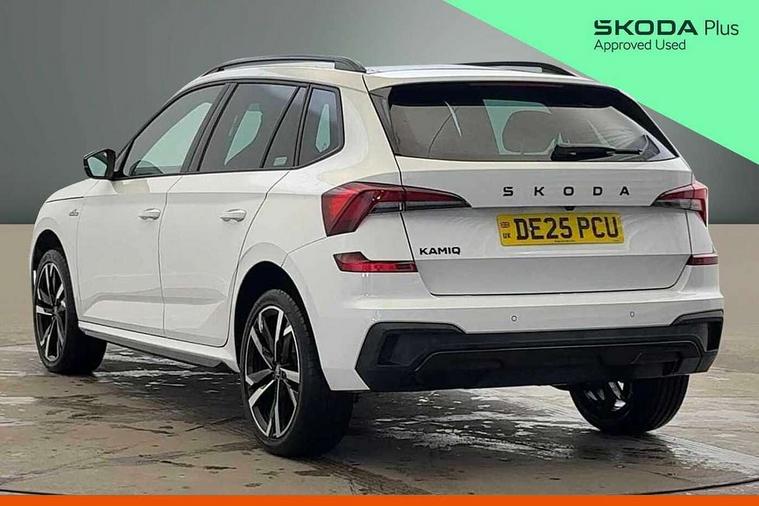 Advanced driver attention and drowsiness monitor, Bluetooth system, E-call, Front assist system, PAS, Rear parking sensors, Rear view camera, Service indicator, Speed limiter, Traffic sign recognition, Virtual cockpit with 10.25" display, Voice control system, Wireless smartlink, 4 USB C ports, 8 Speakers, 9.2" Skoda navigation display, DAB Digital radio, Auto dimming rear view mirror, Automatic headlight control with coming home and leaving home feature, Black door mirrors, Black radiator grille, Black rear diffuser, Black roof spoiler, Body colour bumpers, Body colour door handles, Boot lettering in black, Extended tailgate glass, Fixed panoramic sunroof with black roof rails, Front and rear electric windows, Heated rear window, LED daytime running lights, LED high beam, LED low beam, LED third brake light, Light sensors, Monte carlo plaque, Privacy glass, Rear side wing doors, Rear wiper, Ticket holder inside windscreen, 12V socket in luggage compartment, 3 seat bench in 2nd row, Aluminium pedals, Ambient lighting in white/red, Art leather carbon decor inserts, Art leather carbon door inserts, Black roof lining, Cargo elements, Chrome inner door handles, Driver and passenger sun visors with vanity mirror, Dual zone climate control, Front and rear roof lights, Front centre armrest, Front head restraints, Glove compartment with illumination, Height adjustable driver seat, Height adjustable front passenger seat, Ice scraper, Inner circulation control with pollen filter, ISOFIX on front passenger seat, Isofix preparation for back seats, Leather gearknob and handbrake lever, Manual lumbar support for front seats, Monte Carlo cloth upholstery, Net package and top tether hooks in boot space, Net under rear shelf, Pocket on the back of both front seats include mobile phone pockets, Rake/reach adjustable steering wheel, Reading lights, Rear centre armrests, Red hotstamping, Single front passenger seat, Sports seats, Textile floor mats, Third rear headrest, Top tether for front passenger seat, Umbrella in driver's door, Light and view plus package - Kamiq, 3x3 point rear seatbelts, Airbags - driver and front passenger, Disc brakes, ESP, Extended and predictive pedestrian/cyclist protection, Front passenger airbag deactivation switch, Front side airbags with curtain airbags, Hill hold control, Manual leather parking brake, Manual rear child locks, One tone horn, Seatbelt reminder for driver an co-driver, Traction control, Tyre pressure monitor, Anti-theft alarm system with interior monitoring, backup horn, towing protection and remote central locking with SAFE system, Anti-theft wheel bolts, Electronic engine immobilizer, 18" Ursa black diamond cut alloy wheels,