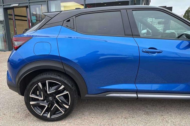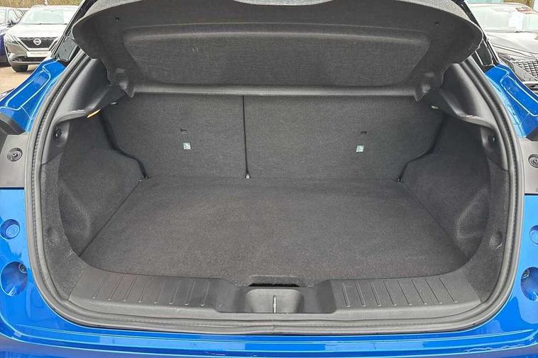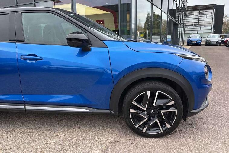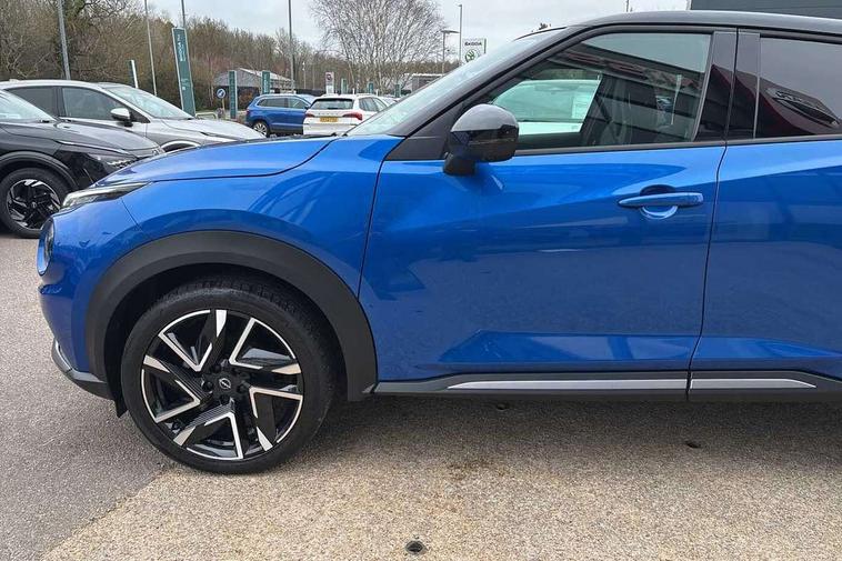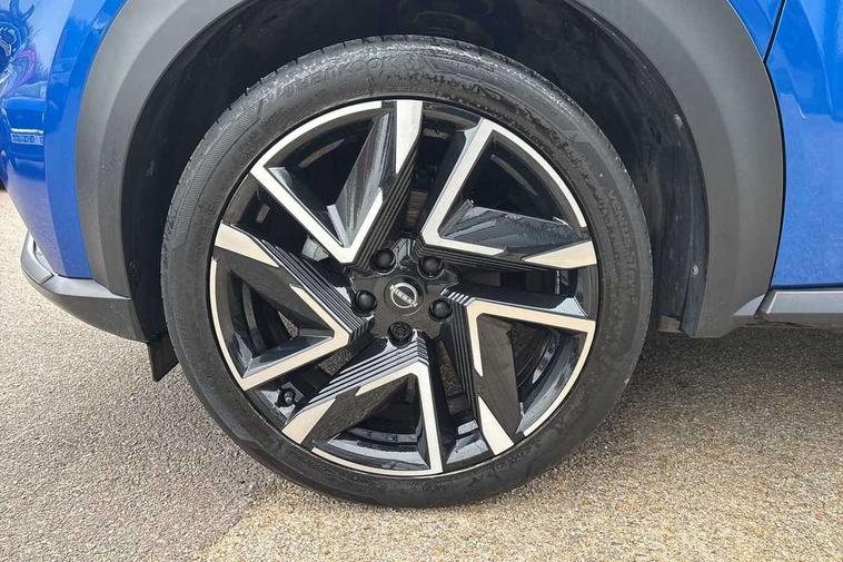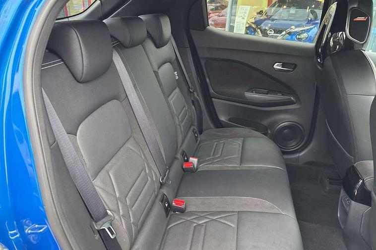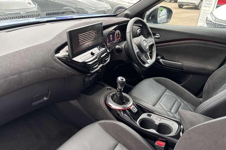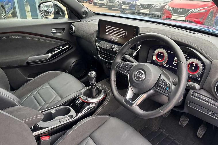 12.3" full colour TFT screen combimeter, Drive modes select (Eco, normal and sport), Emergency and breakdown call, Front parking sensor, Idle start/stop system, Intelligent driver alert system, Intelligent lane intervention, Lane departure warning system, Nissan connect 12.3" touch screen entertainment system, Nissan connect nav with TomTom traffic, Nissan connect services, Outside temperature sensor, Power Steering, Rear parking sensor, Stop/start button, Traffic sign recognition, Trip computer, Voice recognition, WiFi connectivity, Wireless Apple CarPlay and Google Android auto, Wireless Smartphone charger, 10 Bose speakers 6 speakers and 2 headrest speakers for driver/passenger seats, 2 X Rear console USB port, Bluetooth system, USB, Aux-in and 12V socket, Bose personal sound stage control, DAB Digital radio, Auto dimming frameless rear view mirror, Automatic hazard signal with emergency stop signal, Body colour door handles, Electrically adjustable door mirrors with integrated indicators, Follow me home headlights, Front and rear electric window with one touch driver window, Heated and auto folding door mirrors, High beam assist, LED 3rd brake light, LED daytime running lights, LED front fog lights, LED headlamps, LED rear fog lamp, LED rear lamps, One touch passenger window, Rain sensor windscreen wipers, Rear privacy glass, Rear side wing doors, Rear wiper, Roof spoiler, Shark fin roof antenna in solid Black, Three blink turn signal, 3 height adjustable rear headrests, 3 seat bench in 2nd row, 60/40 split folding rear seat, Automatic climate control, Card holder on driver sunvisor, Door ambient lighting, Driver seat back pocket, Driver side rear coat hanger, Driver/passenger sunvisors and vanity mirrors, Front and rear cabin lights, Front armrest, Front door pockets with bottle holders, Front head restraints, Front/rear passenger grab handles, Gear console ambient circle lighting, Height adjustable driver's seat, Internal chrome door handles, Leather gearshift knob, Luggage board, Luggage space lighting, Monoform sporty seats, Multifunction steering wheel, Passenger seat back pocket, Rear door bottle holders, Single front passenger seat, Smooth synthetic leather steering wheel, Synthetic leather kneepad, Telescopic steering wheel adjustment, Two cupholders in front centre console, Two rear isofix child seat anchorage points with top tether, Welcome light and console tray ambient lighting, Advanced safety shield pack - Juke Manual, Heat pack with height adjustable passenger seats - Juke, Interior personalisation pack - Juke, Satin grey exterior personalisation pack - Juke, ABS with EBD and brake assist, Active ride control, Active Trace Control, Driver and passenger airbags, Driver and passenger side airbags, Electric handbrake with auto hold function, Electronic Stability Programme (ESP), Front and rear curtain airbags, Height adjustable seatbelts, Hill start assist, Intelligent emergency braking with pedestrian and cyclist recognition, Rear door child safety locks, Seatbelt reminder for driver/front passenger and rear seats, Three 3 point rear seatbelts, Traction control, Tyre pressure monitoring system, VDC Dynamic Vehicle Control, Alarm, Immobiliser, Intelligent key and start push button with walk away lock and approach unlock functions, Remote central locking, 19" Alloy wheels with deep 3D effect, Tyre puncture repair kit,