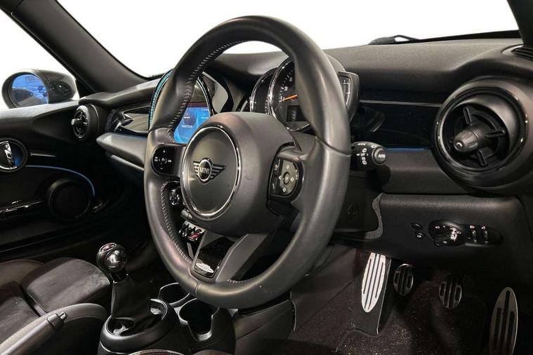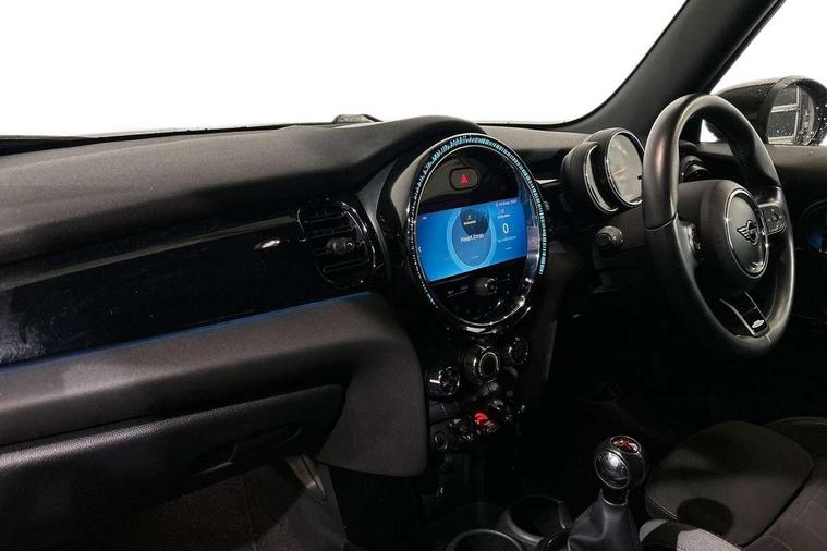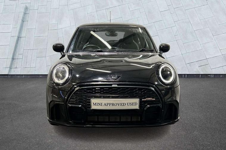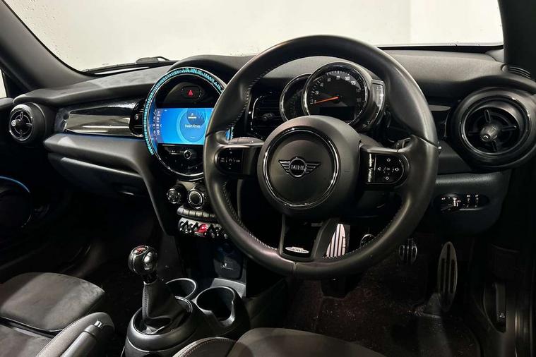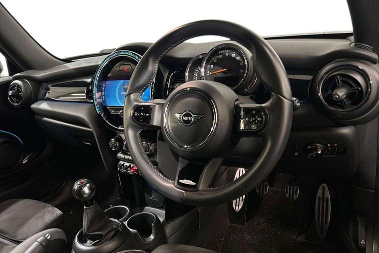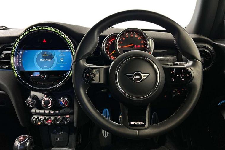 Apple CarPlay, Automatic start/stop function with brake energy recuperation, Compatible mobile phone bluetooth with audio streaming, Cruise control with brake assist, Electro-mechanical speed dependant steering assistance, Flexible car sharing preparation, Instrument cluster, MINI Driving Modes - centre toggle switch to control driving setting (sport, mid and green), Mini E-call, MINI TeleServices, On board computer, Rear park distance control, Service interval indicator, 6 Speed manual transmission including gear change indicator display, Double Vanos system, Fully variable valve control, High precision injection, Intelligent adaptive suspension, Performance Control, 8.8" touchscreen with LED ring, FM tuner and DAB digital radio, 3rd brake light, Automatic headlight activation switch, Body colour fuel filler cap, Chrome border high gloss black slats radiator grille, Dynamic brake lights, Electric front windows, Exhaust tailpipe on left with chrome finisher, Heated rear window, Heated windscreen washer jets, JCW Aerodynamic kit - Front and rear bumpers with sporty JCW styling and part-painted side sills with MINI John Cooper Works door sill finishers, John Cooper Works rear spoiler, LED headlight with closed ring and daytime driving lights, Metal door sill strips with MINI imprint, Model logo Cooper on right of tailgate, Rain sensor window wipers, Rear fog lights, Rear LED lights with union jack design, Rear window wiper, Side scuttle panel with integrated indicator, Sun/heat protection glass, White indicator lenses, 12V Accessory socket in centre console, 2 seat bench in 2nd row, 4 lashing eyes in luggage compartment, 60/40 split folding rear seat, Anthracite headliner including grab handles and clothes hooks, Carbon black colour line - Knee roll and door armrest, Chrome interior highlights, Cupholders, Front and rear isofix with front passenger airbag deactivation, Front floor mats in velour, Glove compartment, Height and length steering column adjustment, Interior lighting with 12 different colours across the dashboard, underneath door bezel with illuminated laser-engraved design on central display, JCW Sport seats with integrated headrests, adjustable thigh support and John Cooper Works logo, Leatherette gearshift lever and handbrake gaiters, LED reading lights, vanity mirror lights, front foot well light and spotlight on front seats, Manual air conditioning, Mechanical seat adjustment - forward/back & backrest for front seats and driver seat height adjust, Multifunction steering wheel, Passenger seat height adjuster, Single front passenger seat, Storage compartments in doors, Sunvisors with vanity mirrors, Walknappa leather steering wheel with grey seam and John Cooper Works badge on Piano Black lower steering wheel spoke, Piano black exterior pack - Mini Hatchback Cooper, 3 point seatbelts on all four seats, 6 Airbags - front, side, head and seat belt tensioners, Anti-lock braking system (ABS), DSC - Dynamic Stability Control, Front and rear disc brakes, Single tone fanfare horn, Tyre pressure monitoring system, Alarm system with tilt sensor, monitoring doors, bonnet interior and tailgate, Electronic vehicle immobiliser, Start/stop toggle with keyless go, Piano black interior trim, Tool kit,