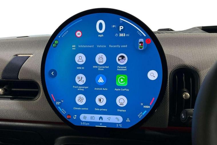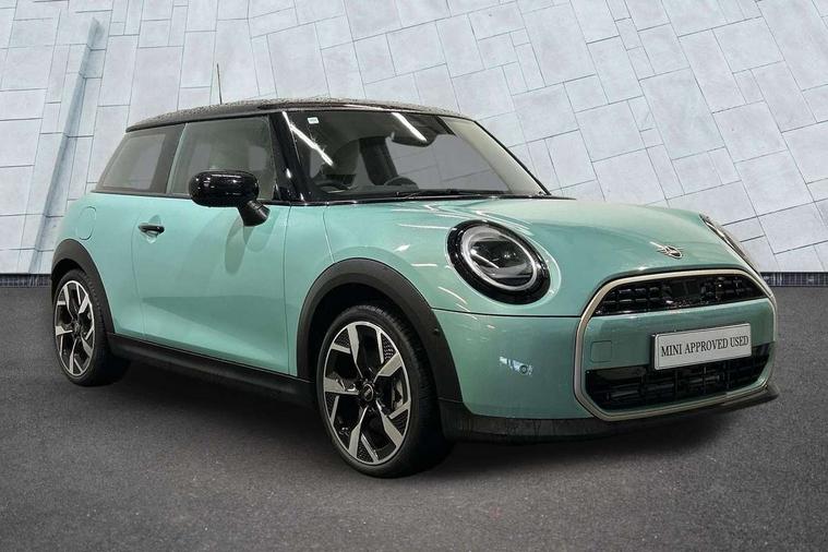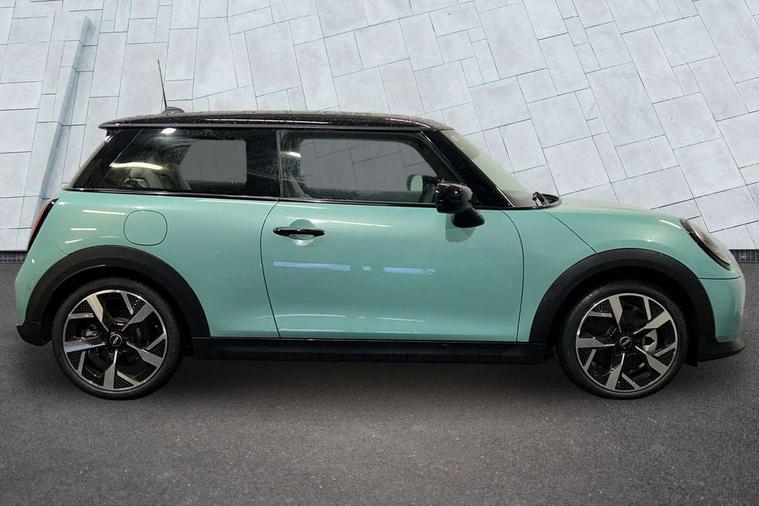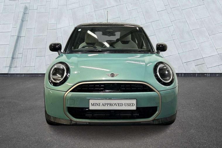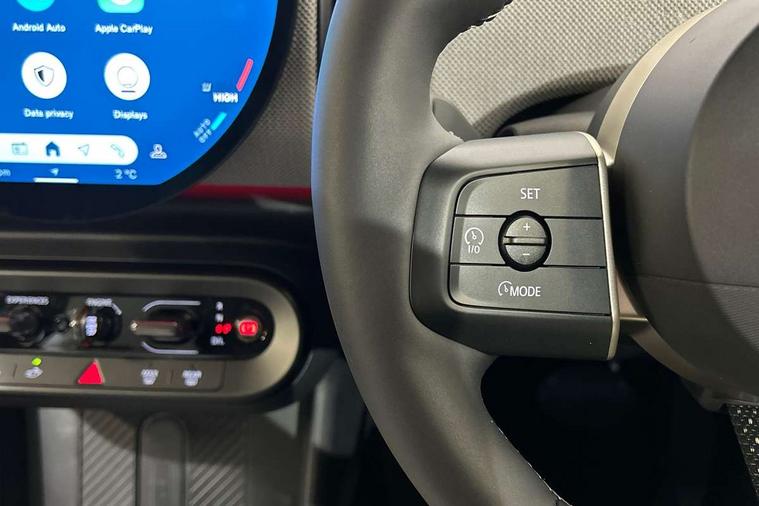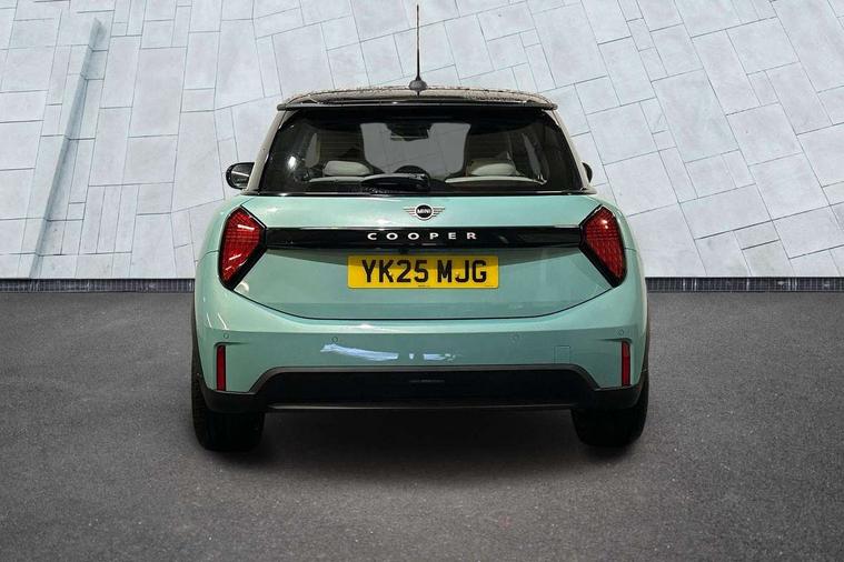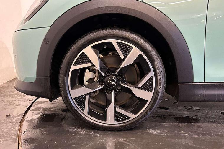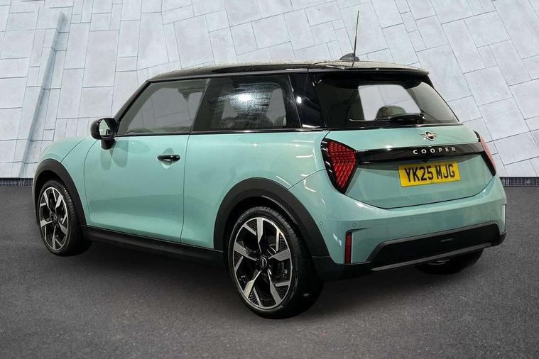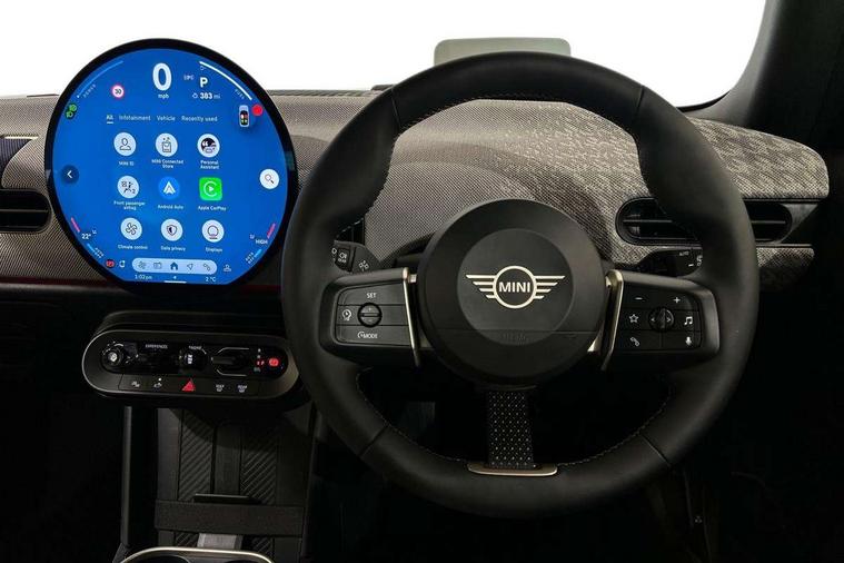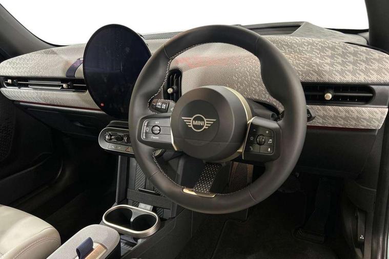Central toggle bar, Circular OLED Screen, Compatible mobile phone bluetooth with audio streaming, Cruise control, Digital instrument cluster, Electro-mechanical speed dependant steering assistance, Emergency call service, Gaming controller with intelligent personal assistant voice update, MINI Experience Modes, Mini navigation system, On board computer, Service interval indicator, Tailgate, 7 speed steptronic transmission with double clutch, DAB Digital radio, Personal eSim, Rear USB charger, Auto headlights, Electric adjustable heated door mirrors, Electric front windows, Heated rear window, Heated windscreen washer jets, LED 3rd brake light, LED daytime running lights, LED Headlights, LED indicator lights, LED rear lights, Logos in Vibrant Silver, Rain sensor window wipers, Rear fog lights, Rear window wiper, Vibrant silver grille surround, 2 seat bench in second row, 2 zone automatic air conditioning, 60/40 rear seat bench, Ambient lighting, Cupholders, Dark headliner, Floor mats, Front and rear head restraints, Front compact armrest, Heated steering wheel, Height adjustable passenger seat, Lidded storage box in grey knit, Luggage compartment lighting, Single front passenger seat, Sport Vescin Steering Wheel black with vibrant silver accents, Sunvisors with vanity mirrors, Vescin synthetic leather upholstery includes dash knit in beige with grey accents, Driving assistant pack - Cooper Hatchback, Park assistant pack - Cooper Hatchback, 3 point seatbelts on all four seats, 6 Airbags - front, side, head and seat belt tensioners, Anti-lock braking system (ABS), DSC - Dynamic Stability Control, Electronic parking brake, Front and rear disc brakes, Front ISOFIX (iSize), Front passenger airbag deactivation, Traction control, Tyre pressure monitoring system, Alarm, Immobiliser, Remote central locking, Blue decorative dash strap, Tyre repair kit,