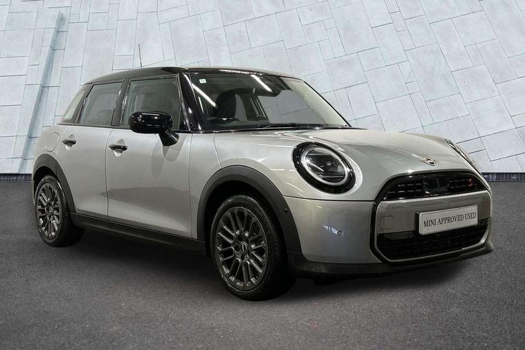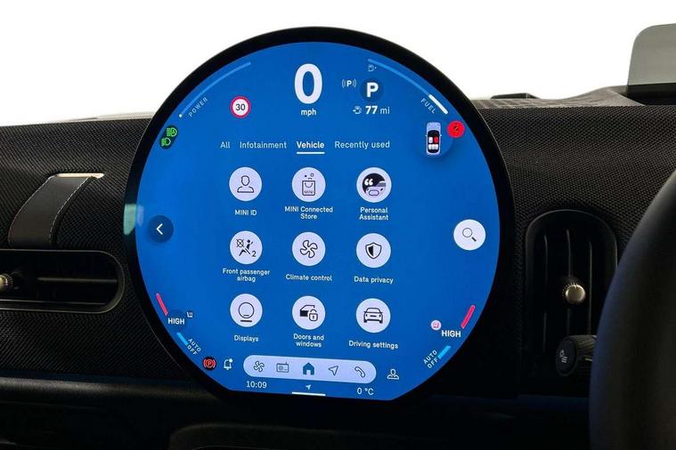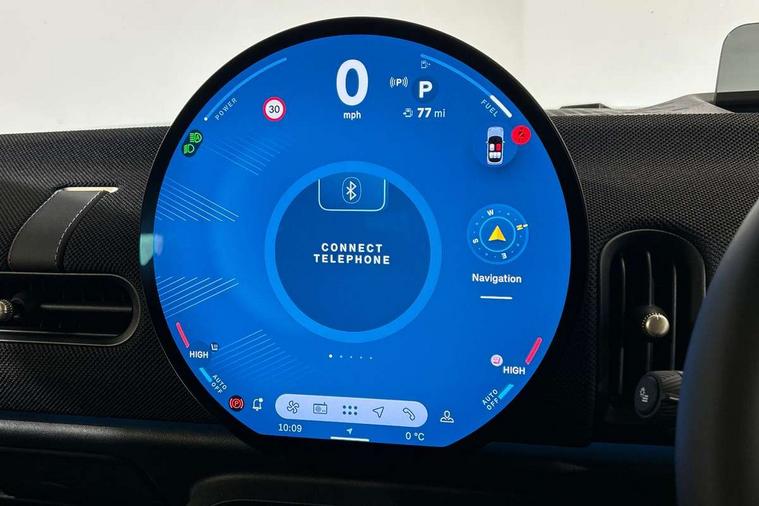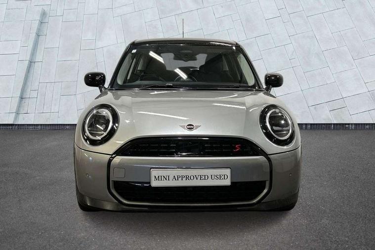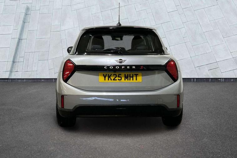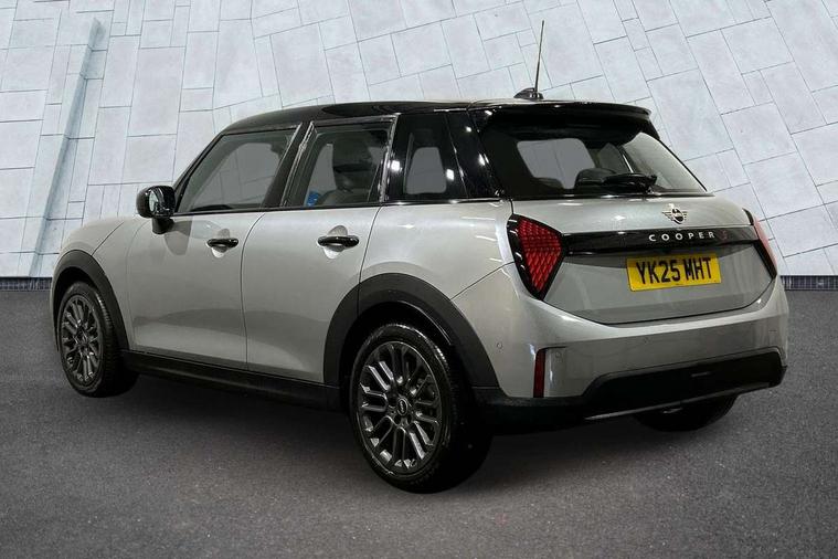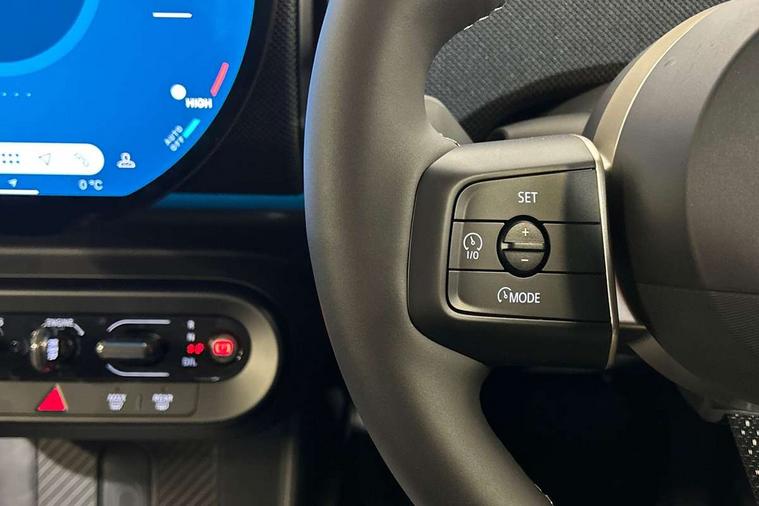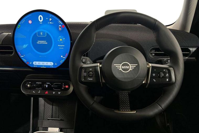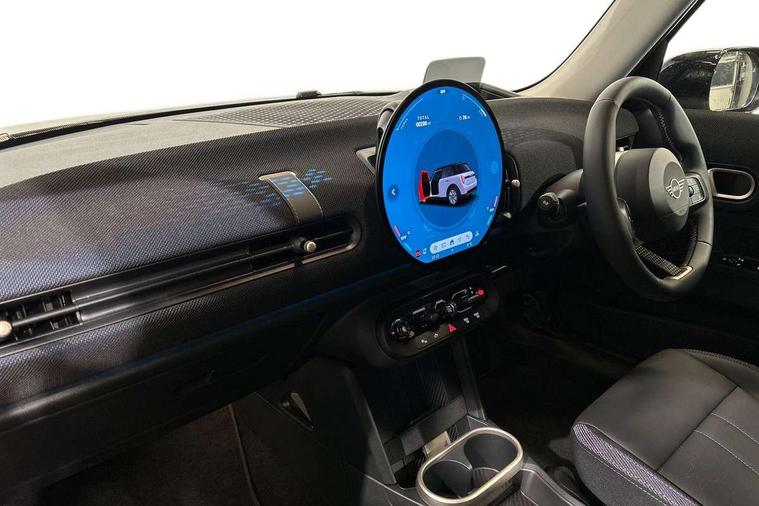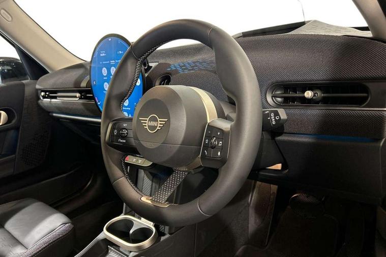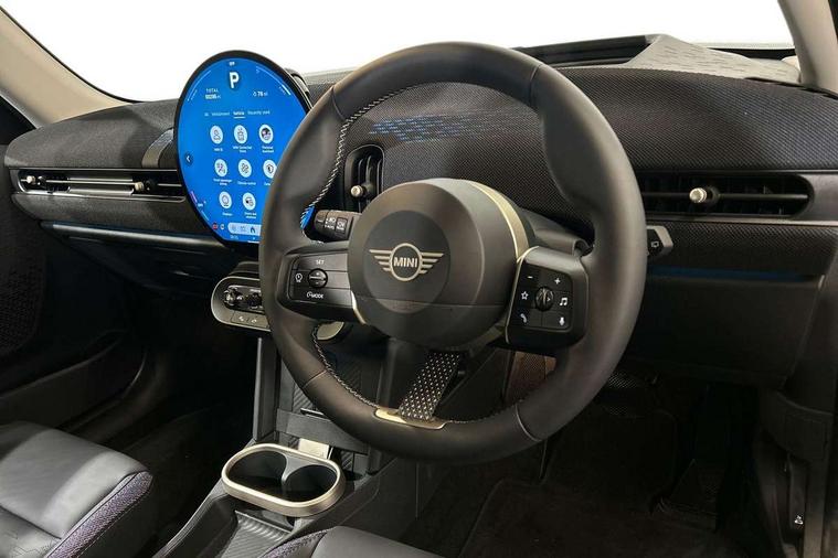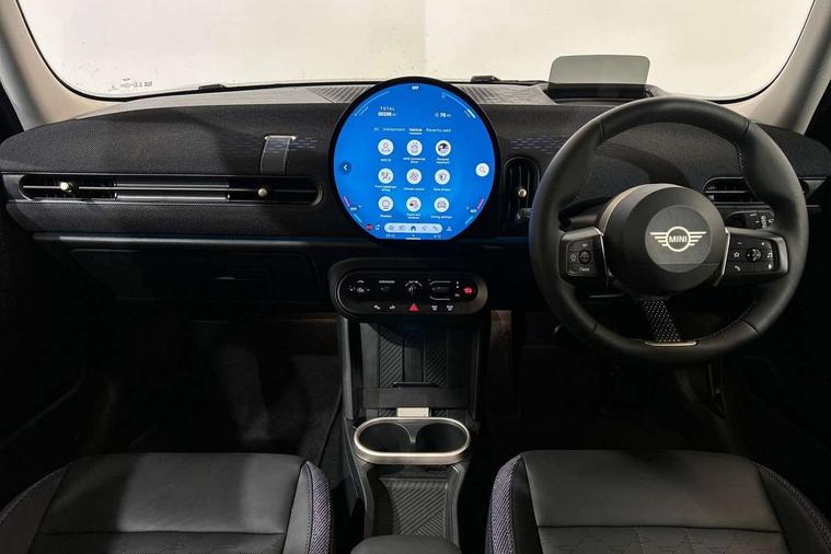 Central toggle bar, Circular OLED Screen, Compatible mobile phone bluetooth with audio streaming, Cruise control, Digital instrument cluster, Electro-mechanical speed dependant steering assistance, Emergency call service, Gaming controller with intelligent personal assistant voice update, MINI Experience Modes, Mini navigation system, On board computer, Service interval indicator, Tailgate, 7 speed steptronic transmission with double clutch, DAB Digital radio, Front USB charger, Personal eSim, Rear USB charger, Adaptable light signatures, Auto headlights, Electric adjustable heated door mirrors, Electric front+rear windows, Heated rear window, Heated windscreen washer jets, LED 3rd brake light, LED daytime running lights, LED indicator lights, LED rear lights, Rain sensor window wipers, Rear fog lights, Rear side wing doors, Rear window wiper, 2 zone automatic air conditioning, 3 seat bench in 2nd row, 60/40 rear seat bench, Ambient lighting, Cupholders, Floor mats, Front and rear head restraints, Front compact armrest, Heated steering wheel, Height adjustable passenger seat, Light headliner, Luggage compartment lighting, Single front passenger seat, Sport Vescin Steering Wheel black with vibrant silver accents, Sunvisors with vanity mirrors, Vescin/Cloth upholstery includes dash knit in black with blue accents, Driving assistant pack - Cooper Hatchback, Level 1 pack - Mini Hatchback, Park assistant pack - Cooper Hatchback, 3 point seatbelts on all five seats, 6 Airbags - front, side, head and seat belt tensioners, Anti-lock braking system (ABS), Child locks on rear doors, DSC - Dynamic Stability Control, Electronic parking brake, Front and rear disc brakes, Front ISOFIX (iSize), Front passenger airbag deactivation, Traction control, Tyre pressure monitoring system, Alarm, Immobiliser, Remote central locking, Tyre repair kit,