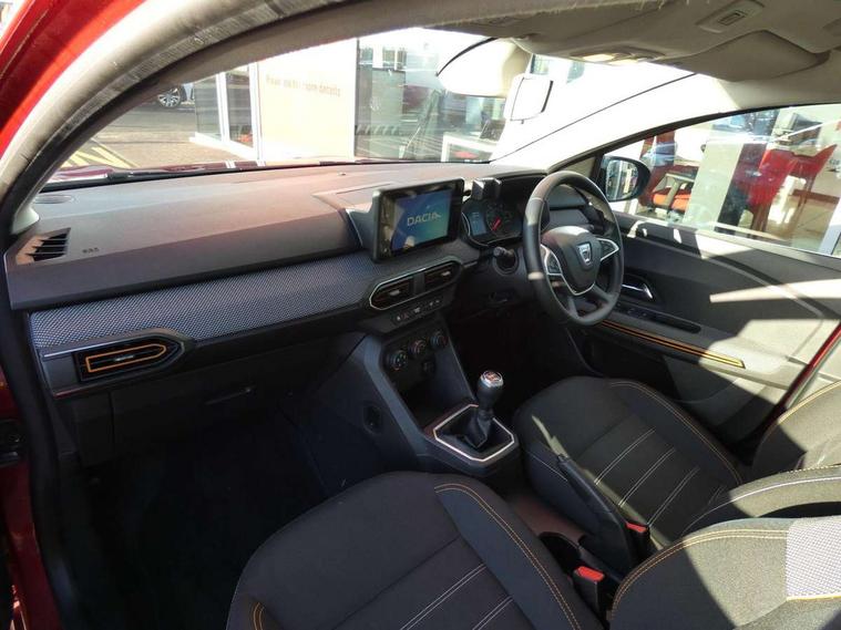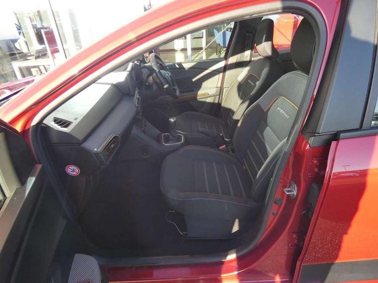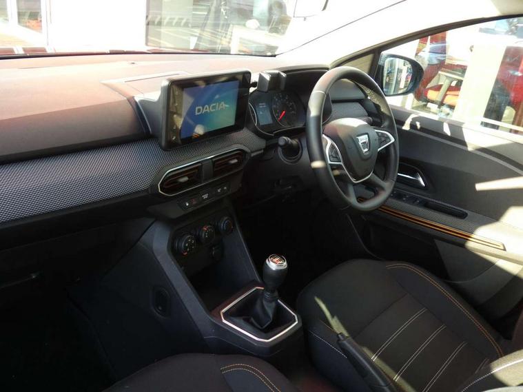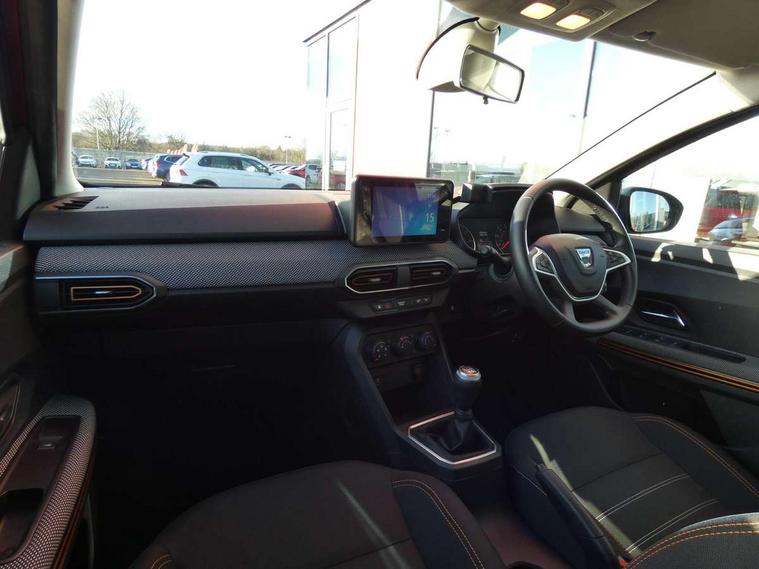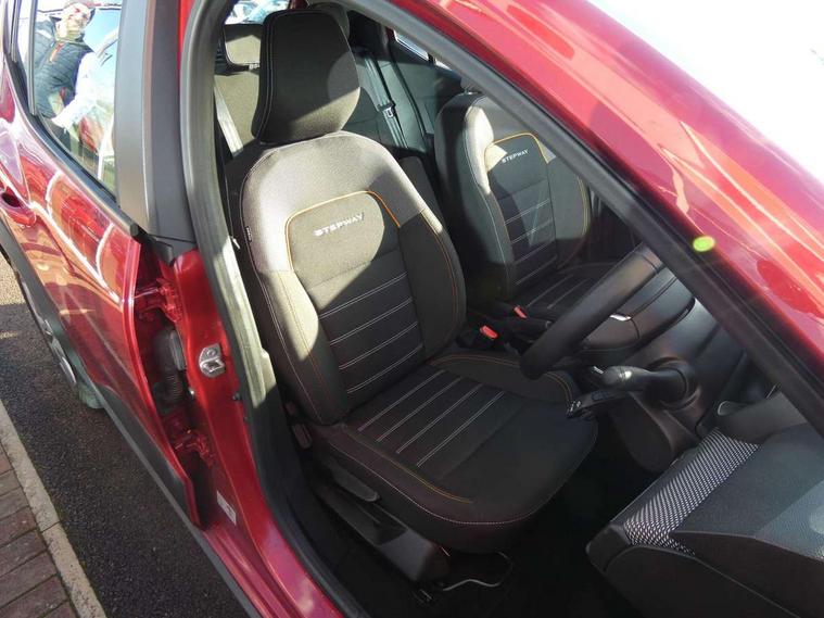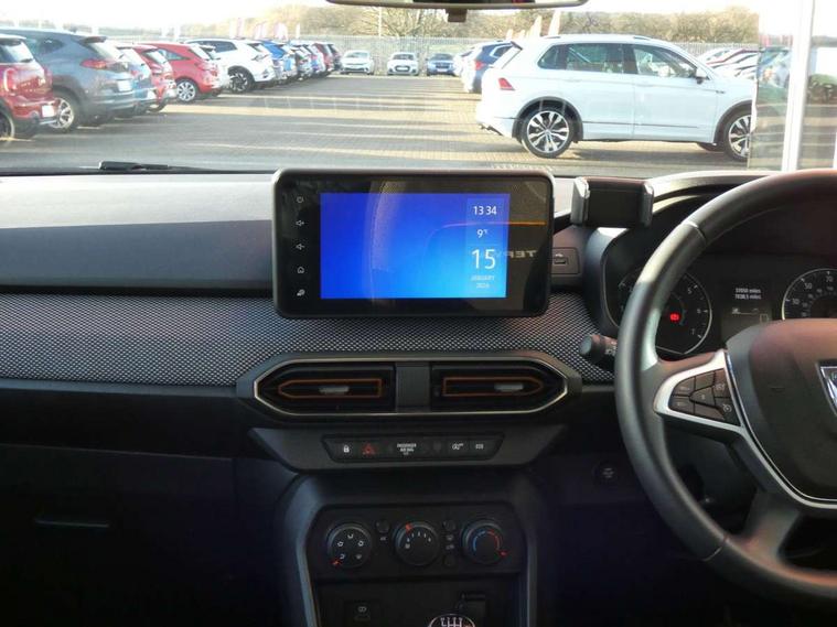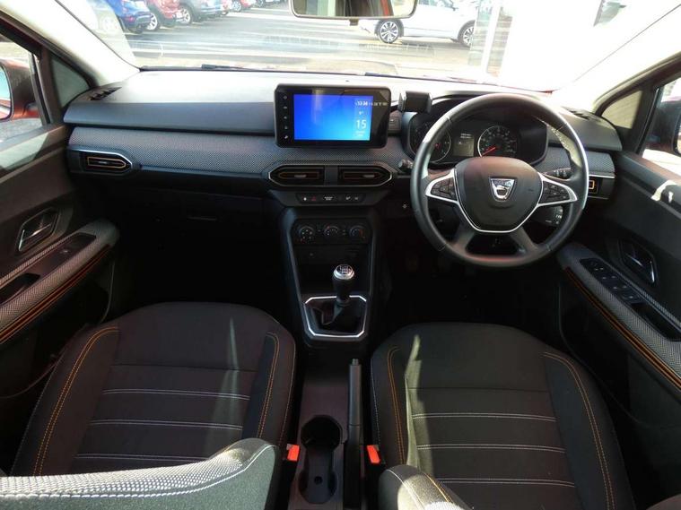 3.5" TFT instrument panel with on-board computer, Cruise control with speed limiter, eCall emergency call system, Eco mode, Electric power assisted steering, Rear parking sensors, Rev counter, Reversing camera, Stop/start system, 8" Media display - DAB radio, smartphone replication, bluetooth, 4 speakers, Apple CarPlay and Android Auto, USB connection for data transfer and charging, USB socket, 3 speed windscreen wipers, Auto lighting, Automatic wipers, Body colour door handles, Body colour door mirrors, Body coloured bumpers, Chrome longitudinal roof bars, Chrome radiator grille, Electrically adjustable and heated door mirrors, Front fog lights, Heated rear window, High level third brake light, LED automatic daytime running lights, LED Y-shape Dacia signature lighting, Modular roof bars, One touch electric front windows, Rear electric windows, Rear wash/wipe, Stepway inscription on radiator grille and roof bars, Tinted windows, 1/3 to 2/3 split folding rear seats, 12 volt front socket, 12 volt rear socket, 3 height adjustable rear headrests, Driver + passenger vanity mirrors, Fabric upholstery, Fixed smartphone holder on dashboard, Front armrest, Gear shift indicator, Height adjustable driver seat, Height adjustable front headrests, Height/depth adjustable steering wheel, Isofix points for child seats in both outer rear seats, Manual air conditioning, Satin chrome interior door handles, Satin Chrome/Copper orange air vents, Soft feel steering wheel, Steering wheel controls, 3x3 point rear seatbelts, ABS and Emergency brake assist, Automatic emergency braking system, Child locks on rear doors, Door open warning, Driver airbag, ESC (Electronic Stability Control), ESP + Hill Start Assist, Front curtain airbags, Front seatbelt pretensioners, Front side airbags, Height adjustable front seatbelts, Passenger airbag, Seatbelt reminder for driver and front passenger, Tyre pressure monitor, Automatic central locking, Immobiliser, Keyless entry, Remote central locking, Decopart on instrument panel and door with textile, 16" Flex wheels with full wheel cap,