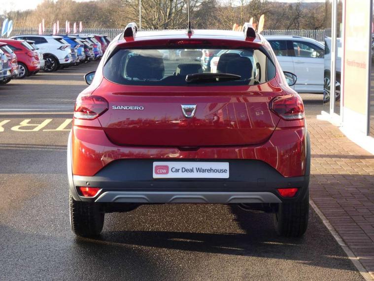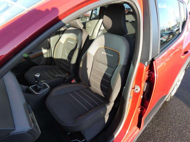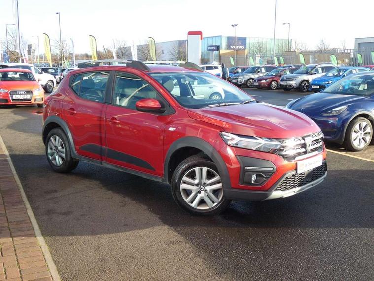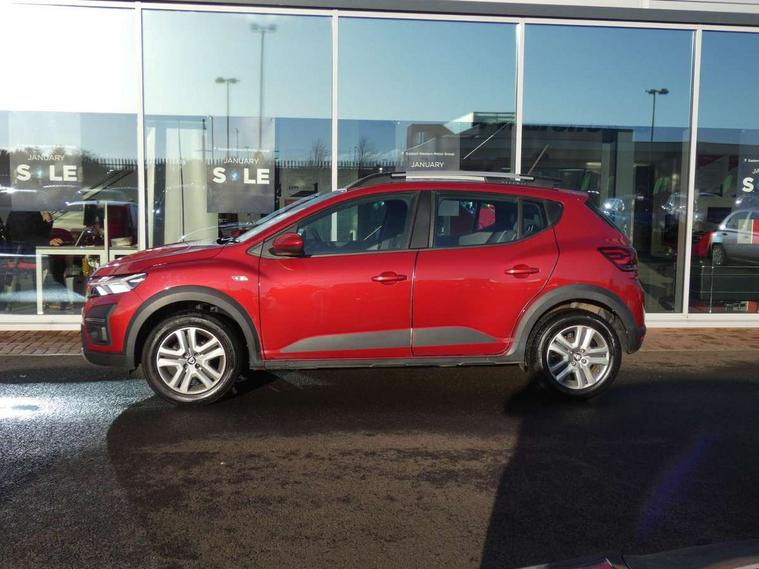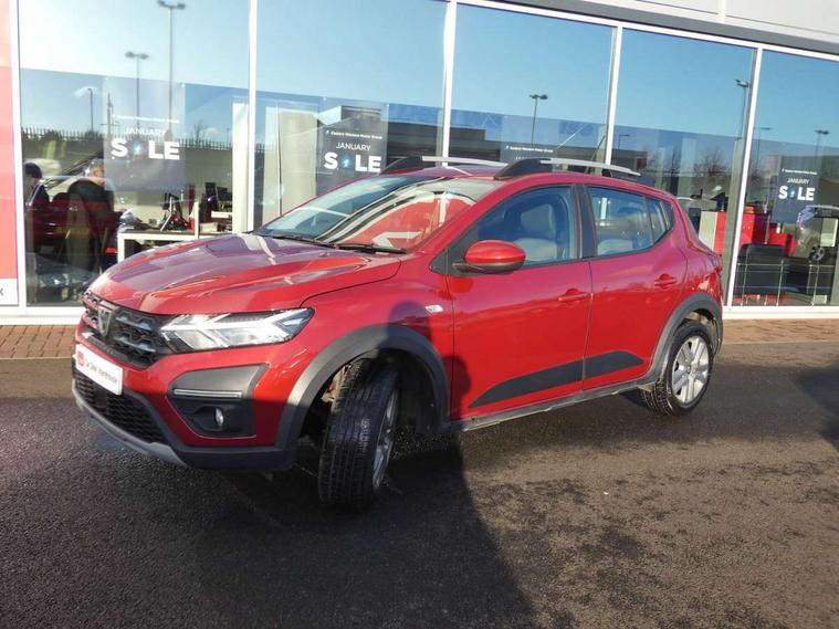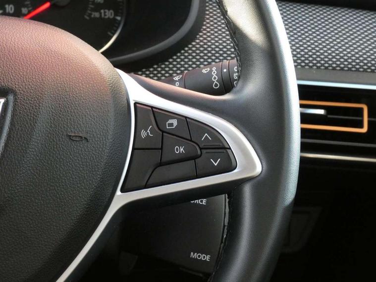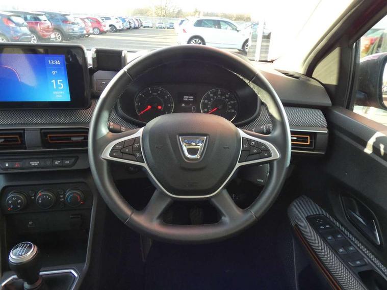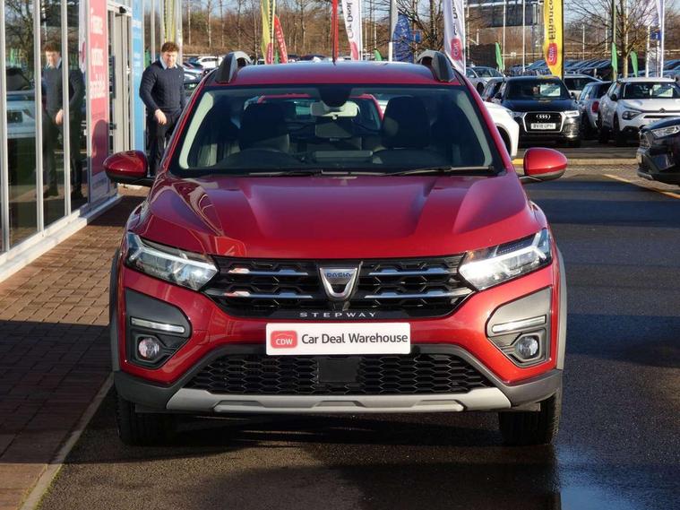 3.5" TFT instrument panel with on-board computer, Cruise control with speed limiter, eCall emergency call system, Eco mode, Electric power assisted steering, Rear parking sensors, Rev counter, Reversing camera, Stop/start system, 8" Media display - DAB radio, smartphone replication, bluetooth, 4 speakers, Apple CarPlay and Android Auto, USB connection for data transfer and charging, USB socket, 3 speed windscreen wipers, Auto lighting, Automatic wipers, Body colour door handles, Body colour door mirrors, Body coloured bumpers, Chrome longitudinal roof bars, Chrome radiator grille, Electrically adjustable and heated door mirrors, Front fog lights, Heated rear window, High level third brake light, LED automatic daytime running lights, LED Y-shape Dacia signature lighting, Modular roof bars, One touch electric front windows, Rear electric windows, Rear wash/wipe, Stepway inscription on radiator grille and roof bars, Tinted windows, 1/3 to 2/3 split folding rear seats, 12 volt front socket, 12 volt rear socket, 3 height adjustable rear headrests, Driver + passenger vanity mirrors, Fabric upholstery, Fixed smartphone holder on dashboard, Front armrest, Gear shift indicator, Height adjustable driver seat, Height adjustable front headrests, Height/depth adjustable steering wheel, Isofix points for child seats in both outer rear seats, Manual air conditioning, Satin chrome interior door handles, Satin Chrome/Copper orange air vents, Soft feel steering wheel, Steering wheel controls, 3x3 point rear seatbelts, ABS and Emergency brake assist, Automatic emergency braking system, Child locks on rear doors, Door open warning, Driver airbag, ESC (Electronic Stability Control), ESP + Hill Start Assist, Front curtain airbags, Front seatbelt pretensioners, Front side airbags, Height adjustable front seatbelts, Passenger airbag, Seatbelt reminder for driver and front passenger, Tyre pressure monitor, Automatic central locking, Immobiliser, Keyless entry, Remote central locking, Decopart on instrument panel and door with textile, 16" Flex wheels with full wheel cap,