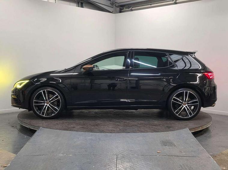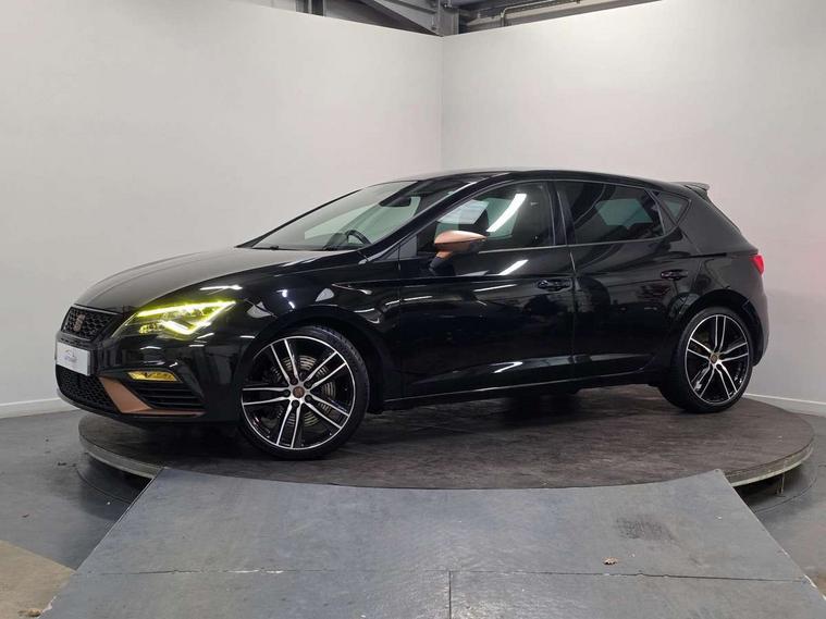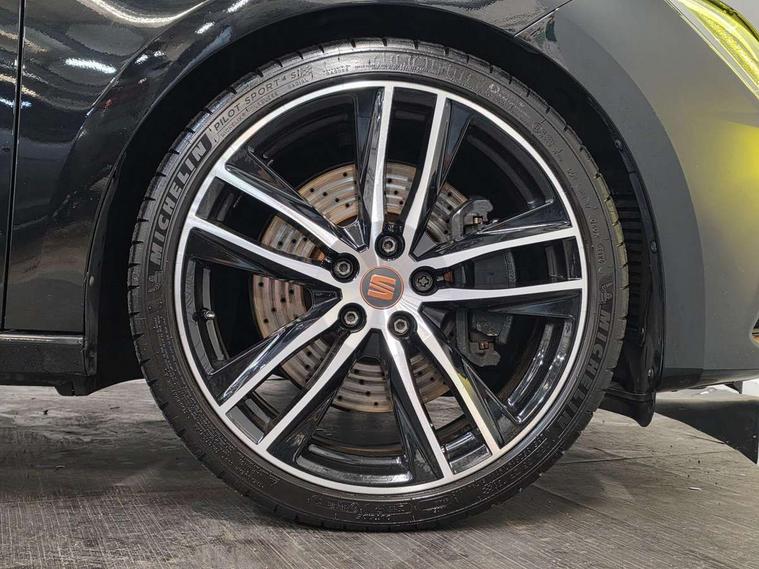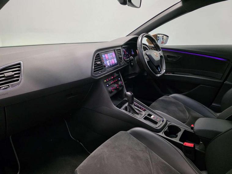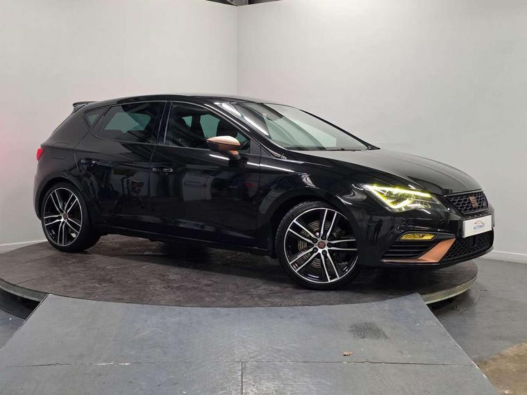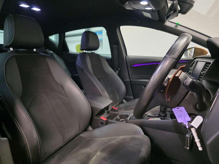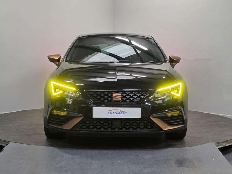 'Lights On' Reminder warning buzzer, 3D map display, 8" touch screen, Bluetooth Handsfree Phone Connection, CUPRA performance interface, Digital cockpit, Electro-mechanical progressive power assisted steering, Front and rear parking sensors, Front assist with pedestrian protection, Full Link Smartphone Integration with Mirror Link, Apple Car Play, Google Android Auto, Low fuel warning light, Navigation system (incl. media system plus), Outside temperature gauge, RPM counter, SEAT Drive profile CUPRA, SEAT logo boot release, Service interval indicator, Trip computer, Voice recognition, Dynamic chassis control, Lowered suspension, Mechanical limited slip differential, XDS electronic differential lock, 2x SD card slot, 4 USB, 8 speakers, Auxiliary input socket, Bluetooth audio streaming, CD player, DAB Digital radio, High resolution colour driver display, Media system plus (incl. media system colour), SEAT USB media cable, Steering wheel mounted audio/phone controls, Black radiator grille, Body colour door handles, Body coloured bumpers, Dark tinted rear windows, Electric front/rear windows, Electrically adjustable door mirrors, Electrically foldable exterior mirrors with parking position and passenger-side mirror with lowering function, Exclusive Cupra front and rear bumpers, Gloss black exterior mirrors with integrated LED indicators, Heated door mirrors, High gloss black finish B and C pillars, High gloss black front grille surround, Illuminated aluminium front door sill with CUPRA logo, LED front fog lights, LED headlights with LED day time running lights + LED rear lights + LED number plate lights, LED rear fog light, Rear wash/wipe, Visible dual exhaust pipes, 12v power point in centre console, 60/40 split folding rear seat with armrest, Active front headrests and 3 rear headrests, Additional heating and ventilation outlet in rear of centre console, Black roof lining, Boot storage net, Cargo rings in boot, Driver and passenger seat height adjust, Driver and passenger sun visor, covered and illuminated mirror, driver sun visor with card holder, Driver seat lumbar adjustment, Dual zone climate control, Dust/pollen filter, Flat bottomed perforated leather steering wheel with white stitching and CUPRA logo, Front adjustable head restraints, Front armrest with storage box, Front cupholders x 2, Front seatback storage pockets, Front sport seats in alcantara, Front/rear floor mats, Gear shift indicator, Height/reach adjust steering wheel, High centre console with integrated box & cup holder, rear air outlet, with armrest in front seats, Illuminated door sills, Instrument lighting with brightness control, Interior copper and black detailing, Luggage tie-down hooks, Multi-colour ambient interior lighting, Passenger seat lumbar adjust, Pedals with Aluminium Cover, Rear top tether child seat ISOFIX attachment, Steering wheel gearshift paddles, Storage box under drivers and passenger seat, 3 point seatbelts on all rear seats, 7 airbags - 2 front, 2 front side, 2 curtain, 1 knee, ABS + TCS, Child proof door locks, Electric handbrake, Electronic parking brake with auto hold, ESC with switch off key, ESC with tyre pressure warning indicator, ESP+EBA, Front and rear black brake calipers with cupra logo, Front seatbelt pretensioners, Front seatbelt reminder, Hill hold control, Multi-Collision braking, Passenger airbag deactivation system, 2 folding remote keys with window open/close function and boot opening/door mirror folding function, Central locking fuel filler cap, Engine immobiliser, Locking wheel bolts, Remote central locking + deadlocks, Volumetric alarm with back up horn, Gloss black interior detailing, 19" Cupra Machined alloy wheels 30/2,