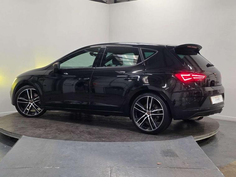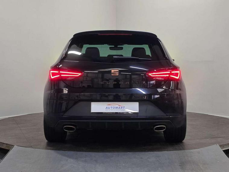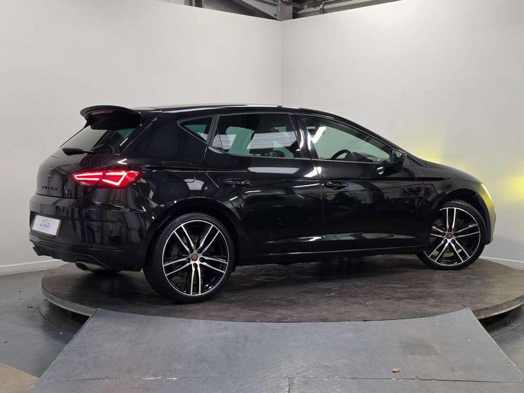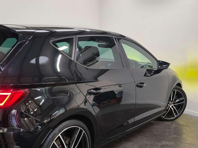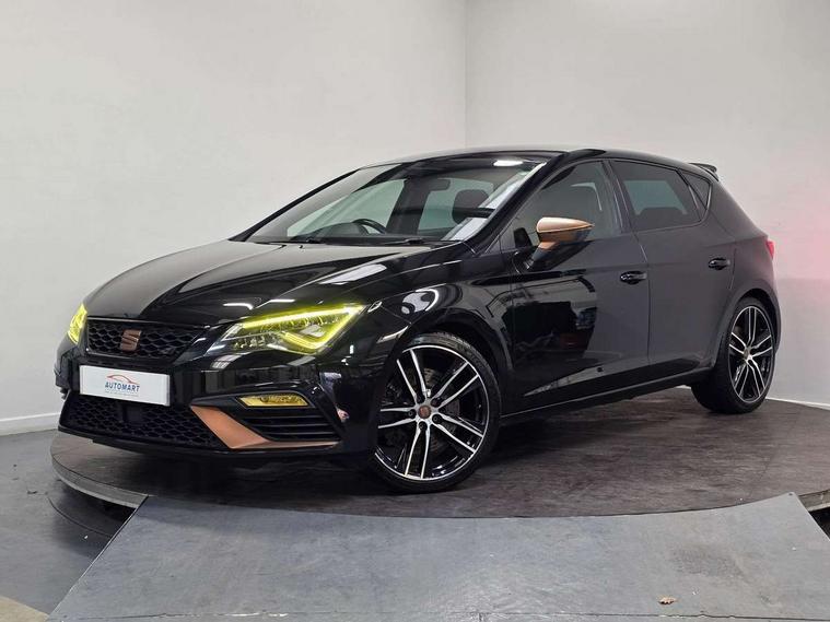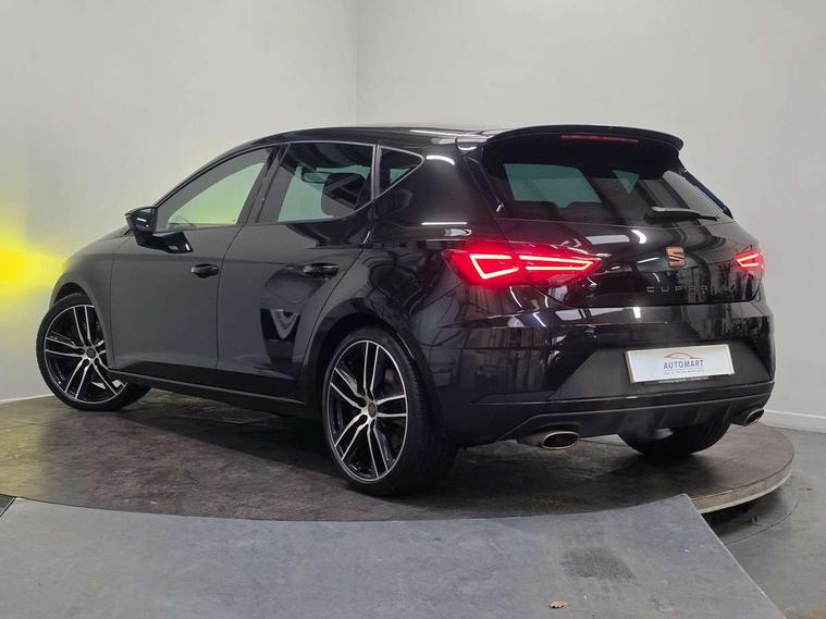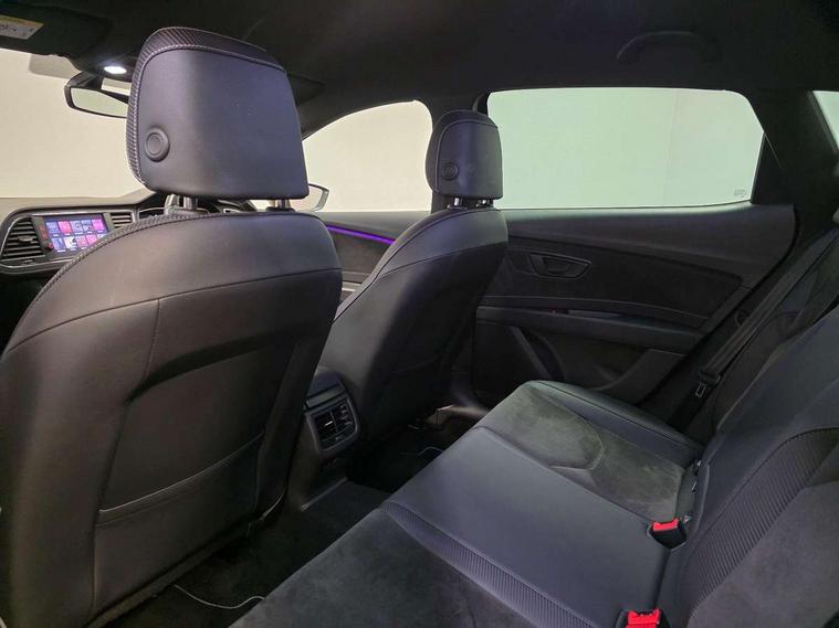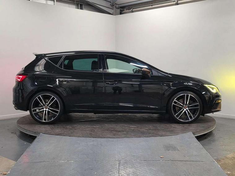 'Lights On' Reminder warning buzzer, 3D map display, 8" touch screen, Bluetooth Handsfree Phone Connection, CUPRA performance interface, Digital cockpit, Electro-mechanical progressive power assisted steering, Front and rear parking sensors, Front assist with pedestrian protection, Full Link Smartphone Integration with Mirror Link, Apple Car Play, Google Android Auto, Low fuel warning light, Navigation system (incl. media system plus), Outside temperature gauge, RPM counter, SEAT Drive profile CUPRA, SEAT logo boot release, Service interval indicator, Trip computer, Voice recognition, Dynamic chassis control, Lowered suspension, Mechanical limited slip differential, XDS electronic differential lock, 2x SD card slot, 4 USB, 8 speakers, Auxiliary input socket, Bluetooth audio streaming, CD player, DAB Digital radio, High resolution colour driver display, Media system plus (incl. media system colour), SEAT USB media cable, Steering wheel mounted audio/phone controls, Black radiator grille, Body colour door handles, Body coloured bumpers, Dark tinted rear windows, Electric front/rear windows, Electrically adjustable door mirrors, Electrically foldable exterior mirrors with parking position and passenger-side mirror with lowering function, Exclusive Cupra front and rear bumpers, Gloss black exterior mirrors with integrated LED indicators, Heated door mirrors, High gloss black finish B and C pillars, High gloss black front grille surround, Illuminated aluminium front door sill with CUPRA logo, LED front fog lights, LED headlights with LED day time running lights + LED rear lights + LED number plate lights, LED rear fog light, Rear wash/wipe, Visible dual exhaust pipes, 12v power point in centre console, 60/40 split folding rear seat with armrest, Active front headrests and 3 rear headrests, Additional heating and ventilation outlet in rear of centre console, Black roof lining, Boot storage net, Cargo rings in boot, Driver and passenger seat height adjust, Driver and passenger sun visor, covered and illuminated mirror, driver sun visor with card holder, Driver seat lumbar adjustment, Dual zone climate control, Dust/pollen filter, Flat bottomed perforated leather steering wheel with white stitching and CUPRA logo, Front adjustable head restraints, Front armrest with storage box, Front cupholders x 2, Front seatback storage pockets, Front sport seats in alcantara, Front/rear floor mats, Gear shift indicator, Height/reach adjust steering wheel, High centre console with integrated box & cup holder, rear air outlet, with armrest in front seats, Illuminated door sills, Instrument lighting with brightness control, Interior copper and black detailing, Luggage tie-down hooks, Multi-colour ambient interior lighting, Passenger seat lumbar adjust, Pedals with Aluminium Cover, Rear top tether child seat ISOFIX attachment, Steering wheel gearshift paddles, Storage box under drivers and passenger seat, 3 point seatbelts on all rear seats, 7 airbags - 2 front, 2 front side, 2 curtain, 1 knee, ABS + TCS, Child proof door locks, Electric handbrake, Electronic parking brake with auto hold, ESC with switch off key, ESC with tyre pressure warning indicator, ESP+EBA, Front and rear black brake calipers with cupra logo, Front seatbelt pretensioners, Front seatbelt reminder, Hill hold control, Multi-Collision braking, Passenger airbag deactivation system, 2 folding remote keys with window open/close function and boot opening/door mirror folding function, Central locking fuel filler cap, Engine immobiliser, Locking wheel bolts, Remote central locking + deadlocks, Volumetric alarm with back up horn, Gloss black interior detailing, 19" Cupra Machined alloy wheels 30/2,