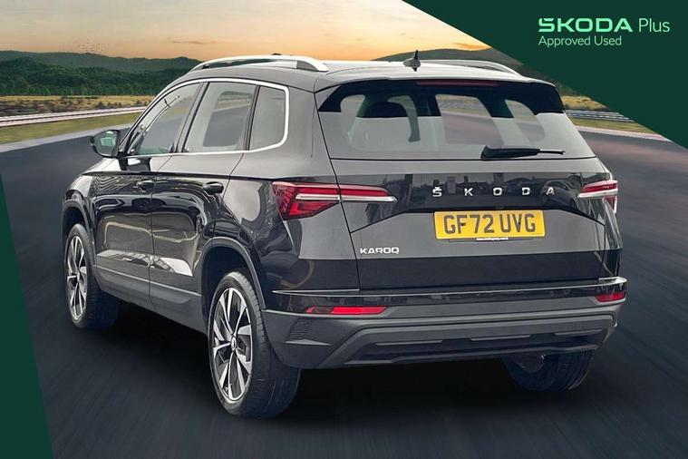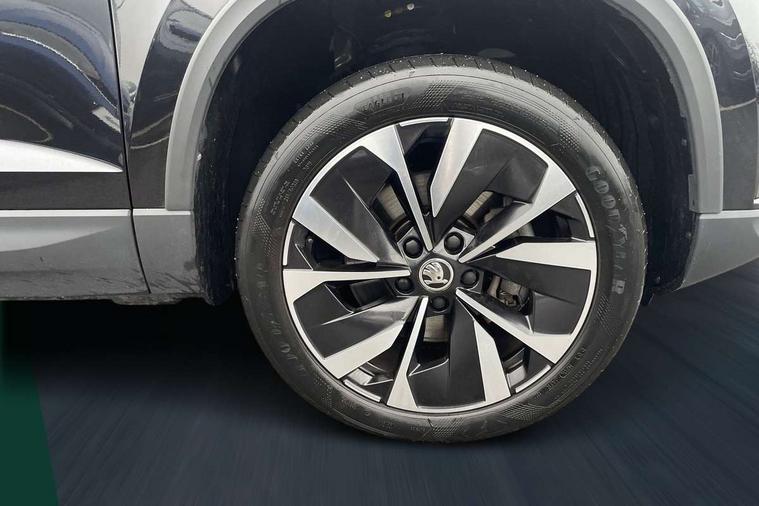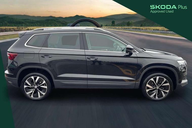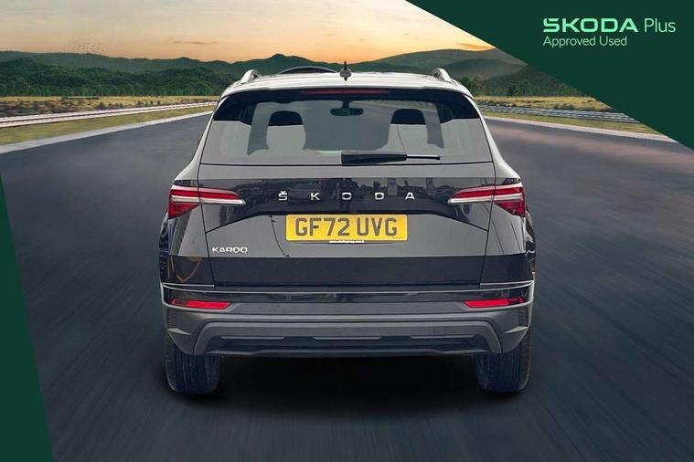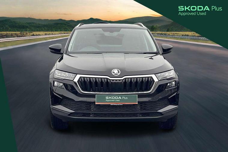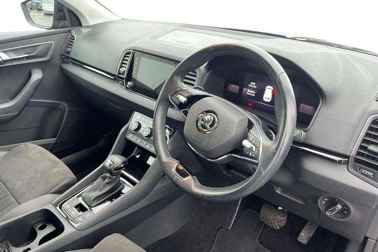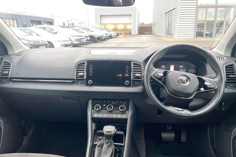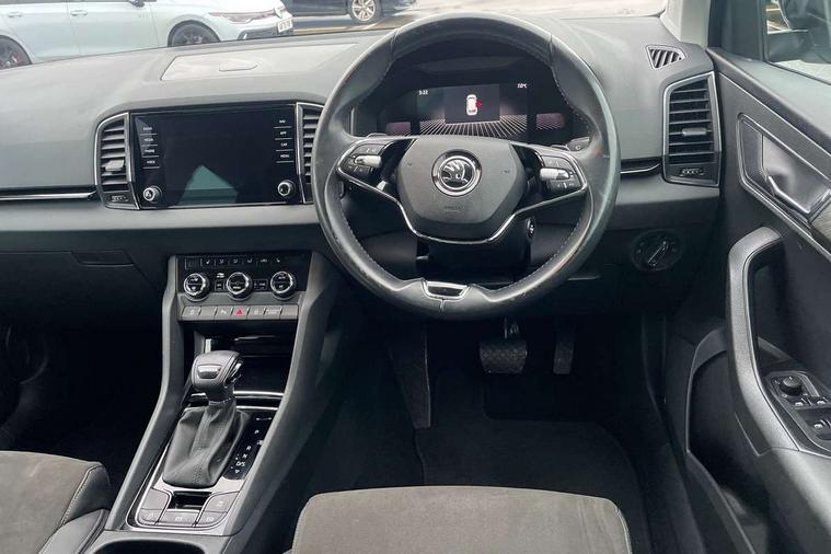 8" Digital display, Care connect, Driver fatigue sensor, Emergency services call system, Outside temperature gauge, Service interval indicator, SmartLink wireless for Apple and wired for Android, Start/stop system with regenerative braking, USB C Port x 2 in front centre console, 8 Speakers, DAB radio with Bluetooth, USB connection, Acoustic glass, Aero front windscreen wipers with intermittent function, Auto dimming rear view mirror with light and rain sensors, Black electric window control buttons, Body colour door mirrors and handles, Dynamic headlight range control with cornering light function, Electric front and rear windows with child proof lock, Heated rear windscreen, LED daytime running lights, LED rear lights with high functionality welcome effect and dynamic indicators, Light assistant (coming/leaving home/tunnel light), Plastic scuff plates, Privacy glass, Rear side wing doors, Rear spoiler, Rear window wiper with washer system and intermittent control, Safety reflectors on front doors, 1.5 litre bottle holders in driver and front passenger door panels, 12V socket in boot, 12v socket in front centre armrest with storage compartment and rear air vents, 2 Folding hooks and nets in boot, 2 spoke leather heated multifunction steering wheel with DSG paddles, 2 x Tablet holder, 3 rear height adjustable headrests, 3 seat bench in 2nd row, 4 foldable roof handles with rear coat hooks, Black floor carpet, Chrome inner door handles, Decorative door sills with KAROQ badging, Double sided boot floor, Foldable hooks in the boot, Front head restraints, Height adjustable front three point seats belts with tensioners, Height/reach adjust steering wheel, Ice scraper, Illuminated glovebox, Illuminated luggage compartment, Isofix child seat preparation for front passenger seat, Isofix child seat preparation outer rear, Manual lumbar support for front seats, Pen holder, Pollen filter, Rear boot cover, Rear reading lights, Rubbish bin door, Safety vest holder, Single front passenger seat, Storage box in upper central dashboard closed, Sunvisors with illuminated vanity mirrors, Textile floor mats, Ticket holder, VarioFlex seats with standard rear seat release, Chrome roof rails + chrome pack - Karoq, Parking pack - Karoq, Automatic door unlocking in case of crash, Automatic fuel cut off in case of crash, Child locks on rear doors, Driver airbag, Electronic parking brake with auto hold function, Emergency rear braking signal, ESC including ABS, MSR, ASR, EDS, HBA, DSR, RBS, MKB and traction control, Front side airbags, Hill hold control, Knee airbags, Passenger airbag with switch-off function, Pedestrian monitor, Seatbelt reminder signalisation and pretensioner for all seats, Three point seatbelts rear, Two tone horn, Tyre pressure display, Tyre pressure monitor, Alarm with interior monitoring, back up horn and tilt sensor with safe function, Electronic engine immobiliser, Keyless entry and start/stop, Remote central locking with 2 remote folding keys, Chrome framed air vents, 18" Procyon silver alloy wheels with anthracite aero inserts, Anti-theft wheel bolts protection, Storage on wheel cover, Tool kit,