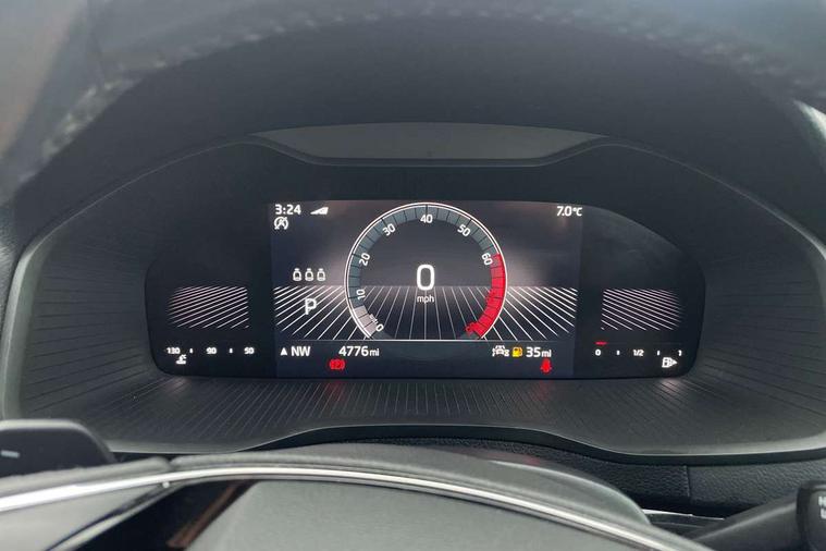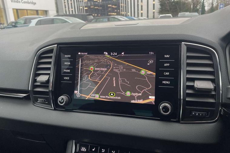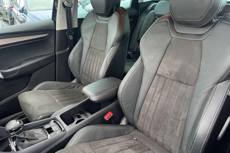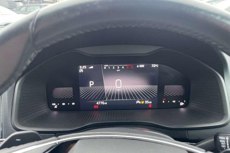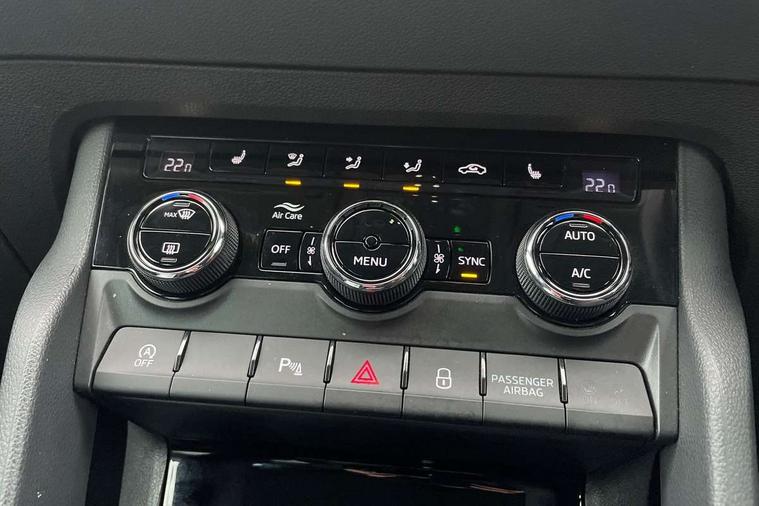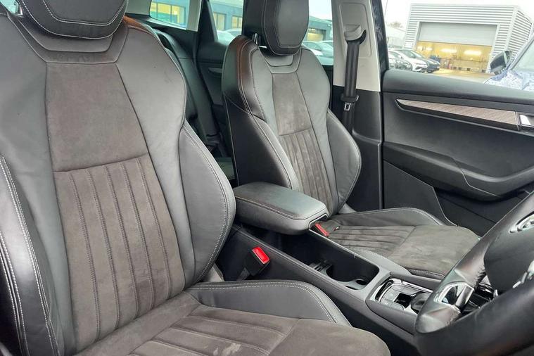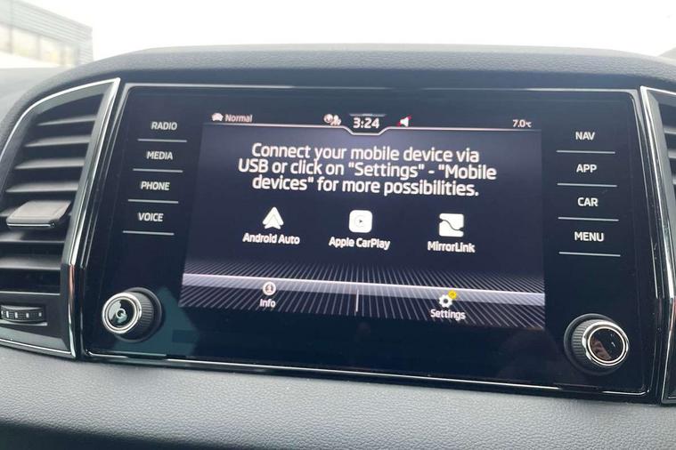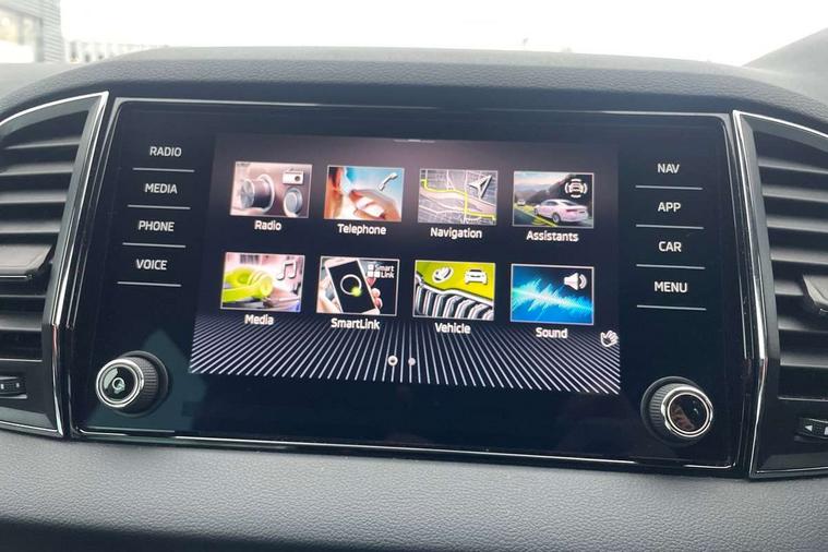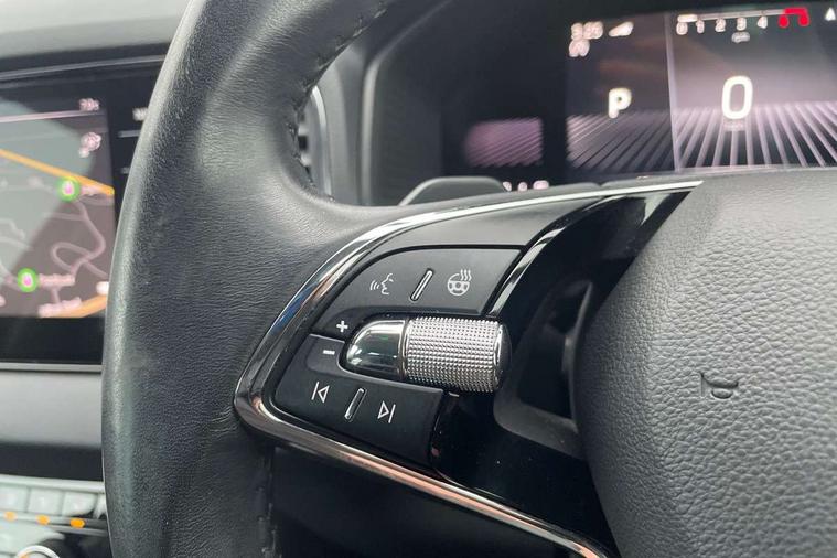 8" Digital display, Care connect, Driver fatigue sensor, Emergency services call system, Outside temperature gauge, Service interval indicator, SmartLink wireless for Apple and wired for Android, Start/stop system with regenerative braking, USB C Port x 2 in front centre console, 8 Speakers, DAB radio with Bluetooth, USB connection, Acoustic glass, Aero front windscreen wipers with intermittent function, Auto dimming rear view mirror with light and rain sensors, Black electric window control buttons, Body colour door mirrors and handles, Dynamic headlight range control with cornering light function, Electric front and rear windows with child proof lock, Heated rear windscreen, LED daytime running lights, LED rear lights with high functionality welcome effect and dynamic indicators, Light assistant (coming/leaving home/tunnel light), Plastic scuff plates, Privacy glass, Rear side wing doors, Rear spoiler, Rear window wiper with washer system and intermittent control, Safety reflectors on front doors, 1.5 litre bottle holders in driver and front passenger door panels, 12V socket in boot, 12v socket in front centre armrest with storage compartment and rear air vents, 2 Folding hooks and nets in boot, 2 spoke leather heated multifunction steering wheel with DSG paddles, 2 x Tablet holder, 3 rear height adjustable headrests, 3 seat bench in 2nd row, 4 foldable roof handles with rear coat hooks, Black floor carpet, Chrome inner door handles, Decorative door sills with KAROQ badging, Double sided boot floor, Foldable hooks in the boot, Front head restraints, Height adjustable front three point seats belts with tensioners, Height/reach adjust steering wheel, Ice scraper, Illuminated glovebox, Illuminated luggage compartment, Isofix child seat preparation for front passenger seat, Isofix child seat preparation outer rear, Manual lumbar support for front seats, Pen holder, Pollen filter, Rear boot cover, Rear reading lights, Rubbish bin door, Safety vest holder, Single front passenger seat, Storage box in upper central dashboard closed, Sunvisors with illuminated vanity mirrors, Textile floor mats, Ticket holder, VarioFlex seats with standard rear seat release, Chrome roof rails + chrome pack - Karoq, Parking pack - Karoq, Automatic door unlocking in case of crash, Automatic fuel cut off in case of crash, Child locks on rear doors, Driver airbag, Electronic parking brake with auto hold function, Emergency rear braking signal, ESC including ABS, MSR, ASR, EDS, HBA, DSR, RBS, MKB and traction control, Front side airbags, Hill hold control, Knee airbags, Passenger airbag with switch-off function, Pedestrian monitor, Seatbelt reminder signalisation and pretensioner for all seats, Three point seatbelts rear, Two tone horn, Tyre pressure display, Tyre pressure monitor, Alarm with interior monitoring, back up horn and tilt sensor with safe function, Electronic engine immobiliser, Keyless entry and start/stop, Remote central locking with 2 remote folding keys, Chrome framed air vents, 18" Procyon silver alloy wheels with anthracite aero inserts, Anti-theft wheel bolts protection, Storage on wheel cover, Tool kit,