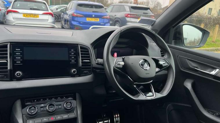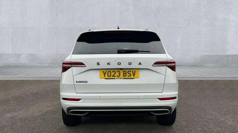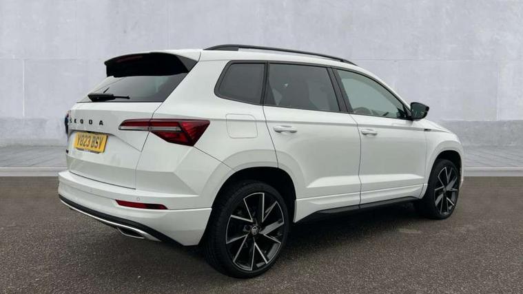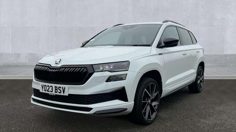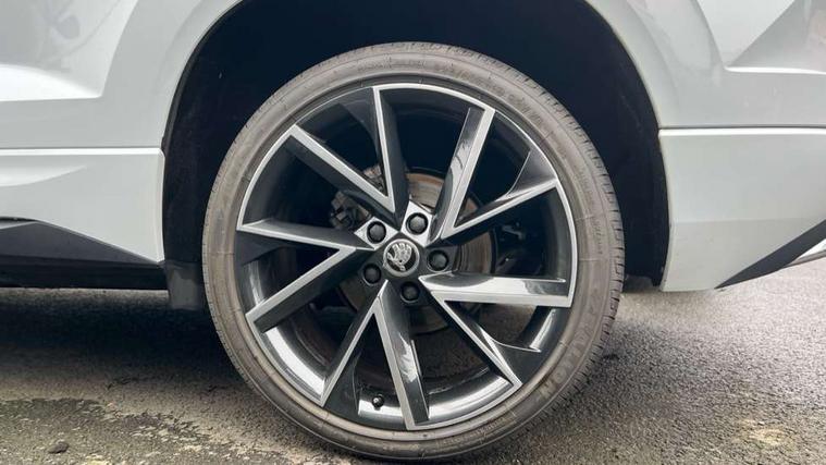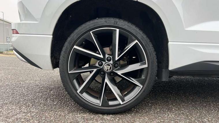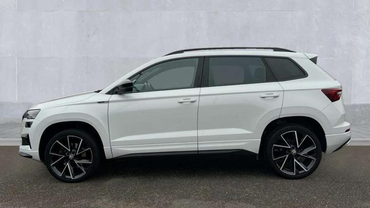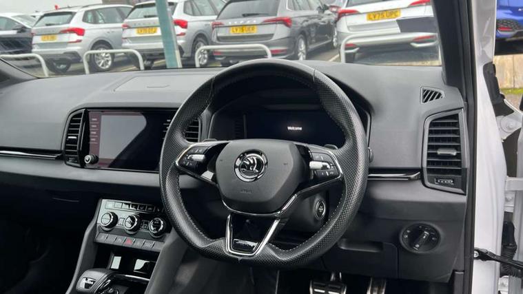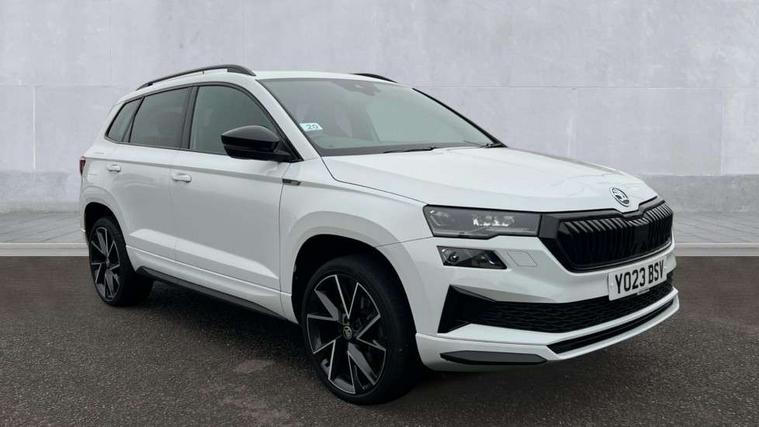 8" Digital display, Care connect, Driver fatigue sensor, Emergency services call system, Outside temperature gauge, Service interval indicator, SmartLink wireless for Apple and wired for Android, Start/stop system with regenerative braking, USB C Port x 2 in front centre console, Virtual cockpit, Virtual pedal with electrically operated boot door, 8 Speakers, DAB radio with Bluetooth, USB connection, Wireless charging without wireless aerial connection, Acoustic glass, Aero front windscreen wipers with intermittent function, Auto dimming rear view mirror with light and rain sensors, Black door mirrors, Black electric window control buttons, Black radiator grille, Black roof rails, Body colour door handles, Dynamic headlight range control with cornering light function, Electric front and rear windows with child proof lock, Front door steps with SportLine logo, Heated rear windscreen, LED daytime running lights, LED rear lights with high functionality welcome effect and dynamic indicators, Light assistant (coming/leaving home/tunnel light), Panoramic sliding sunroof, Plastic scuff plates, Privacy glass, Protective door side sills in body colour, Rear diffuser, Rear side wing doors, Rear spoiler, Rear window wiper with washer system and intermittent control, Safety reflectors on front doors, Skoda lettering on tailgate in black, Sportline badge on front fender, Sportline decorative inserts with badging, Sports front and rear bumpers, 1.5 litre bottle holders in driver and front passenger door panels, 12V socket in boot, 12v socket in front centre armrest with storage compartment and rear air vents, 3 rear height adjustable headrests, 3 seat bench in 2nd row, 3 spoke leather sports multifunction steering wheel and silver stitching with gear shift paddles, 4 foldable roof handles with rear coat hooks, Black floor carpet, Black roof headlining, Chrome inner door handles, Double sided boot floor, Foldable hooks in the boot, Front head restraints, Height adjustable front three point seats belts with tensioners, Height/reach adjust steering wheel, Ice scraper, Illuminated glovebox, Illuminated luggage compartment, Isofix child seat preparation outer rear, Manual lumbar support for front seats, Pen holder, Pollen filter, Rear boot cover, Rear reading lights, Rear seats fixed folding and divided 60:40, Rubbish bin door, Safety vest holder, Single front passenger seat, Storage box in upper central dashboard closed, Sunvisors with illuminated vanity mirrors, Textile floor mats, Ticket holder, Titan black interior ceiling, Welcome animation with sportline logo, Boot pack - Karoq, Light Pack - Karoq, Parking pack - Karoq, Automatic door unlocking in case of crash, Automatic fuel cut off in case of crash, Child locks on rear doors, Driver airbag, Electronic parking brake with auto hold function, Emergency rear braking signal, ESC including ABS, MSR, ASR, EDS, HBA, DSR, RBS, MKB and traction control, Front side airbags, Hill hold control, Knee airbags, Passenger airbag with switch-off function, Pedestrian monitor, Seatbelt reminder signalisation and pretensioner for all seats, Three point seatbelts rear, Two tone horn, Tyre pressure display, Tyre pressure monitor, Alarm with interior monitoring, back up horn and tilt sensor with safe function, Electronic engine immobiliser, Keyless entry and start/stop, Remote central locking with 2 remote folding keys, Black air vent surround, Black centre console, Satin black dashboard, Satin black door trim, 19" Vega black polished alloy wheels, Anti-theft wheel bolts protection, Matt black aero hub caps, Storage on wheel cover, Tool kit,