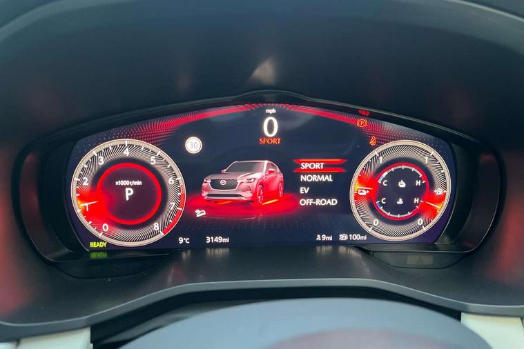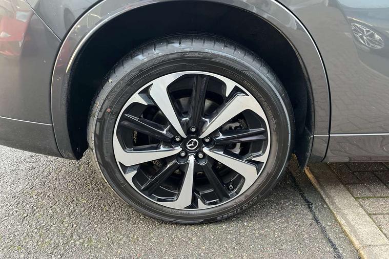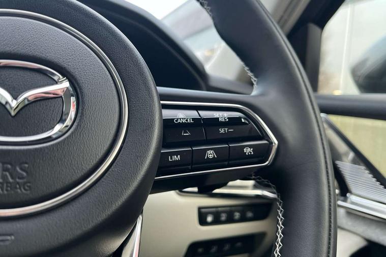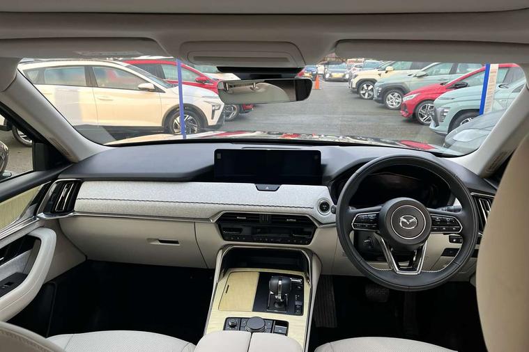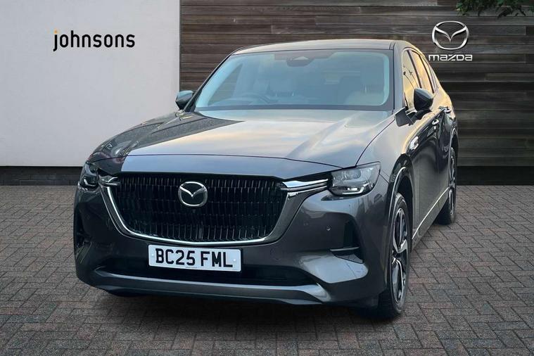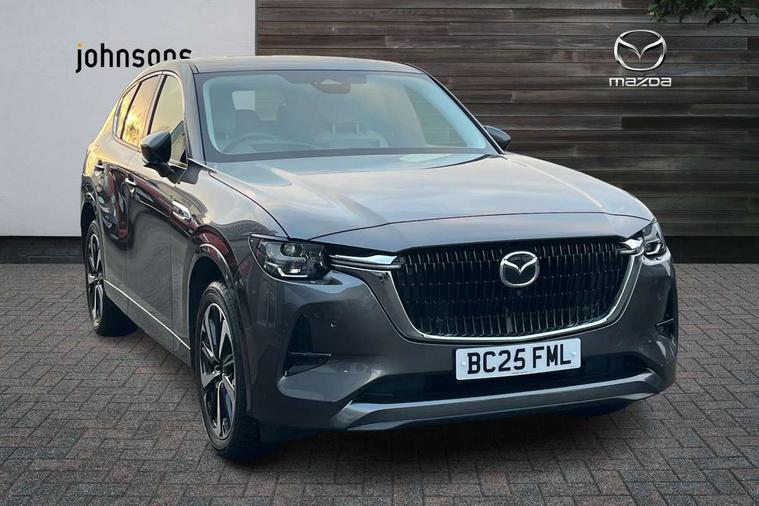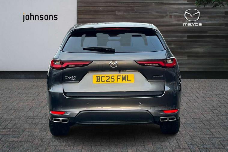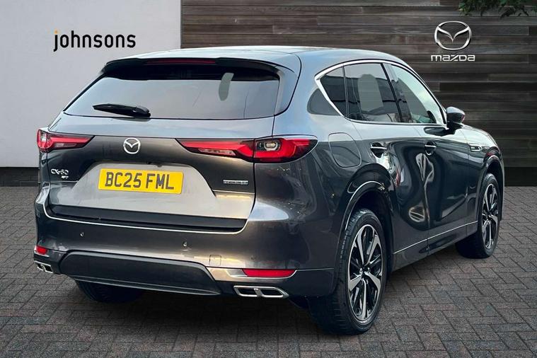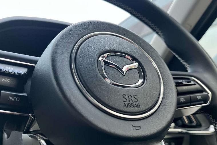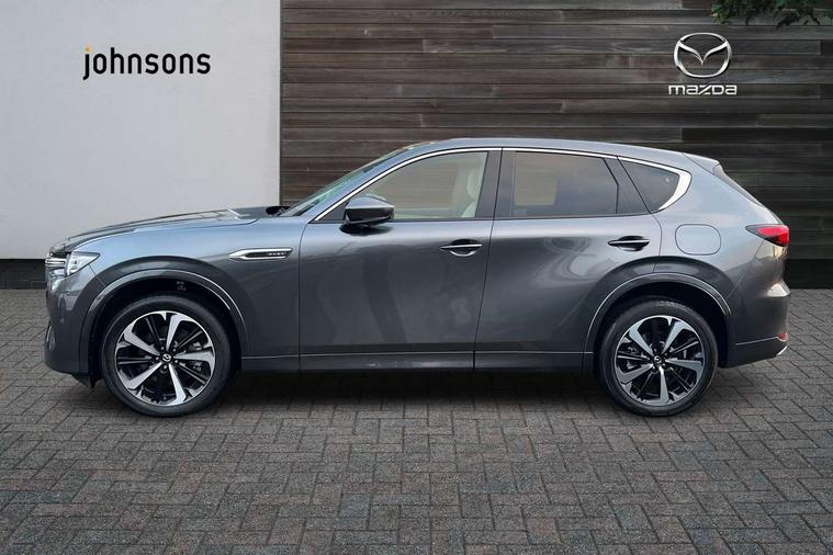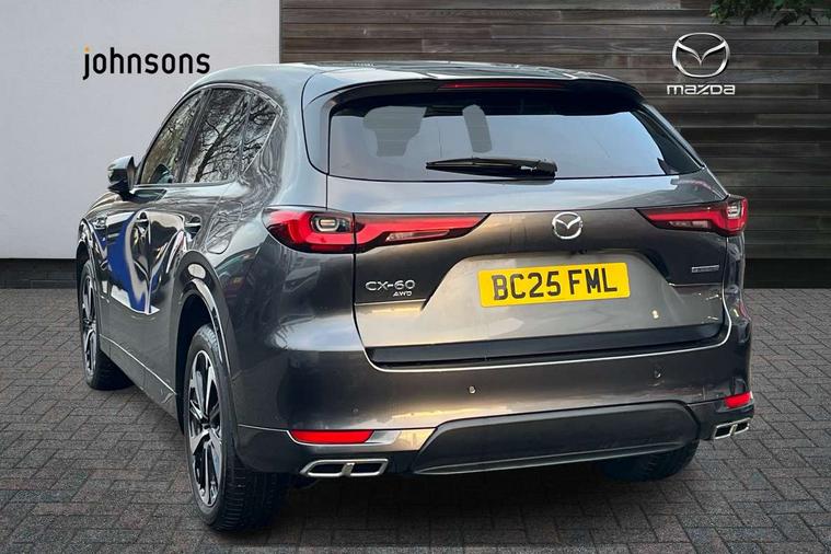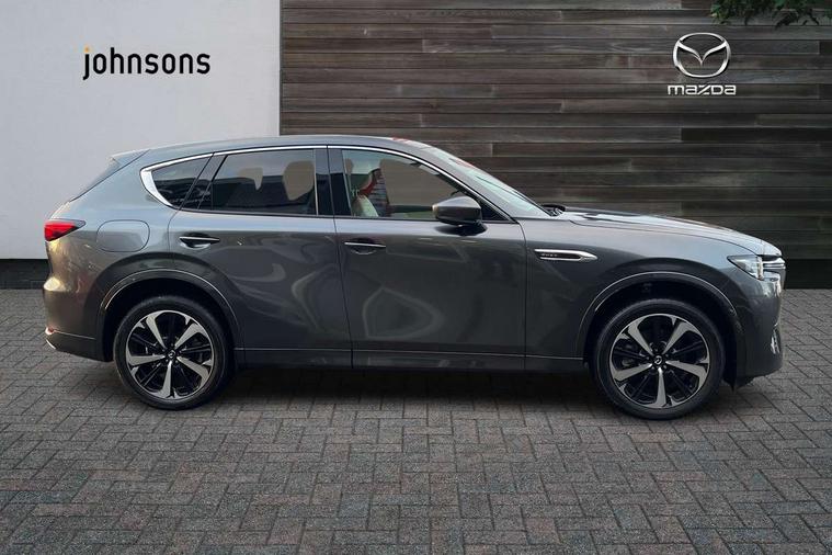 Emergency lane keeping with blind spot assist, Low washer fluid warning light, 12.3" Colour entertainment centre display with mazda connect infotainment, 12.3" TFT Colour display, Adjustable speed limiter, Blind spot assist, Blind spot monitoring with rear cross traffic alert, Distance alert system, Driver attention alert system, Driver Monitoring with personal identification, E-call with GPS, Emergency stop signalling system, Exit warning function, Front and rear parking sensors, Ingress / Egress support and automatic driver position guide, Integrated bluetooth, Intelligent speed assist, Kinematic posture control, Lane keep assist system (LAS) with Lane departure warning system (LDWS), Mazda Driver Personalisation System, Mazda hybrid navigation system with european mapping, Multimedia Commander, PAS, Power lift gate with handsfree function, Power start/stop button, Speed alert, Traffic sign recognition enhanced with mandated excessive speed warning, Trip computer, Windscreen projected colour active driving display, Wireless apple car play/android Auto, Type 2 Mode 2 cable for AC charging via UK 3-pin plug, 7.2 kw On board Charger, Mi-Drive (Normal, Sport, Off-road, Towing and EV mode), Paddle shift, Type 2 Mode 3 cable for AC charging via home or public charge points, AM/FM and DAB radio, Bose surround sound system with 12 Speaker, Bose center point, Bass match and audio pilot technology, Steering wheel mounted audio/bluetooth controls, USB-C inputs (x2 front and x2 rear), Auto dimming driver's door mirror, Automatic headlight levelling, B-pillar and C-pillar garnishes in gloss black finish, Body colour roof spoiler, Body coloured bumpers, Body coloured door mirrors, Body coloured lower bumper, wheel arch and side mouldings, Bright decoration panel, Chrome front side garish, Chrome headlight lense, Chrome side window surrounds, Coming/leaving home lighting function, Dusk sensing headlights, Electric front/rear windows with one touch auto up/down, Electric panoramic sunroof, Electrically adjustable, heated auto power folding door mirrors with memory, Frameless auto dimming interior rear view mirror, Front kodo turn signal, Front wiper de-icer, Gloss black bar type front grille with bright finish signature wing, Headlight washers, High beam control, LED 3rd brake light, LED rear signature combination lamps, Rain sensing front wipers with adjustable sensitivity and speed, Rear side wing doors, Rear wiper, Signature LED daytime running lights, 12v power outlet - front, 12V socket in boot, 3 height adjustable rear headrests, 3 seat bench in 2nd row, 40/20/40 split folding rear seats with quick levers in the boot, Ambient lighting, Cargo net, Chrome interior trim accents with steering wheel centre bezel, surround of engine start / stop button and glove box handle, Door panel trim vinyl leather with armrest, Driver and front passenger two rear grab handles with rear coat hooks, Driver and front passenger visors with covered vanity mirror and driver ticket holder, Driver seat electric tilt, slide, recline, height and lumbar adjustment, Driver, front passenger and two rear door pockets, Driver/passenger front seatback pockets, Dual zone climate control air conditioning with rear air vents, Electric telescopic and tilt adjustment steering wheel, Folding rear centre armrest with two cup holders, Front centre storage with two cupholders, Front down lamp with front and rear foot lamps, Front headrests, Front passengers seat electric slide, recline, height and lumbar adjustment, Front seat ventilation with 3-stage setting, Glovebox illumination, Heated front seats with 3 stage setting, Heated leather wrapped steering wheel, Heated outer rear seats with 3-stage setting, ISOFIX child seat anchorage points attached on outer rear seats, Karakuri tonneau cover, Leather wrapped gear shift knob, LED illumination luggage compartment, Nappa leather upholstery, Practical and spacious front centre armrest storage, Rear seat recline function for rear passenger comfort, Remote fold down rear seats, Roof lining (ceiling and pillars) - Grey, Roof mounted sunglasses holder, Single front passenger seat, White woven fabric dashboard with KAKENUI detailed stitching and genuine maple wood accents, Convenience Pack - CX-60 PHEV, Driver Assistance Package - CX-60, 3 point ELR front seat belts x2 with pretensioners, 3 point ELR rear seat belts, Active bonnet, Anti-lock braking system (ABS), Drivers knee airbag, DSC - Dynamic Stability Control, Electronic parking brake with auto disengage function and auto hold function, Front and rear curtain airbags, Front dual stage driver and single stage front passenger airbags, Front passenger airbag cut-off switch, Front side airbags, Front smart city brake support, Hill decent control, Hill launch assist, Manual rear child locks, Seatbelt reminder for driver/front passenger and rear seats, Traction control, Tyre pressure monitoring system (TPMS), Remote central locking with deadlocking and automatic door lock when driving, Smart keyless entry, Thatcham accredited alarm and immobiliser, White maple wood centre console panel, 20" Black diamond cut alloy wheels, Emergency tyre repair kit,