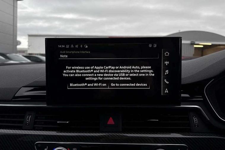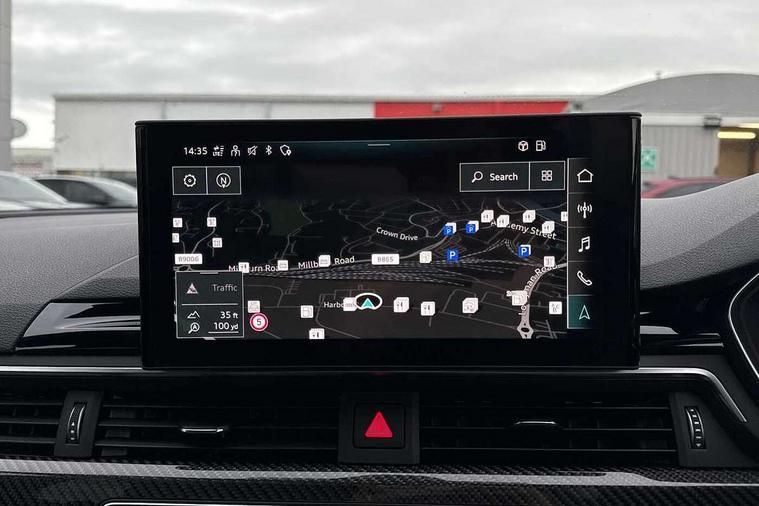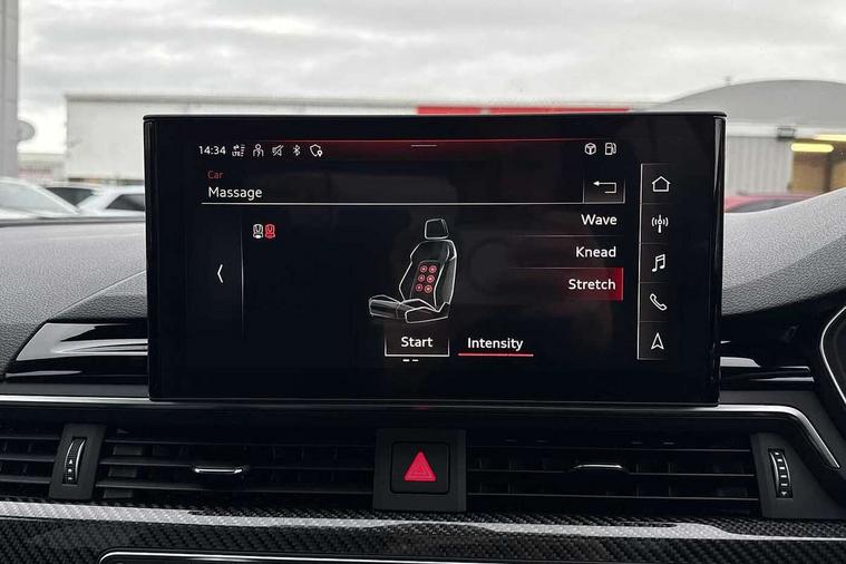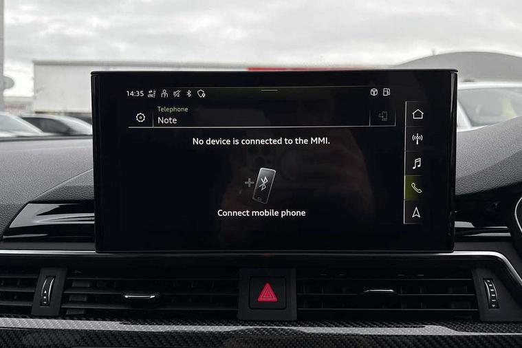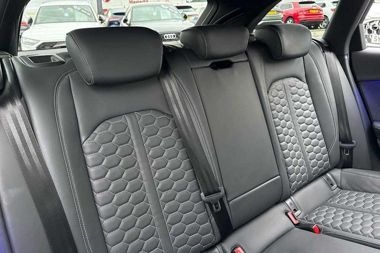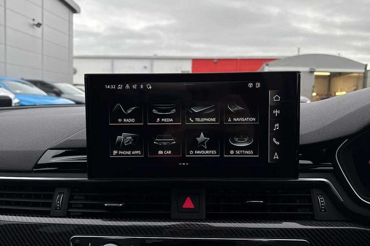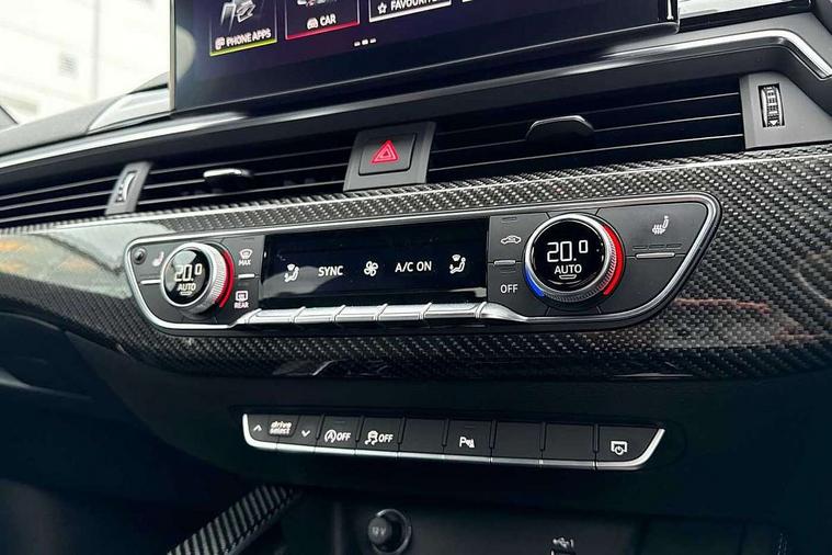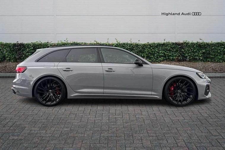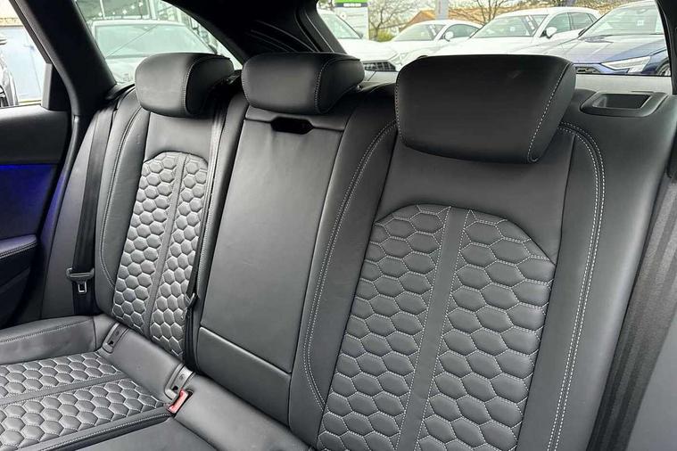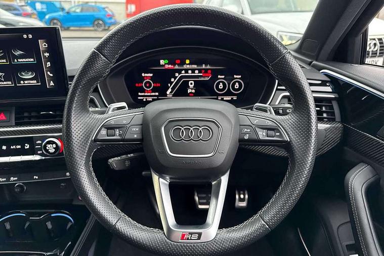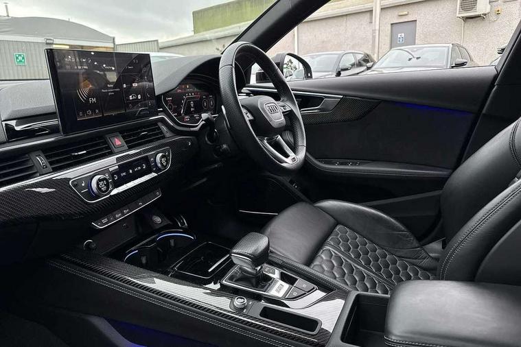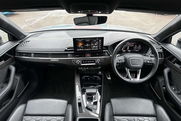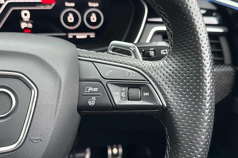 7" Colour driver information system, Amazon alexa Integration, Audi connect safety and service (e-call), Audi drive select, Audi side assist, Audi smartphone interface, Audi virtual cockpit with RS specific display, Automatic start-stop system with coasting functionality and efficiency programme, Bluetooth interface, Electromechanical power steering, Email, calendar and text messages displayed via MMI, MMI Navigation plus with MMI touch includes 10.1" high resolution colour MMI display, 3D map, Power opening/closing tailgate, Service interval indicator, Voice control system, 58 Litre fuel tank, Quattro sports differential, 2 USB charging ports, Audi sound system, DAB digital radio module, 3rd brake light, Acoustic windscreen, Audi matrix LED headlights with LED rear lights + dynamic front and rear indicators, Audi rings and lettering glossy black, Auto dimming rear view mirror, Automatic headlights + automatic windscreen wipers, Black roof rails, Blue tinted glass, Body colour door handles, Electric front windows, Electric rear windows, Electrically folding auto dimming/adjustable/heated door mirrors with memory function, LED side indicators and kerb view function for passenger side, Flared front and rear wheel arches, Front bumper with enlarged air inlets, Headlight range control, High beam assistant, High gloss black door mirror housing, High gloss black triangular aperture at rear door, Honeycomb design grille with quattro logo, Lateral air inlets next to front headlights, LED daytime running lights, LED indicators in door mirrors, Privacy glass with rear acoustic glazing, Rain and light sensors, Rear side wing doors, Rear wiper, Roof spoiler, RS 4 badges on grille, the front wing panels and rear, RS4 dual branch chrome tailpipes with left and right oval pipes, 3 seat bench in 2nd row, 3 spoke multifunction plus leather steering wheel with heating and RS badging, 40/20/40 split folding rear seats with rear centre armrest, Black cloth headlining, Deluxe 3 zone electronic climate control, Electric load area cover, Electrically adjustable front seats, Fine nappa leather with contrast honey comb stitching + super sports seats with pneumatic massage function, Front centre armrest, Front headrests, Front/rear floor mats, Heated front seats, Height and reach adjustable steering wheel with full size airbag, Illuminated door sill trims with RS4 logo, ISOFIX child seat mounting and top tether, Leather door armrests and knee pad, Luggage compartment carpet, Perforated leather gear lever knob with contrast stitching, Rear headrests, Retractable load area cover, Single front passenger seat, Stainless steel pedals, Sunvisors with vanity mirrors, Carbon black styling pack - RS4, LED Interior light pack - RS4, Non Smokers pack, 3 point seatbelts on all rear seats, Adaptive driver and front passenger airbags, Electromechanical parking brake, Electronic stabilisation control including ABS, ASR and EDL, Enhanced braking system, Front head airbags, Front seatbelt pretensioners + load limiters, Front side airbags, Hill hold assist, Manual child lock in rear doors, Multi-Collision braking, Pop-up bonnet for pedestrian protection, Pre sense city, Rear side airbags, Seatbelt monitoring, Traction control, Tyre pressure warning, Variable restraint system, Warning triangle and first aid kit, Anti theft alarm, Anti-theft wheel bolts, Immobiliser, Keyless Go, Remote central locking, Remote control key with RS emblem, Carbon twill inlays, 20" 5 segment spoke evo design glossy black sport alloy wheels, Tool kit, Tyre repair kit,