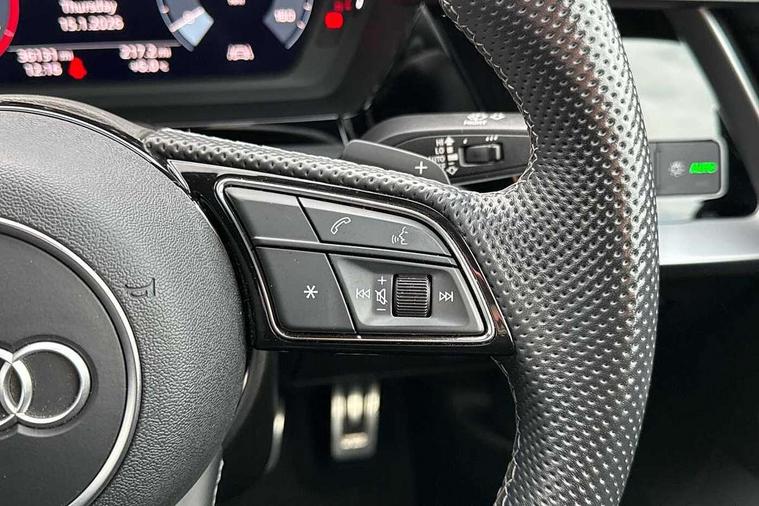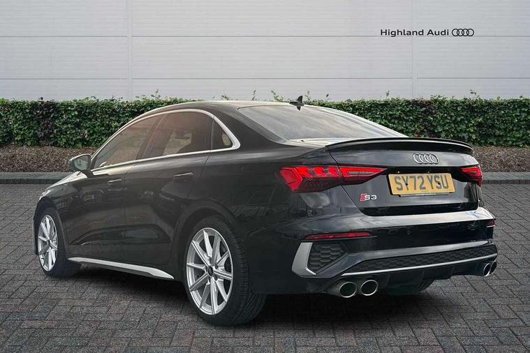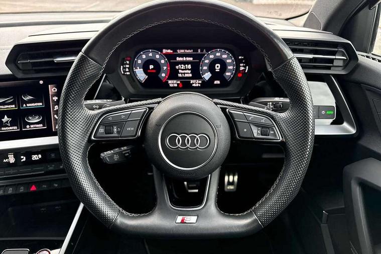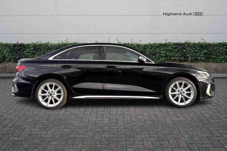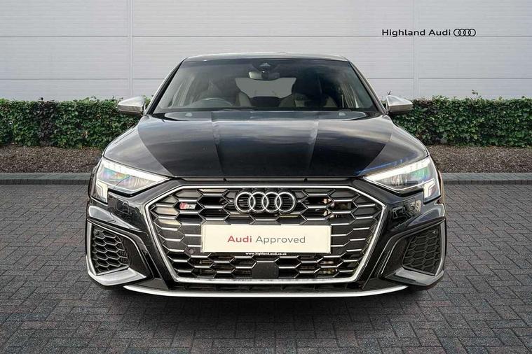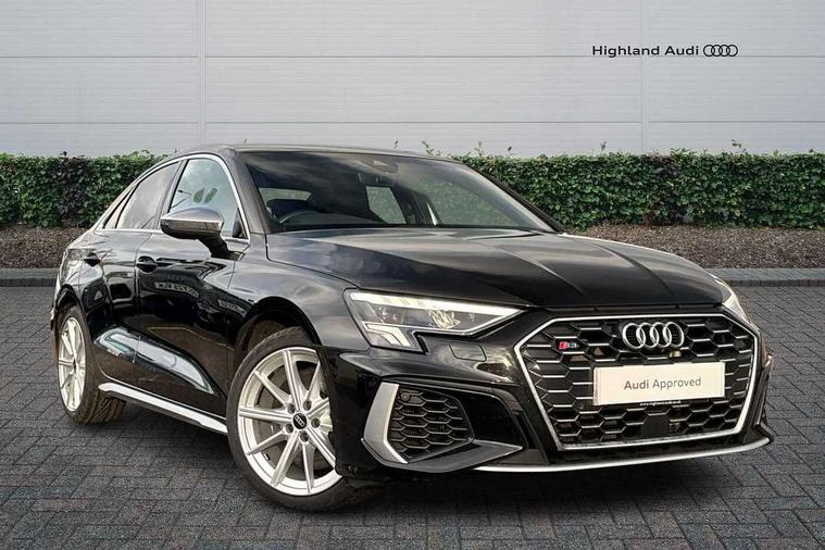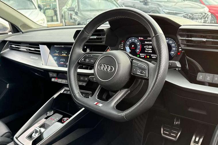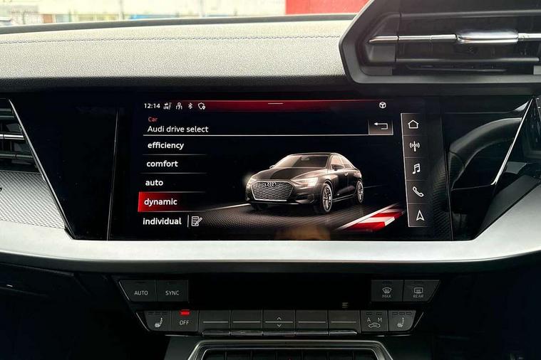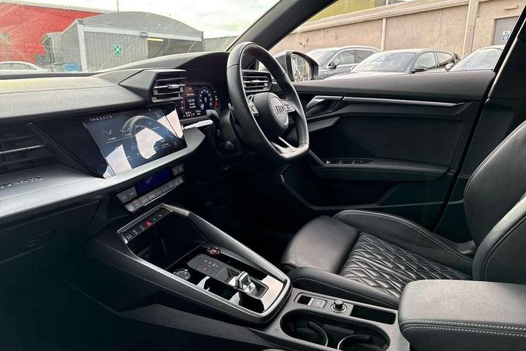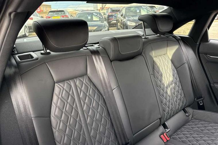 Audi connect emergency call and service, Audi drive select (Auto, Comfort, Dynamic, Efficiency and Individual), Audi smartphone interface, Audi Virtual Cockpit - 10.25" digital and colour instrument cluster, Automatic start/stop system with recuperation, Bluetooth interface, Collision avoidance assistant, Lane departure warning system, MMI Navigation Plus with high resolution 10.1" colour touch screen display, Progressive steering, Service indicator, Voice control system with natural language interaction, Quattro permanent all wheel drive, S sport suspension with spring damper adjustment and lowering by 15mm, 2x USB Type C ports (for charging and data transfer), 6 passive loudspeakers, CD player, DAB Digital radio, 3rd brake light, Acoustic glass windscreen, Audi Beam uses LEDs to project the Audi logo onto the ground as you exit your S3, Auto dimming frameless rear view mirror, Electrically adjustable/heated/folding/auto dimming door mirrors with integrated LED indications + kerb view function for passenger side, Front electric windows, Headlight washers, Illuminated door sills with aluminium inserts at the front with S logo, LED daytime running lights, LED headlights with LED rear lights and dynamic rear indicators, Light and rain sensors, Model and engine designation badges at rear, Privacy glass - dark tinted rear window, rear door and side windows, Rear boot, Rear electric windows, Rear side wing doors, 12V socket and storage compartment in front centre console, 3 seat bench in 2nd row, 40/20/40 split folding rear seat bench with cupholder, Black cloth headlining, Dual zone electronic climate control, Front and rear centre armrest in leather, Front and rear headrests, Front/rear floor mats, Heated front seats, Height and reach adjustable steering wheel, Illuminated vanity mirror, Interior lighting - glove compartment light and right hand side, Luggage compartment floor covering, Single front passenger seat, Stainless steel pedals and front footrest in black, Body styling design pack - S3, LED interior lighting pack - A3 Saloon, Storage pack - A3/S3 Saloon, 3x3 point rear seat belts, Driver and front passenger airbag with passenger airbag deactivation, Electronic Stabilisation Control (ESC) including ABS, ASR and EDL, First aid kit with warning triangle and 2 safety vests, Front side airbags with head airbags and interaction airbag, Hill hold assist, Pre-sense front with pedestrian and cyclist detection, Seatbelt monitoring, Tyre pressure loss indicator, Anti theft alarm, Anti-theft wheel bolts, Electronically operated child locks, Immobiliser, Remote control central locking, Aluminium air vent surrounds, Aluminium trim elements, Dark spectrum aluminium inlays, accent surfaces in the dashboard and centre console in platinum grey silk effect paint finish,