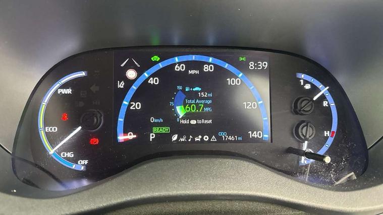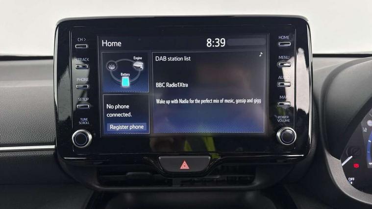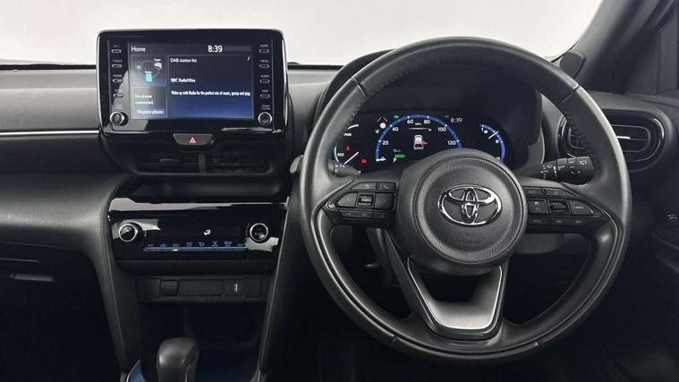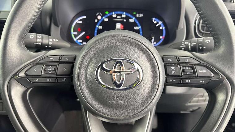 7" Multi information display screen, 8" Toyota touch 2 multimedia system with Smartphone integration with Apple CarPlay and Android auto, Adjustable speed limiter, Bluetooth connectivity, Driver attention alert system, eCall emergency system, Electric power steering, Full range intelligent adaptive cruise control, Hybrid system indicator, Key reminder warning, Lane trace assist, Multimedia, audio, telephone and voice recognition switches on steering wheel, My T Connected services, Pre-collision system enhanced with emergency steering assist, Reversing camera, Road sign assist - RSA, Steering assisted vehicle stability control, 6 speakers, DAB Digital radio, USB connection, 3rd brake light, Acoustic windscreen glass, Aluminium roof rails, Anti-jam protection on power windows, Auto high beam [AHB] with on/off switch, Automatic headlights, Black lower front grille, Black Shark-fin antenna, Black upper front grille, Black wheel arch mouldings, Body colour door handles, Body colour front bumper, Body colour rear bumper, Electric adjustable heated door mirrors, Follow me home headlights, Front and rear electric windows with auto up/down function, Front intermittent wipers, Headlight cut off reminder, Indicators integrated on door mirrors, Intermittent rear wiper, LED daytime running lights guide, LED front fog lights, LED front light guide, LED Indicators, LED projector headlights, LED rear light guide, Manual headlight levelling, Manually retractable door mirrors, Noise reduction layer on windscreen, Privacy glass, Rain sensor, Rear LED lights with sequential indicators, Rear side wing doors, Rear spoiler, Rear window defogger, 12v power outlet - front, 2x Rear coat hooks, 3 seat bench in 2nd row, 3 spoke leather steering wheel, 40:20:40 split folding rear bench seat, Adjustable speed limiter switch on steering wheel, Auto air conditioning, Black roof lining, Boot light, Central armrest, Centre console in light blue ambent lighting, Driver and front passenger personal lights, Fabric door trim, Fabric upholstery, Footwell in light blue ambient lighting, Front console box, Front cup holders, Front head restraints, Glovebox, Height adjustable driver's seat, Height adjustable front passenger seat, Hooks for luggage holding belts, ISOFIX child restraint system, Lane departure alert switch on steering control, Leather gearshift, Light blue ambient lighting on front doors, Manual telescopic and tilting steering wheel, Mirror on driver and passenger sun visor, Pollen air filter, Rear cup holders, Rear head restraints, Single front passenger seat, Soft tonneau cover, 3x3 point rear seat belts, ABS+EBD+Brake assist, Driver and passenger central airbags, Driver and passenger front airbags, Driver and passenger side airbags, Electronic parking brake, Emergency brake light system (EBS), Front seat belt reminder, Hill start assist control (HAC), Passenger airbag on/off switch, Pre-collision system with pedestrian and cyclist detection, Rear door child safety locks, Rear passenger side airbags, Rear seat belt reminder, Traction control, Tyre pressure warning system, Immobiliser, Intrusion alarm, Keyless smart entry with push button start, Power door locks, Power passenger window lock, Remote door lock, Tyre repair kit,
