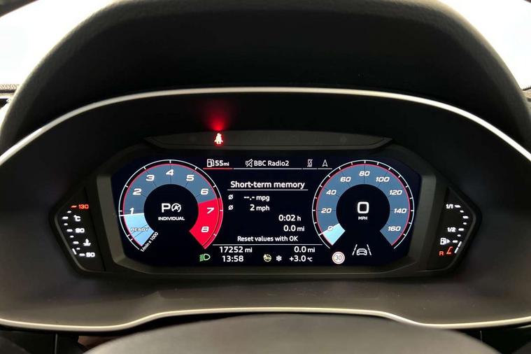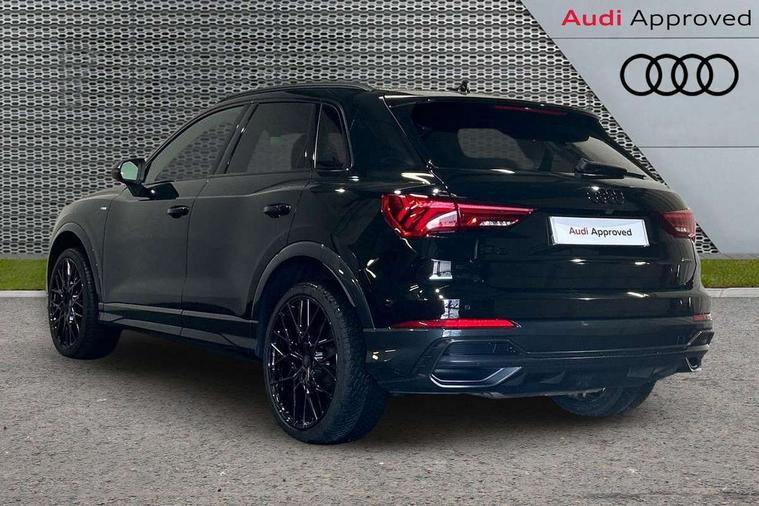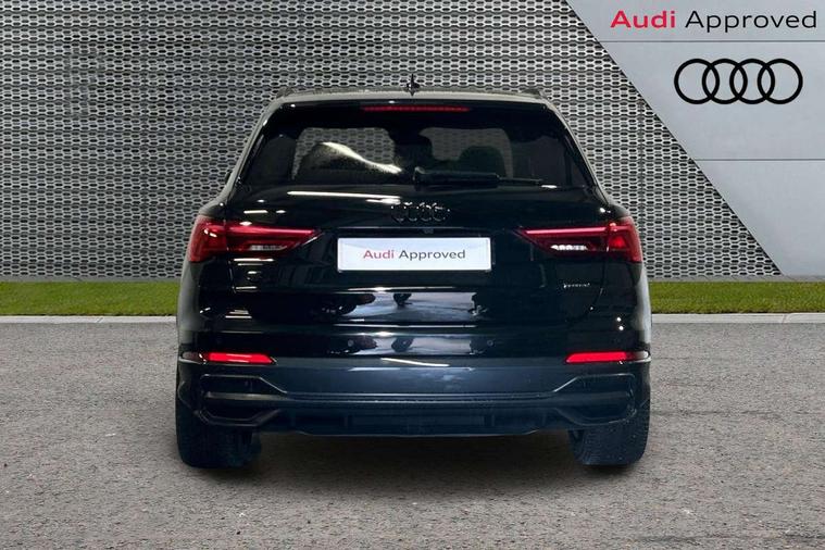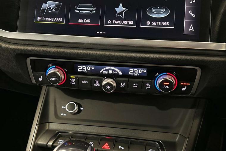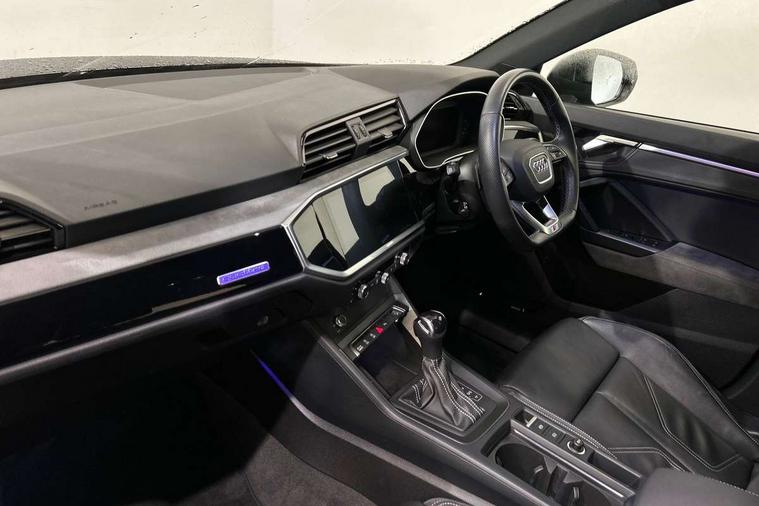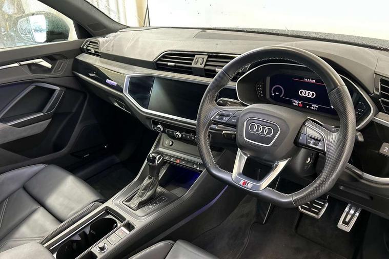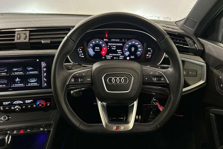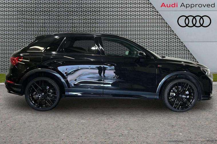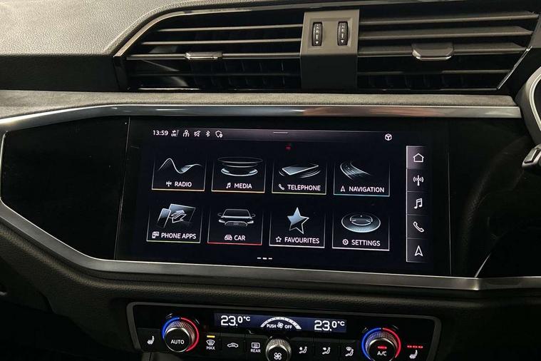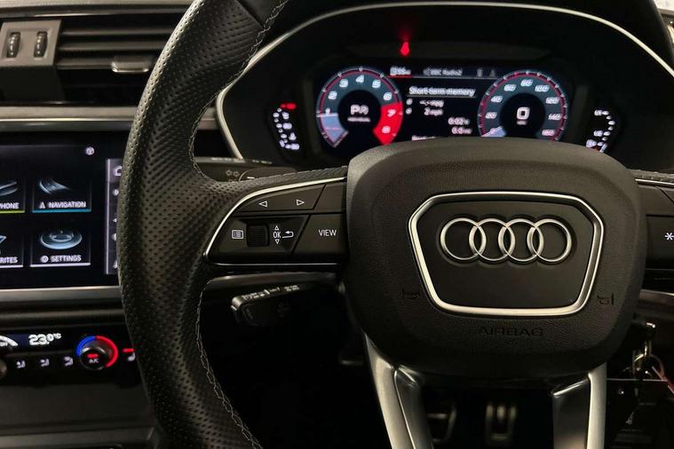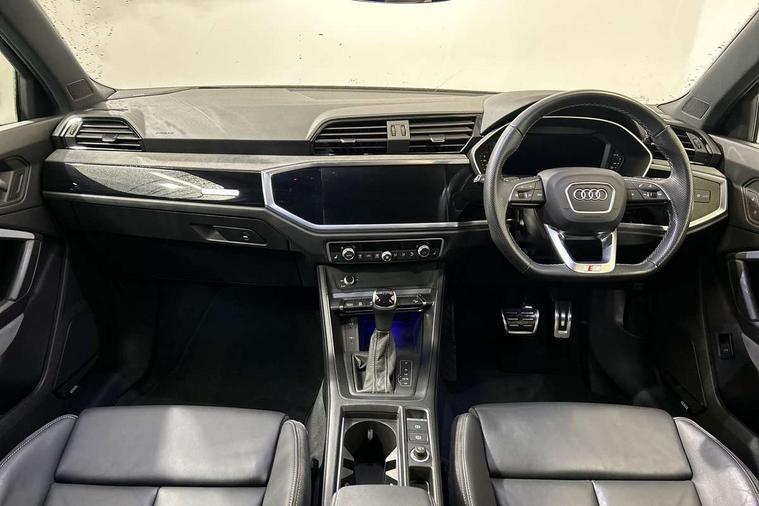 Amazon alexa Integration, Audi connect safety and service (e-call), Audi drive select, Audi lane departure warning, Audi Virtual Cockpit - 10.25" display, Bluetooth interface, Camera based traffic sign recognition, MMI Navigation Plus with high resolution 10.1 inch touchscreen colour display, Power operated tailgate, Progressive steering, Service interval indicator, Smartphone interface includes wireless Apple carplay/Android Auto, Start stop system with recuperation, Voice control system with natural language interaction, Sports suspension, 2 USB-C ports with charge and data functions, 6 passive loudspeakers, DAB digital radio module, Acoustic windscreen, Auto dimming frameless rear view mirror, Black roof rails, Electrically folding, adjustable and heated door mirrors with integrated LED side indicators and kerb view function for passenger side, Front and rear electric windows, Front fog lights, Grille vertical bars in aluminium silver/Matt, High gloss black finish B and C pillars, LED headlights with LED daytime running lights, LED rear lights, LED third brake light, Privacy glass dark tinted rear and rear-side windows (from B-pillar backwards), Rain and light sensors, Rear diffuser strip in matt titanium black, Rear side wing doors, Rear wiper, S line bumpers in contrasting Manhattan grey, Tinted rear windows, Variable front intermittent wipers, 12V socket in rear centre console, 3 seat bench in 2nd row, 40:20:40 folding with manual adjustment for 60:40 forwards/backwards position and backrest angle, Adjustable rear seat bench/backrest with centre armrest and cupholder, Black cloth headlining, Dual zone electronic climate control, Front and rear black floor mats with contrast stitching in rock grey, Front and rear headrests, Front and rear roof module including reading lights, Front centre armrest, Glove compartment lighting, Height and reach adjustable steering wheel, Illuminated door sill trims with S logo, ISOFIX child seat mounting for front passenger with airbag deactivation and outer rear seat including top tether attachment point for outer rear seats, Luggage compartment light, Manual front seats with height adjustment, Perforated leather gearknob, Single front passenger seat, Stainless steel luggage compartment sill finisher, Stainless steel pedals, Black styling pack - Q3, Non smoking pack - Q3, 3x3 point rear seatbelts, 6 airbags - Driver, front passenger, curtain and side windows, Audi pre-sense front with pedestrain and cyclist recognition, Electrically operated child locks on rear doors, Electromechanical parking brake, Electronic stabilisation control including ABS, ASR and EDL, Front seatbelt reminder, Hill descent control, Hill hold assist, Pre sense basic, Seatbelt monitoring, Tyre pressure warning, Warning triangle and first aid kit, Anti theft alarm, Anti theft wheel bolts, Immobiliser, Remote central locking, Detail dashboard around MMI touch colour display in glass look, black with surround in aluminium look, Leatherette door armrest, Piano black inlay,
