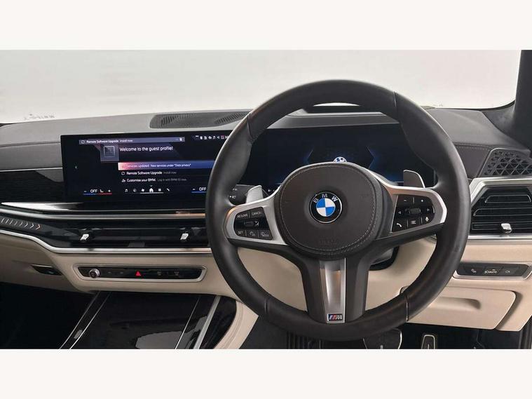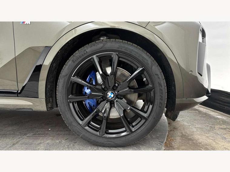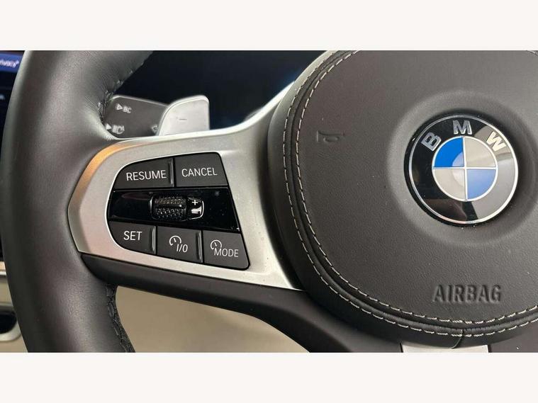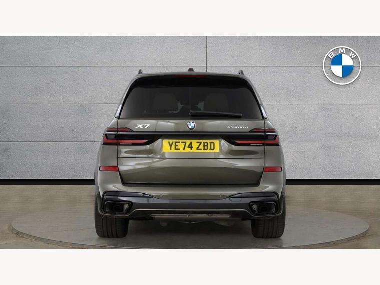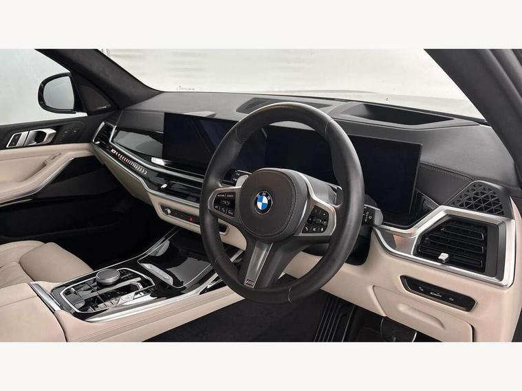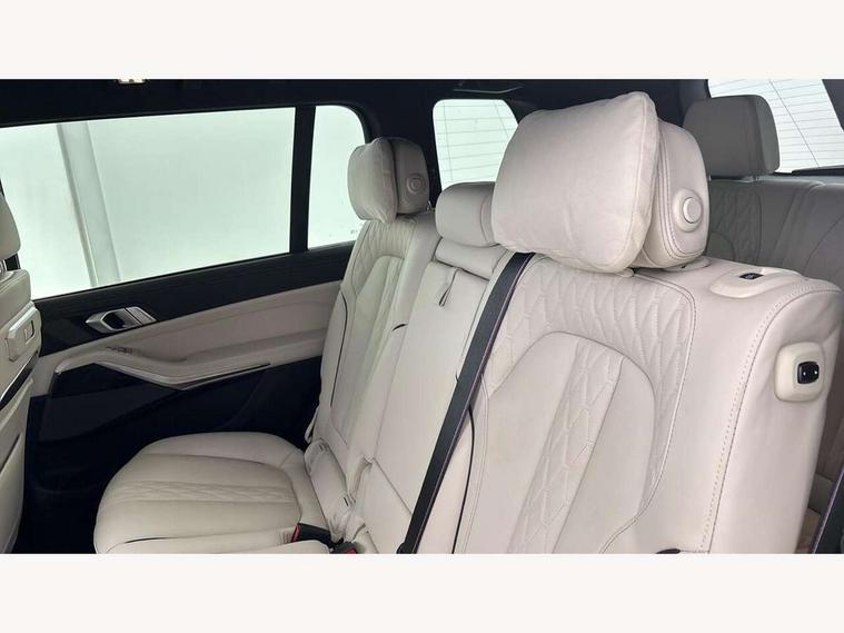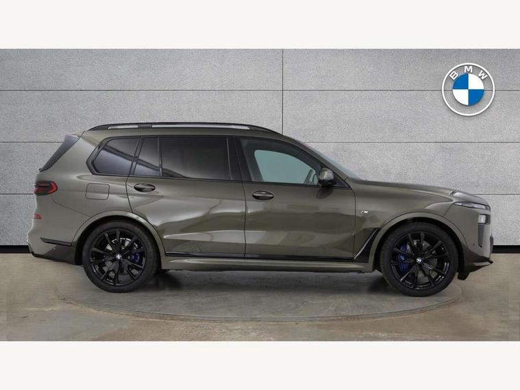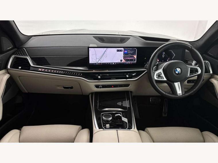 2 rear USB-C ports, Attentiveness assist, Automatic start/stop function, Automatic tailgate operation, BMW ConnectedDrive online services, BMW Drive recorder, BMW gesture control, BMW Teleservices, Brake pad wear indicator in front and rear, Condition based service, Electric power steering with Servotronic steering optimised at all speed ranges, Integral active steering, Integrated owner's handbook, Live Cockpit Professional with head up display including 12.3" instrument cluster and 14.9" central display, Parking assistant pro including reversing assistant, PDC, lateral parking aid, reversing assist camera, parking drive off monitoring, Speed limiter, 48V Mild hybrid technology, 8 speed automatic with steptronic transmission including automatic hold function and gearshift paddles on the steering wheel, Drive experience switch with comfort mode + ECO PRO + sport mode, Permanent all wheel drive, 2x Front USB (1x USB-C, 1x USB-A), DAB radio, Acoustic glazing, Adaptive air flap control bars in high gloss black, Air breather and door claddings in high gloss chrome, Aluminium roof rails, Aluminium Running Board, Body coloured wheel arches, Dynamic brake lights with LED technology, Electrically adjustable and heated aspheric folding side mirrors with auto dimming, electric fold in function, automatic parking function, Exterior and central air inlets in front bumper painted pearl chrome, Follow me home headlight function, Frameless interior mirror, Front and rear electric windows, Front ornamental grille struts in chrome high gloss, Heated windscreen washer nozzles, High beam assist, High gloss black shadowline trim in side/window frame, window recess cover, window guide, B and C pillar, mirror triangle, mirror base, mirror frame, Integrated turn indicators, Kidney grille iconic glow, LED daytime running lights, LED rear lights, LED third brake light in rear spoiler, One piece front ornamental grille frame in pearl gloss chrome, Rain sensor with automatic headlight activation and windscreen wiper control, Rear side wing doors, Side window graphic in satinated aluminium, Sump guard front and rear painted in silver, Trailer stabilisation logic, 12V - Power sockets with 2x centre console and 1x luggage compartment, 2 seat bench in 3rd row, 2x cupholders in front, rear centre armrest and two in third row seats, 3 seat bench in 2nd row, 40:20:40 split folding rear seat backrests, BMW inscription in front and rear door entry sills with illuminated, Compartment in front of cupholder, Driver and front passenger sunvisors with illuminated vanity mirrors and ticket holder, Electrical steering column with adjustable height and length with activation and control on the steering column, Front and rear colour co-ordinated with all standard carpet colours, Front and rear door pockets, Front and rear side armrests integrated into door trim, Front seat back pockets, Grab handles, Height adjustable front headrests, Height adjustable rear headrests, Lockable glove compartment, M leather steering wheel, Nano filter, Single front passenger seat, Soft close doors, Storage tray and compartment with lid in centre console, Wireless charging tray, Additional storage compartment pack - X7, Ambient light interior pack - X7, Connected Package Professional - X7, Interior lighting pack - X7, Luggage compartment pack - X7, M aerodynamics pack - X7, 3 point seatbelts on all seats, front pyrotechnic belt tensioners, stopper and belt force limiters, front and outer rear seats, Acoustic protection for pedestrians, Active protection, Airbag - Front driver and passenger, side airbags and Head airbags, Anti lock braking system (ABS) with cornering brake control, Automatic Stability Control (ASC), BMW emergency call, Child seat ISOFIX attachment rear outer seats in 2nd row and both seats in 3rd row includes top tether, Comfort cushion seats for outer seats in 2nd row, Crash sensor inclu activation of airbags, interior light, safety battery terminal clamp, hazard warn flasher, unlock doors, deactivation of fuel pump, DSC - Dynamic Stability Control, Dynamic Traction Control - DTC, Electromechanical parking brake with automatic drive away release and auto hold function, Front and rear brake discs with interior ventilation, Hill descent control, Integrated braking system, Manual child lock in rear doors, PC iBrake PostCrash approach control warning with light braking function, Tyre pressure monitoring system, Tyre pressure sensors, Variable torque distribution, Warning triangle and first aid kit, Alarm, Central locking including 2 vehicle keys with integrated emergency key, Comfort access system, Engine immobiliser, Locking wheel bolts, Galvanic embellisher for controls,