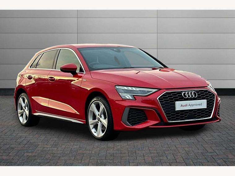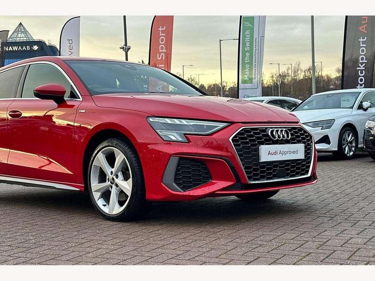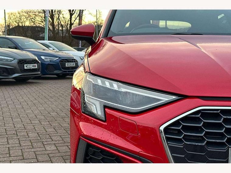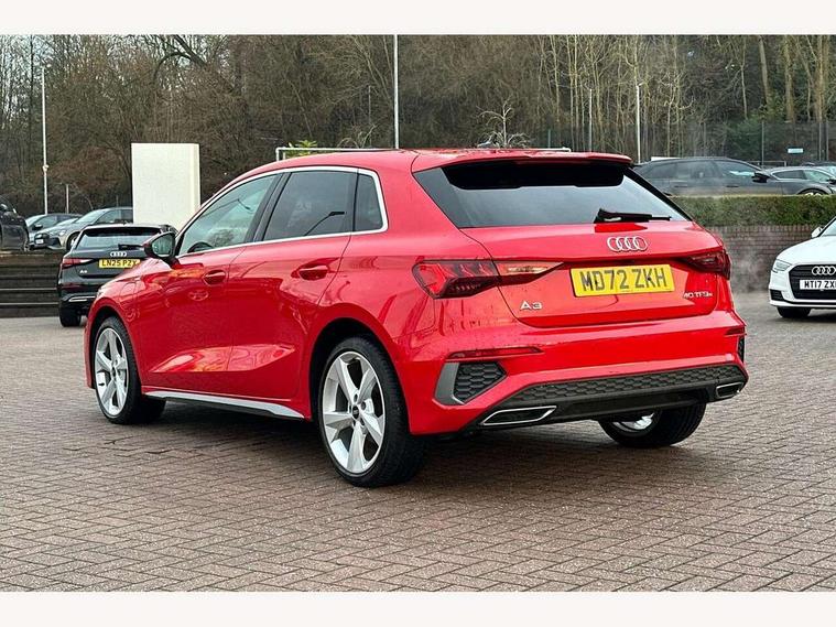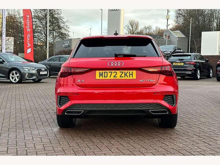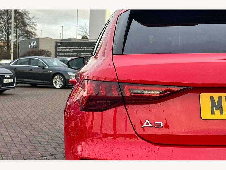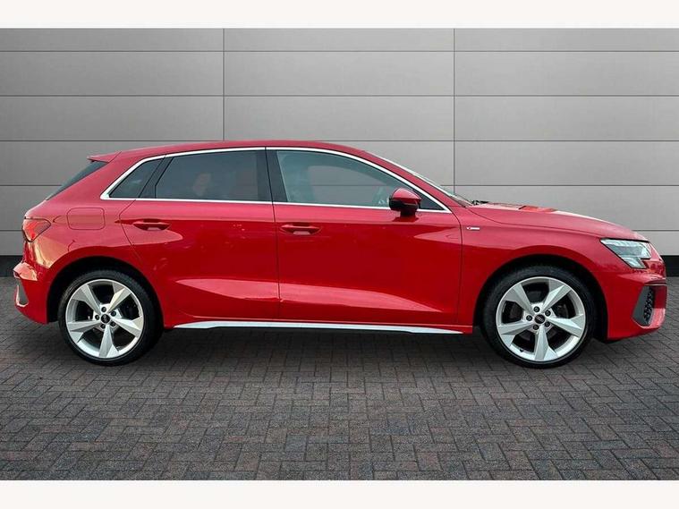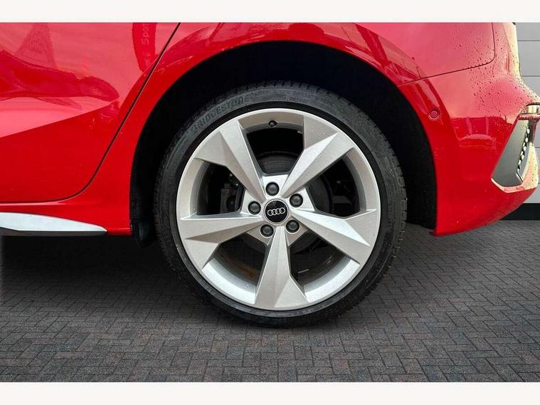 Audi drive select (Auto, Comfort, Dynamic, Efficiency and Individual), Audi smartphone interface, Audi Virtual Cockpit - 10.25" digital and colour instrument cluster, Automatic start/stop system with recuperation, Bluetooth interface, Collision avoidance assistant, e-Call (emergency call), Electromechanical power speed sensitive steering, Lane departure warning system, MMI Navigation Plus with high resolution 10.1" colour touch screen display, Service indicator, Trip computer, Voice control system with natural language interaction, 3 pin 10 amp domestic charging cable, 3.6 kw On-board charger, Standard suspension, Type 2 mode 3 32 amp charging cable, Type 2 socket for AC charging, 2xUSB-C connection with data and charging functions, 6 passive loudspeakers, DAB Digital radio, 3rd brake light, Acoustic glass windscreen, Aluminium window trim, Auto dimming frameless rear view mirror, Electrically adjustable/heated/folding/auto dimming door mirrors with integrated LED indications + kerb view function for passenger side, Front electric windows, Illuminated aluminium inserts front door sills with S logo, LED daytime running lights, LED headlights with LED rear lights and dynamic rear indicators, Light and rain sensors, Privacy glass - dark tinted rear window, rear door and side windows, Rear electric windows, Rear side air outlets in grained matt black, Rear side wing doors, Rear wiper, S line bumpers, S roof spoiler, 12V socket and storage compartment in front centre console, 3 seat bench in 2nd row, 40/20/40 split folding rear seat bench with cupholder, Black cloth headlining, Dual zone electronic climate control, Front and rear centre armrest in leather, Front and rear headrests, Front/rear floor mats, Height and reach adjustable steering wheel, Illuminated vanity mirror, Interior lighting - glove compartment light and right hand side, Luggage compartment floor covering, Manual boot compartment lid, Manually adjustable front seats, Seat side bolsters, Single front passenger seat, Stainless steel pedals and front footrest in black, Twin leather upholstery with front sports seats S embossed logo, Aluminium interior elements pack - A3 Sportback, LED interior lighting pack - A3 Sportback, S line styling pack - A3 Sportback, 3x3 point rear seat belts, Audi pre sense front, Driver and front passenger airbag with passenger airbag deactivation, Electronic Stabilisation Control (ESC) including ABS, ASR and EDL, First aid kit with warning triangle and 2 safety vests, Front side airbags with head airbags and interaction airbag, Pre-sense front with pedestrian and cyclist detection, Seatbelt monitoring, Tyre pressure loss indicator, Anti theft alarm, Anti-theft wheel bolts, Electronically operated child lock, Immobiliser, Remote control central locking, Accent surfaces in the dashboard and centre console in platinum grey silk effect paint finish, Dark spectrum aluminium inlays, Tool kit, Tyre repair kit,