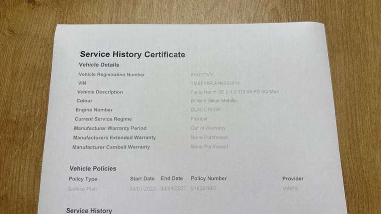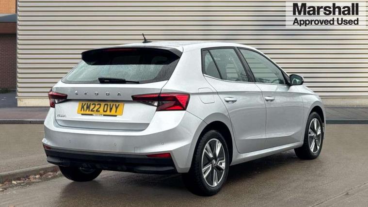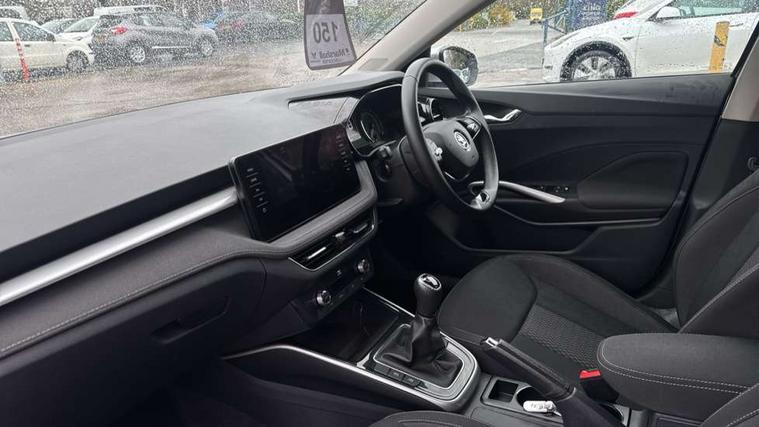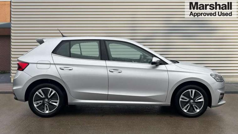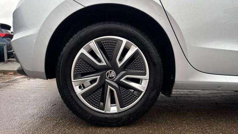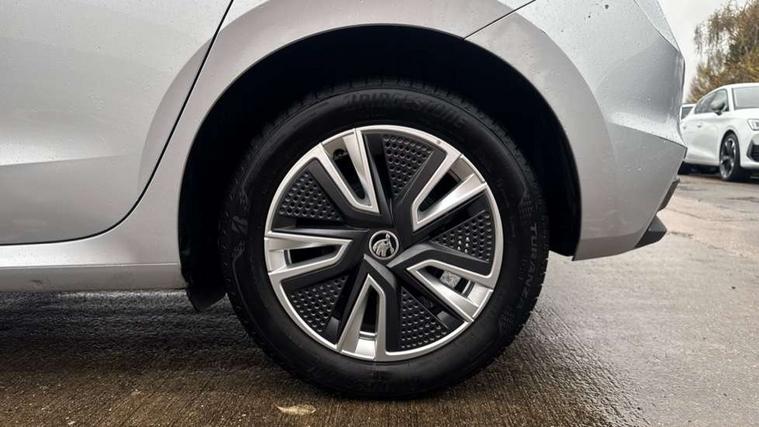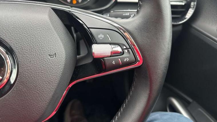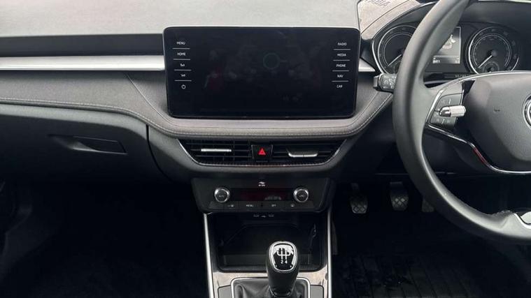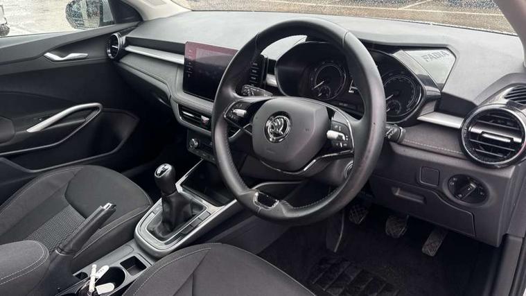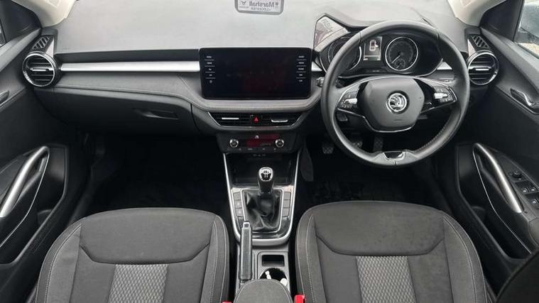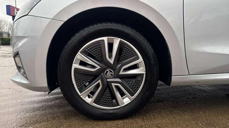 Bluetooth connection, Driver alert system - DAS, Electromechanical power steering, Exterior temperature gauge, Service interval indicator, 2x USB-C in the front (for data transmission and charging), 6 Speakers (4 in front and 2 in rear), Auxiliary socket for external MP3 player, DAB digital radio reception, Web radio, Auto dimming rear view mirror, Basic rear light, Body colour door mirrors, Body coloured bumpers, Chrome window surround, Door mirror integrated indicators, Electrically adjustable and heated door mirrors, Front and rear electric windows, Front window wiper intermittent control, Headlight range control - Automatic, Ice scraper in fuel cap, LED daytime running lights with coming and leaving home feature, Rear LED fog light, Rear side wing doors, Rear window wiper with washing nozzles, Roof mounted spoiler, SKODA tailgate lettering in chrome, Third brake light, 3 rear headrests, Backrest split and folding, Central console with fixed cup holder and storage box, Chrome handbrake release button, Comfort seats, Fabric upholstery, Front centre armrest, Gearshift knob/handle in leather, Hand brake lever handle in leather, Height adjustable front headrests, Height adjustable front seats, Height adjustable steering wheel, ISOFIX and TopTether anchorage points to the outer rear seats, ISOFIX and TopTether on the front passenger seat, Luggage compartment lighting, Manually adjustable lumbar support in front seats, Pollen filter, Rear seat bench unsplit, Removable cup holder, Single front passenger seat, Storm grey headlining, Sun visors with mirror and airbag label on passenger side, Textile floor mats, Ticket holder, Umbrella in drivers door, Ambient lighting pack 2 - Fabia Hatchback, 3-point height adjustable front seats belts with pretensioner and force limiter, Automatic warning lights in case of crash, Driver and passengers airbag with switch off function, e-Call+, ESC including ABS, MSR, ASR, EDS, HBA and XDS, Front and rear seat belt warning, FRONT ASSIST (AEB City and AEB Inter Urban), Front side airbags, Head airbags, One tone horn, Pedestrian protection, Three rear 3-points safety seat belts with pretensioner and force limiter including stop function for outer rear seat belts, Tyre pressure monitoring system, Anti-theft alarm system including immobiliser, interior monitoring, backup horn, and towing protection, Chrome edged air vents, Satin black door and side trim panel in front, Anti-theft wheel bolts protection, Super-low rolling resistance tyres,