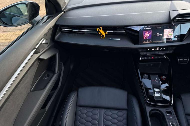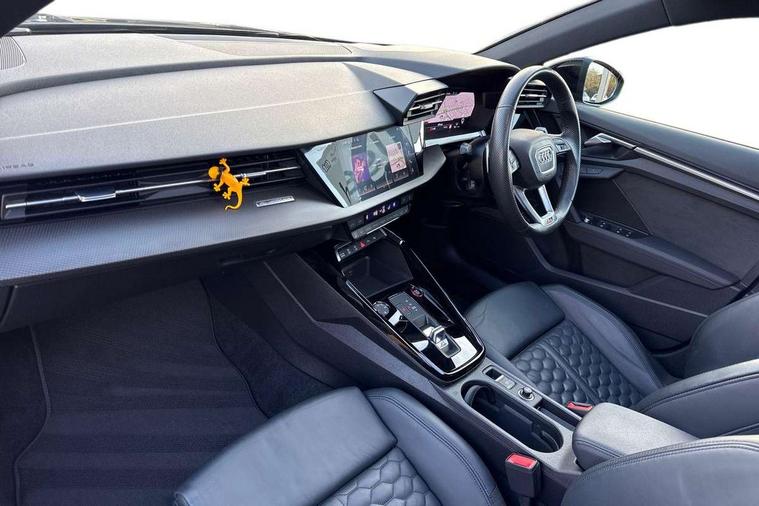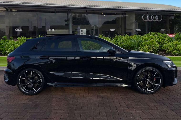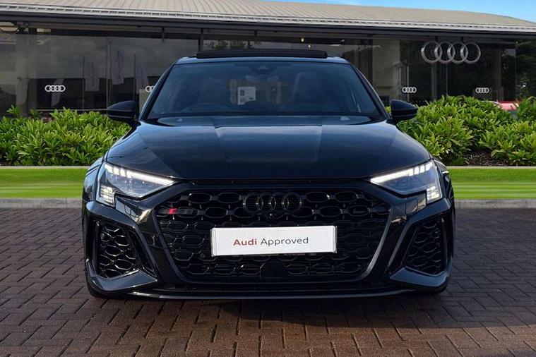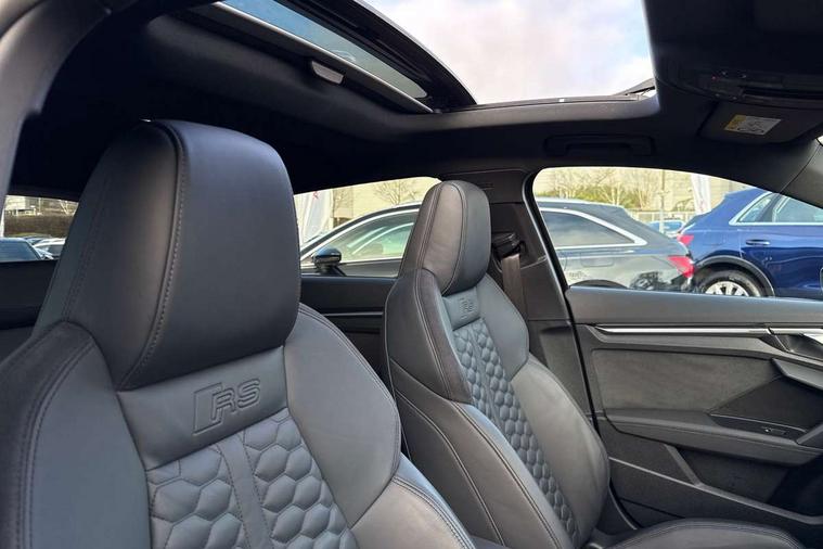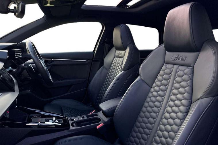 Adaptive cruise assist, Adaptive cruise control, Audi connect emergency call and service, Audi smartphone interface, Audi virtual cockpit with RS specific display 12.3" full colour digital instrument cluster, Automatic start/stop system with recuperation, Bluetooth interface, Camera based traffic sign recognition, Collision avoidance assistant, Head up Display, Lane departure warning system, Legal emergency call, Parking assist with parking system plus, Power operated tailgate - Luggage compartment lid opens electrically, Progressive power assisted steering, Reversing camera, Quattro permanent four wheel drive, Rear suspension, DAB Digital radio, 3rd brake light, Acoustic glass windscreen, Audi beam uses LEDs to project the Audi sport logo onto the ground as you exit your RS 3, Audi matrix LED headlights, LED rear lights, dynamic front and rear indicators and headlight cleaning system, Auto dimming rear view mirror, Black side skirts, Body colour roof, Carbon exterior door mirror, Carbon fibre engine cover, Daytime running lights, Electric adj heated/folding + auto dimming exterior mirrors with memory + LED indicator + auto kerb side function for passenger side exterior mirror, Front spoiler in high gloss black, Heat insulating glass windscreen, Light and rain sensors, Panoramic glass sunroof, Privacy glass - dark tinted rear and rear side windows from B-pillar backwards, Rear side wing doors, Rear window wiper and washer system, RS exterior features in gloss black, RS sports exhaust system, 3 seat bench in 2nd row, 3 spoke leather multifunction steering wheel with gear shift paddles, 4 way lumbar support for front seats, 40/20/40 split folding rear seat bench, Black cloth headlining, Dual zone electronic climate control, Electrically adjustable front seats with memory function for driver's side, Front and rear headrests, Front centre armrest, Front sports seats RS embossed logo, Front/rear floor mats, Heated front seats, Honeycomb stitching and RS embossing, Illuminated door sill trims inlays in aluminium with RS 3 logo, Illuminated vanity mirror, RS emblems, Single front passenger seat, Stainless steel pedals and front footrest in black, Aluminium interior elements pack - RS3, Ambient lighting pack - RS3, Comfort and sound pack - RS3, Driver assistance pack with 3 spoke leather multi function steering wheel - RS3, MMI navigation plus with MMI touch - RS3, RS bodystyling - RS3, Storage Pack - RS3, 3x3 point rear seat belts, ABS/EBD, ASR, Audi pre sense front, Driver/Front Passenger airbags, EDL, ESC - Electronic Stability Control + traction control, Front passenger airbag deactivation, Front side airbags with head airbags and interaction airbag, Hill hold assist, Seat belt reminder with passenger presence detection in rear, Tyre pressure loss indicator, Warning triangle and first aid kit, Anti theft alarm, Anti-theft wheel bolts, Electronically operated child lock, Remote control central locking, Full decorative carbon trim, 19" 5 Y spoke black with graphic print alloy wheels, Tool kit, Tyre repair kit,