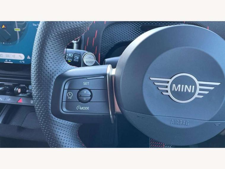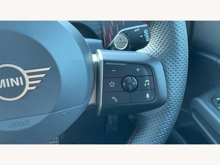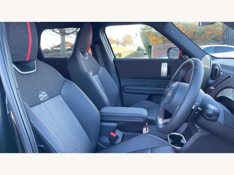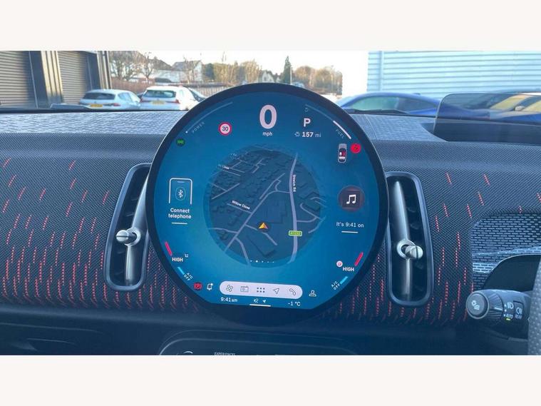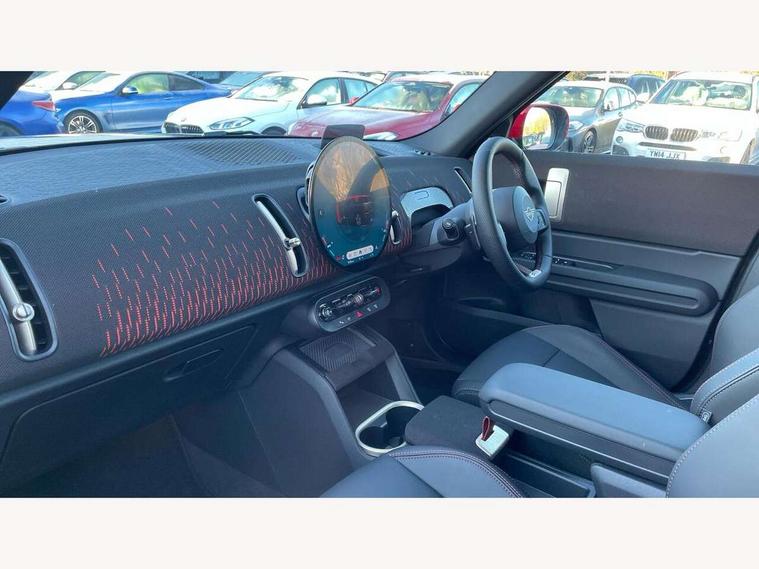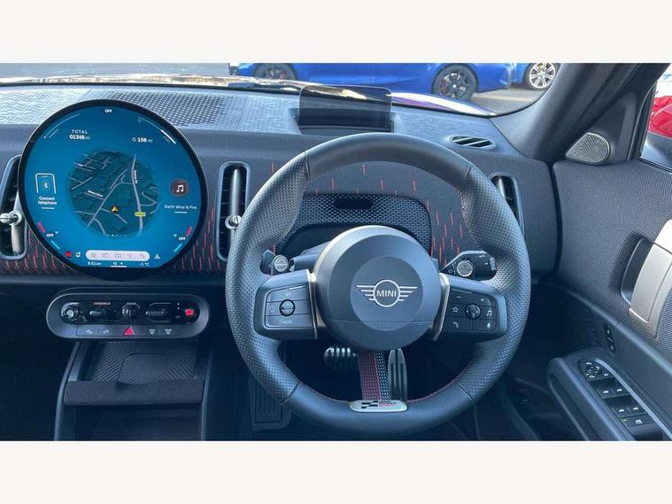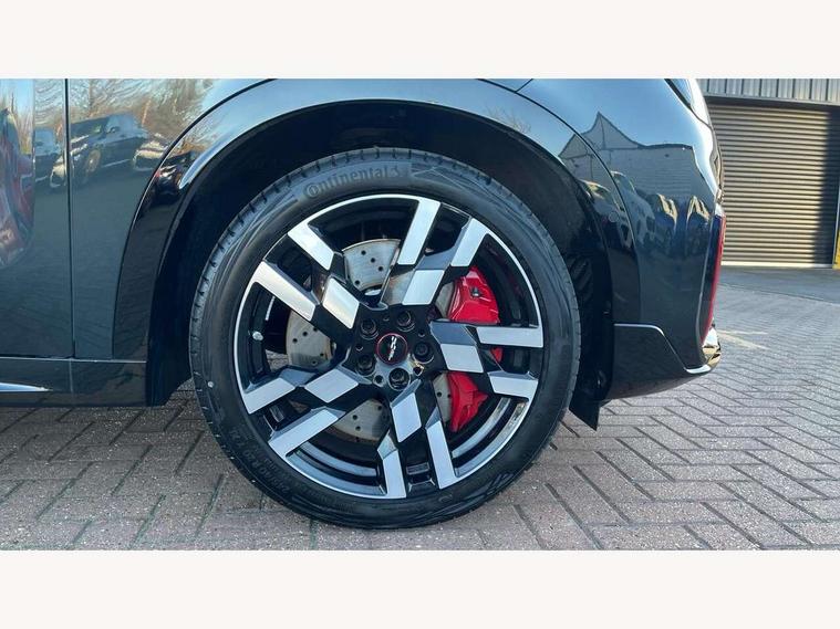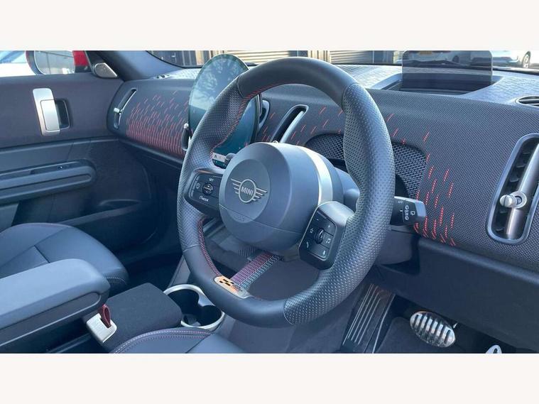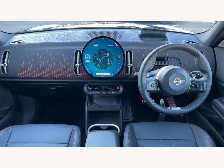 Bluetooth connection, Circular OLED Screen, Compatible mobile phone bluetooth with audio streaming, Cruise Control (DCC), Digital dashboard display, Driving assistant, Driving Assistant Plus Preparation, E-call, Electro-mechanical speed dependant steering assistance, MINI Experience Modes, MINI Head up display, Mini navigation system, MINI TeleServices, Parking assistant in camera and ultrasound based assistance system, rear view camera, parking aid and distance control, Adaptive suspension, Double clutch sports transmission, Larger capacity fuel tank, Quad exhaust system, DAB Digital radio, Harman Kardon surround sound system, Personal eSim, Auto tailgate, Electric adjustable heated door mirrors, Front and rear apron, Front and rear electric windows, Heated rear window, High beam assistant, High gloss hexagonal patterned grille surround, Interior rear-view mirror with automatic anti-dazzle function, LED daytime running lights, LED headlights with extended contents including Adaptable light signatures, LED rear lights, LED third brake light, Rain sensor with auto headlights, Rear roof spoiler with airblades, Rear side wing doors, Rear window wiper, Roof rails, 3 seat bench in 2nd row, 60/40 split rear bench seat, Anthracite headliner, Auto air conditioning, Driver and front passenger seat heating, Floor mats, Front armrest, Front headrests, Heated steering wheel, Height and length steering column adjustment, JCW Front sports seats, Lidded storage box in Black/Red knit, Luggage compartment separating net, Perforated Vescin steering wheel, Rear headrests, Seat adjustment for rear seats, Single front passenger seat, Sunvisors with vanity mirrors, Wireless charging tray, Interior and exterior mirror package - Mini Countryman, 3x3 point rear seat belts, 6 Airbags - front, side, head and seat belt tensioners, ABS, DSC - Dynamic Stability Control, Electronic handbrake, Electronic Stability Programme (ESP), Front ISOFIX (iSize), Hill descent control, Hill hold assist, Hill start assist, JCW logo in brake calipers, JCW Sport brakes with Chilli Red calipers, Manual rear child locks, Traction control, Tyre pressure monitoring system, Warning triangle, Alarm system with tilt sensor, monitoring doors, bonnet interior and tailgate, Auto drive away locking, Comfort access system, Deadlocking function, Electronic vehicle immobiliser, Locking wheel bolts, Remote control locking, Start/stop toggle with keyless go, 19" JCW Runway Spoke Black alloy wheels, Tyre repair kit plus,