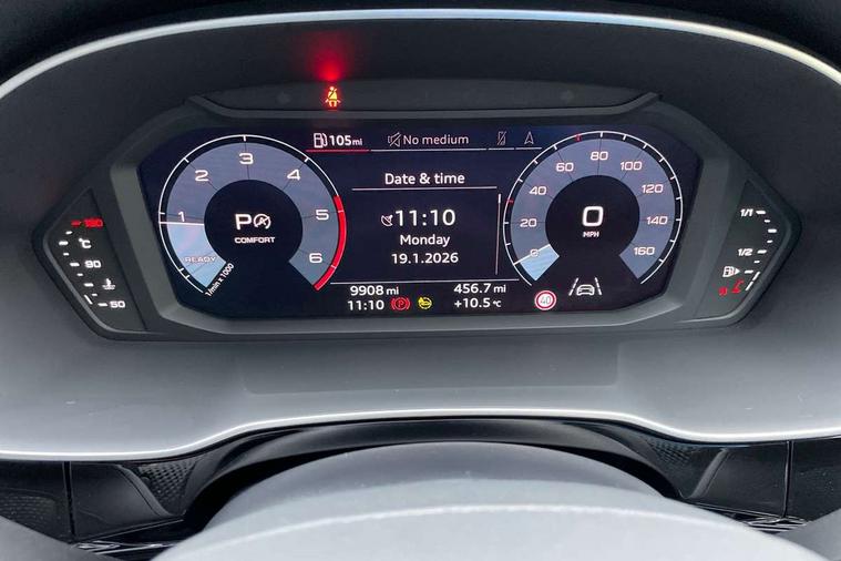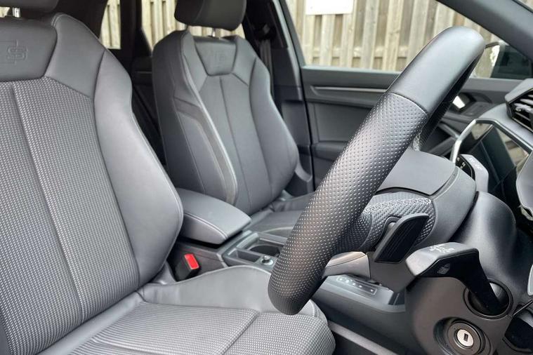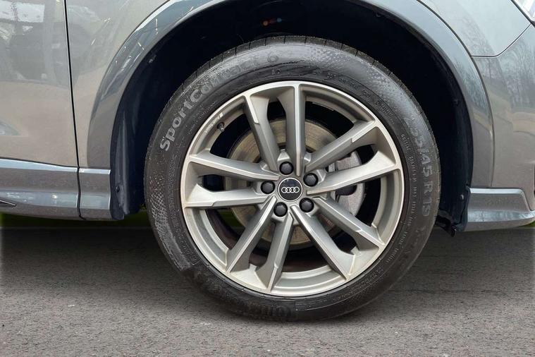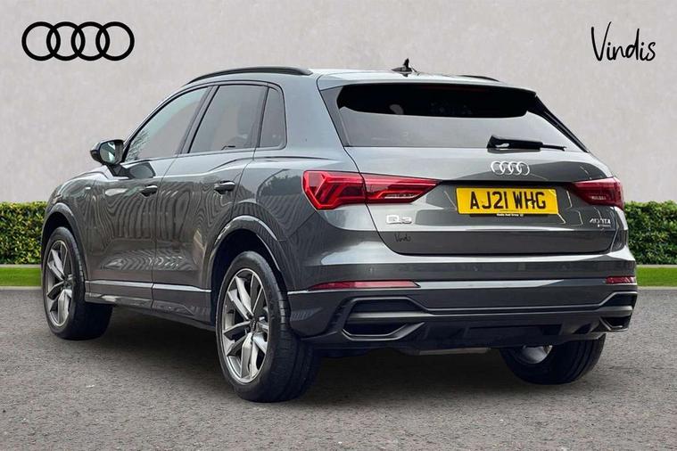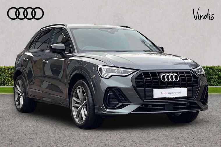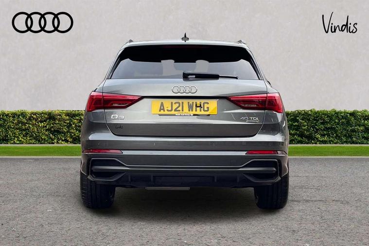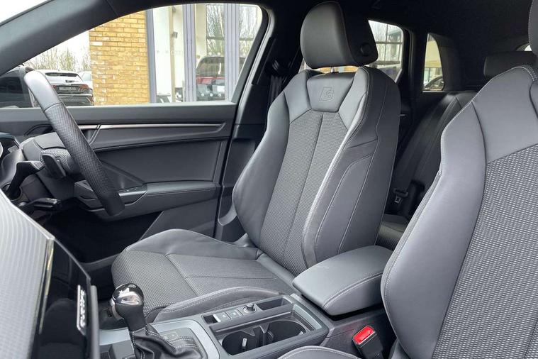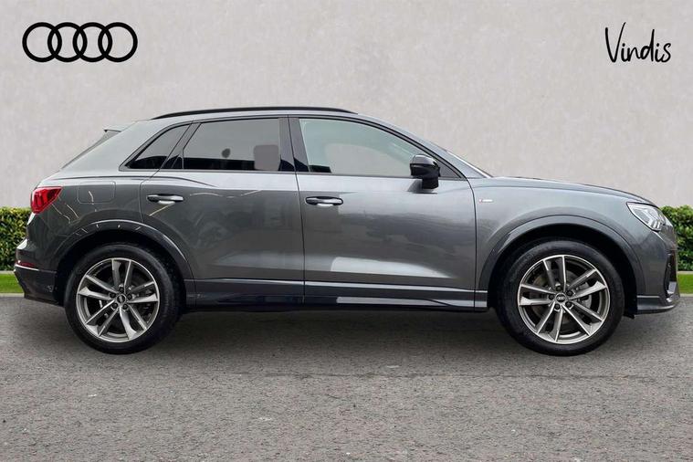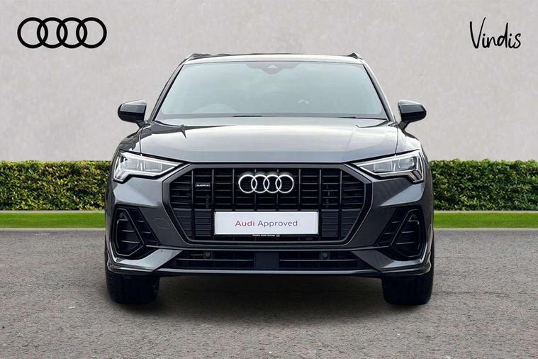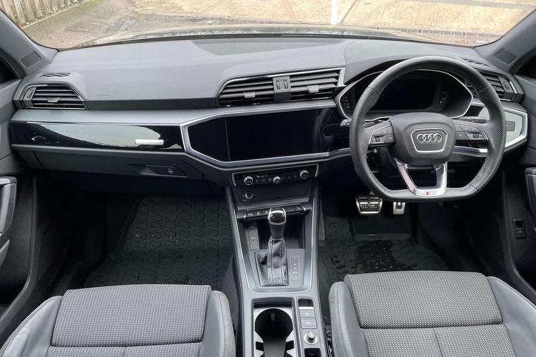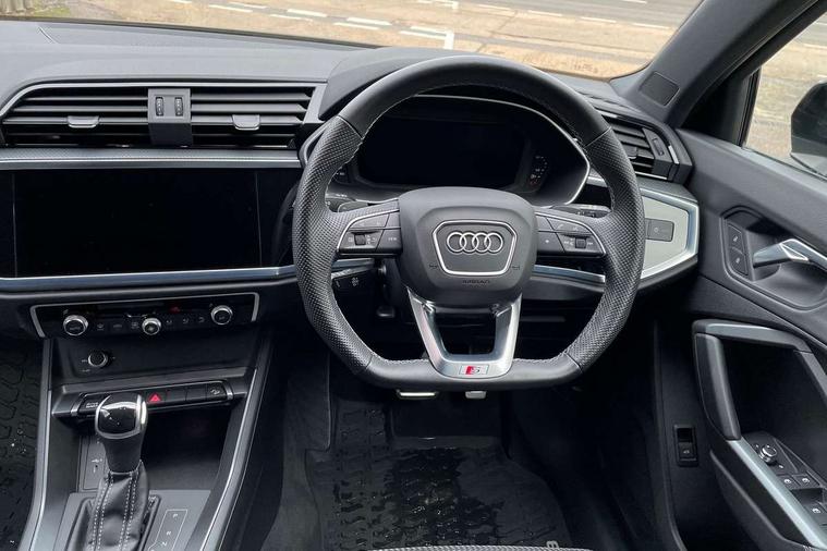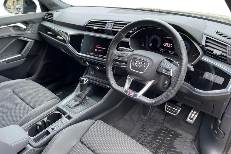 Amazon alexa Integration, Audi connect safety and service (e-call), Audi drive select, Audi lane departure warning, Audi Virtual Cockpit - 10.25" display, Bluetooth interface, Camera based traffic sign recognition, MMI Navigation Plus with high resolution 10.1 inch touchscreen colour display, Power operated tailgate, Progressive steering, Service interval indicator, Smartphone interface includes wireless Apple carplay/Android Auto, Start stop system with recuperation, Voice control system with natural language interaction, Diesel particulate filter, Sports suspension, 2 USB-C ports with charge and data functions, 6 passive loudspeakers, DAB digital radio module, Acoustic windscreen, Auto dimming frameless rear view mirror, Black roof rails, Electrically folding, adjustable and heated door mirrors with integrated LED side indicators and kerb view function for passenger side, Front and rear electric windows, Front fog lights, Grille vertical bars in aluminium silver/Matt, High gloss black finish B and C pillars, LED headlights with LED daytime running lights and dynamic rear indicator, LED rear lights, Privacy glass dark tinted rear and rear-side windows (from B-pillar backwards), Rain and light sensors, Rear diffuser strip in matt titanium black, S line bumpers in contrasting Manhattan grey, 12V socket in rear centre console, 40:20:40 folding with manual adjustment for 60:40 forwards/backwards position and backrest angle, Adjustable rear seat bench/backrest with centre armrest and cupholder, Black cloth headlining, Dual zone electronic climate control, Front and rear black floor mats with contrast stitching in rock grey, Front and rear headrests, Front and rear roof module including reading lights, Front centre armrest, Glove compartment lighting, Height and reach adjustable steering wheel, Illuminated door sill trims with S logo, ISOFIX child seat mounting for front passenger with airbag deactivation and outer rear seat including top tether attachment point for outer rear seats, Luggage compartment light, Manual front seats with height adjustment, Perforated leather gearknob, Stainless steel luggage compartment sill finisher, Stainless steel pedals, Black styling pack - Q3, Non smoking pack - Q3, 3x3 point rear seatbelts, 6 airbags - Driver, front passenger, curtain and side windows, Audi pre-sense front with pedestrain and cyclist recognition, Electrically operated child locks on rear doors, Electromechanical parking brake, Electronic stabilisation control including ABS, ASR and EDL, Hill descent control, Hill hold assist, Pre sense basic, Seatbelt monitoring, Tyre pressure warning, Warning triangle and first aid kit, Anti theft alarm, Anti theft wheel bolts, Remote central locking, Detail dashboard around MMI touch colour display in glass look, black with surround in aluminium look, Leatherette door armrest, Piano black inlay,