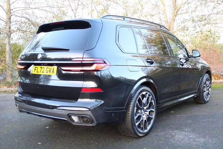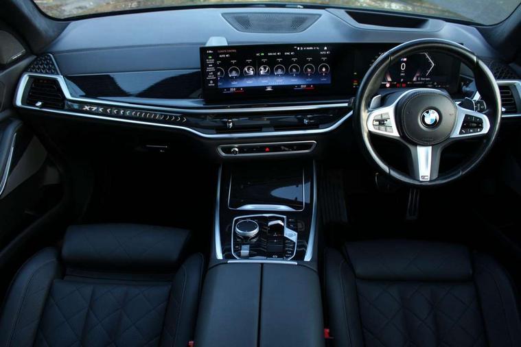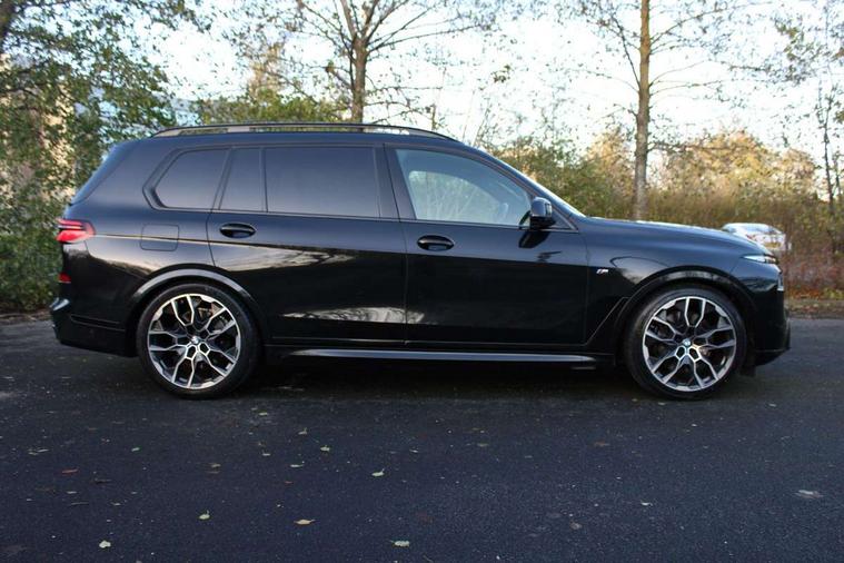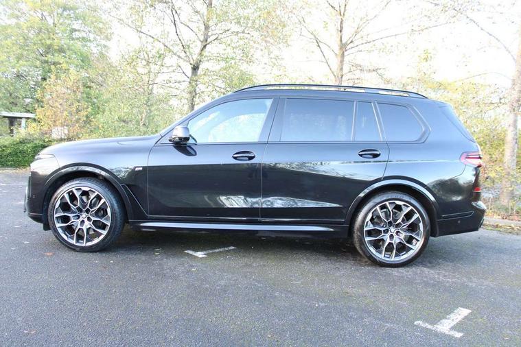 Attentiveness assist, Automatic start/stop function, Automatic tailgate operation, BMW ConnectedDrive online services, BMW Drive recorder, BMW gesture control, BMW Teleservices, Brake pad wear indicator in front and rear, Condition based service, Electric power steering with Servotronic steering optimised at all speed ranges, Integrated owner's handbook, Live Cockpit Professional with head up display including 12.3" instrument cluster and 14.9" central display, Parking assistant pro including reversing assistant, PDC, lateral parking aid, reversing assist camera, parking drive off monitoring, Speed limiter, 48V Mild hybrid technology, 8 speed automatic with steptronic transmission including automatic hold function and gearshift paddles on the steering wheel, Drive experience switch with comfort mode + ECO PRO + sport mode, Permanent all wheel drive, DAB radio, Acoustic glazing, Adaptive air flap control bars in high gloss black, Adaptive LED Headlights, Air breather and door claddings in high gloss chrome, Aluminium roof rails, Body coloured wheel arches, Dynamic brake lights with LED technology, Electrically adjustable and heated aspheric folding side mirrors with auto dimming, electric fold in function, automatic parking function, Exterior and central air inlets in front bumper painted pearl chrome, Follow me home headlight function, Frameless interior mirror, Front and rear electric windows, Front ornamental grille struts in chrome high gloss, Heated windscreen washer nozzles, High beam assist, High gloss black shadowline trim in side/window frame, window recess cover, window guide, B and C pillar, mirror triangle, mirror base, mirror frame, Integrated turn indicators, Kidney grille iconic glow, LED daytime running lights, LED rear lights, LED third brake light in rear spoiler, One piece front ornamental grille frame in pearl gloss chrome, Rain sensor with automatic headlight activation and windscreen wiper control, Rear side wing doors, Sump guard front and rear painted in silver, Trailer stabilisation logic, 12V - Power sockets with 2x centre console and 1x luggage compartment, 2 seat bench in 3rd row, 2x cupholders in front and rear centre armrest in 3rd row, 2x cupholders in front, rear centre armrest and two in third row seats, 3 seat bench in 2nd row, 40:20:40 split folding rear seat backrests, Additional storage compartments, BMW inscription in front and rear door entry sills with illuminated, Centre console includes storage compartment, Compartment in front of cupholder, Driver and front passenger sunvisors with illuminated vanity mirrors and ticket holder, Electrical steering column with adjustable height and length with activation and control on the steering column, Front and rear colour co-ordinated with all standard carpet colours, Front and rear door pockets, Front and rear side armrests integrated into door trim, Grab handles, Height adjustable front headrests, Height adjustable rear headrests, Lockable glove compartment, M leather steering wheel, Nano filter, Single front passenger seat, Soft close doors, Storage tray and compartment with lid in centre console, Wireless charging tray, Additional storage compartment pack - X7, Ambient light interior pack - X7, Connected Package Professional - X7, Interior lighting pack - X7, Luggage compartment pack - X7, M aerodynamics pack - X7, 3 point seatbelts on all seats, front pyrotechnic belt tensioners, stopper and belt force limiters, front and outer rear seats, Acoustic protection for pedestrians, Active protection, Airbag - Front driver and passenger, side airbags and Head airbags, Anti lock braking system (ABS) with cornering brake control, Automatic Stability Control (ASC), BMW emergency call, Child seat ISOFIX attachment rear outer seats in 2nd row and both seats in 3rd row includes top tether, Comfort cushion seats for outer seats in 2nd row, Crash sensor inclu activation of airbags, interior light, safety battery terminal clamp, hazard warn flasher, unlock doors, deactivation of fuel pump, DSC - Dynamic Stability Control, Dynamic Traction Control - DTC, Electromechanical parking brake with automatic drive away release and auto hold function, Front and rear brake discs with interior ventilation, Hill descent control, Integrated braking system, Manual child lock in rear doors, PC iBrake PostCrash approach control warning with light braking function, Tyre pressure monitoring system, Tyre pressure sensors, Variable torque distribution, Warning triangle and first aid kit, Alarm, Central locking including 2 vehicle keys with integrated emergency key, Comfort access system, Engine immobiliser, Locking wheel bolts, Galvanic embellisher for controls,