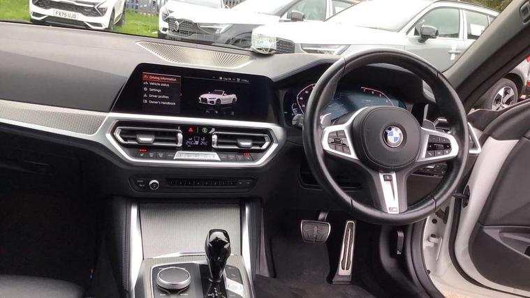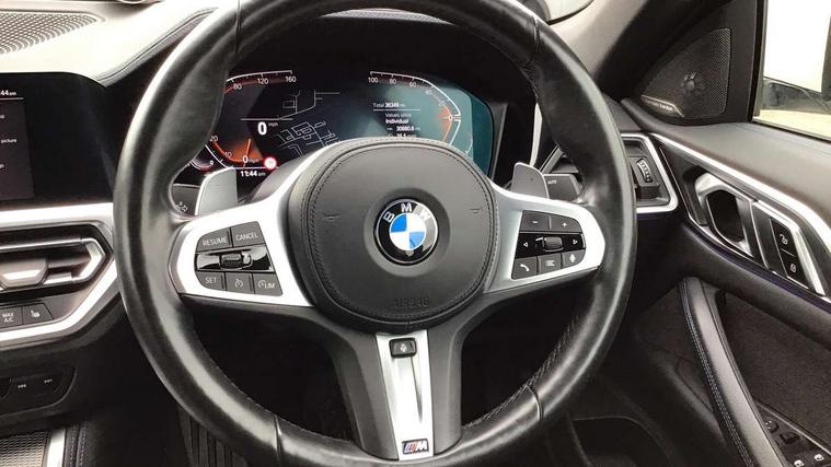 Active guard plus, Attentiveness assist, Auto start-stop, BMW ConnectedDrive online services, BMW Live Cockpit Professional Nav with 12.3" instrument display + 10.25" display, Intelligent Voice Assist, BMW OS 7, HDD, 2USB, 4G LTE connect, BMW service history, BMW Teleservices, Brake pad wear indicator in front and rear, Check Control warning system for monitoring of lights and door/luggage compartment open warning, Condition based service, Cruise control with brake assist, Electric power steering with Servotronic steering optimised at all speed ranges, Gearshift time display in manual mode, iDrive controller on centre console, Instrument cluster with speedometer with mph readout, tachometer, fuel gauge and oil temperature gauge, Integrated owners handbook, Oil sensor for level and grade, warning by check control system, On board computer - average speed, fuel consumption, outside temp display with acoustic warning, clock/date, service interval, odometer/trip meter, Optimum shift indicator, Variable sport steering, 8 speed automatic steptronic transmission with gearshift paddles, Balanced 50/50 weight distribution, Double VANOS, Drive performance control - ECO PRO, comfort and sport modes, High precision injection, Low centre of gravity, M sport suspension, Petrol Particulate Filter, Stroke dependent dampers, VALVETRONIC engine management, DAB tuner, Electronic service booklet, Acoustic glazing, Automatic headlight beam throw control with load dependent regulating reaction, dynamic compensation of braking dive and acceleration squat, Automatic windscreen wipers and automatic headlight, Automatically dimming electrochromatic rear view mirror, BMW emblem on engine compartment lid and tailgate, BMW kidney grille with mesh grille front side of the nuggets in matt aluminium and frame in chrome high gloss, Body colour fuel filler flap, Body colour roof fin, Brushed aluminium inserts in the front door sill finishers with BMW designation, Dynamic brake lights, Electric windows - front and rear, with open/close fingertip control, anti trap facility and comfort closing function all round, Exhaust tailpipe - split left and right, Exterior mirrors - electrically folding with anti-dazzle, Fading support, Front and rear bumper system, Front apron plastic in body colour, Green tinted heat protection glazing, High gloss shadow line exterior trim, Illuminated bow type door handles in body colour drivers side with door lock, Interior rear view electrochromatic mirror with automatic anti dazzle function, LED daytime running lights, LED front fog lights, Licence plate panel integrated into front bumper and tailgate, Lightweight engineering, M designation on front side panels, left and right, Model designation on right side of tailgate, One piece front bumper cover including towing eye cover in body colour, Preparation for high beam assistant, Rear boot, Side frame decorative moulding black matt, Third brake light, Two part LED tailights in L-shape with components in smoked glass, brake light, LED turn indicator and rear fog light, Visible VIN plate, Welcome lights in interior and door handle area, Widened track and increased camber values for max transverse dynamics, agility and steering precision, Window recess cover black high gloss, Windscreen wipers with integrated heated washing jets, 12V power socket in front centre console, 2 2nd row folding seats, 2 front cupholder in centre console with clamping elements and matt black inlay, 2 Rear seat headrests, 2nd row centre armrest with built-in cupholders, 3 spoke M sport leather multifunction steering wheel, 3 zone automatic air conditioning, 4 pieces lashing eyelets in luggage compartment, Ambient lighting with welcome carpet light, Armrest integrated in front and rear door trim + front centre console armrest, Electric seat adjustment with memory, Four grab handles integrated in roof lining, Front and rear door exit lighting (left / right), Front and rear door pockets, Front and rear footwell lights, Front and rear reading lights, Front headrests, Front seat backrest width adjustment, Front sport seats, Heated driver and front passenger seats, Height adjustable mechanically and infinitely variable steering column, Illuminated armrest storage compartment, Illuminated glove compartment with separate small compartment, Luggage compartment light, Make-up mirror lights, Single front passenger seat, Storage compartment in rear centre console, Sunvisors with vanity mirrors and ticket pocket, Toolkit located in luggage compartment, USB type - C cable charging function in the rear centre console, Velour front floor mats, Vernasca leather upholstery, Connected professional package - 4 Series, M sport exterior styling pack - 4 Series, Park assist pack - 4 Series, 2 x 3-point rear seat belts, Battery safety cut-off, BMW emergency call, Brake energy regeneration, Braking pre-tensioning, CBC - (Cornering brake control), Child proof rear door locking, Coasting in idle in ECO PRO mode, Crash sensor activating of airbags, Unlocking doors, hazard warning lights, fuel cut off, interior lighting+activation of safety battery terminal clamp, Driver and front passenger side airbags, integrated in the door side seat backrest bolsters for all seat variants, Driver/Front Passenger airbags, Dry braking, Dynamic brake control, Dynamic stability control + (DSC+) - Anti-lock Braking System (ABS) with brake assist and cornering brake control + Automatic Stability Control (ASC), Dynamic Traction Control - DTC, Electromechanical parking brake including automatic hold function and automatic release of the parking brake when pulling away, Electronic differential lock control (EDLC), Front and rear ventilated brake disc, Front passenger manual airbag deactivation, Head airbags for all 4 outer seats, Hill start assistant, Seat belt security check for driver and front passenger, Seat belt with belt stopper, pyrotechnic belt tensioners and belt force limiters, Side impact protection, Tyre pressu