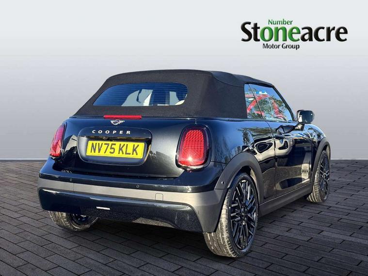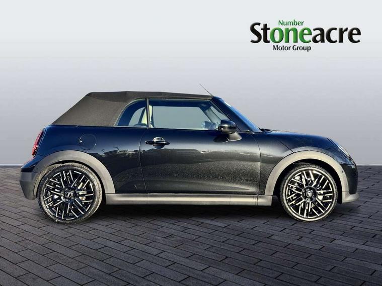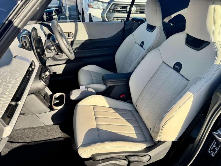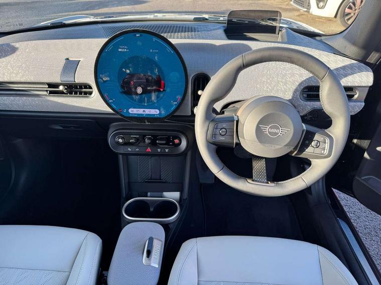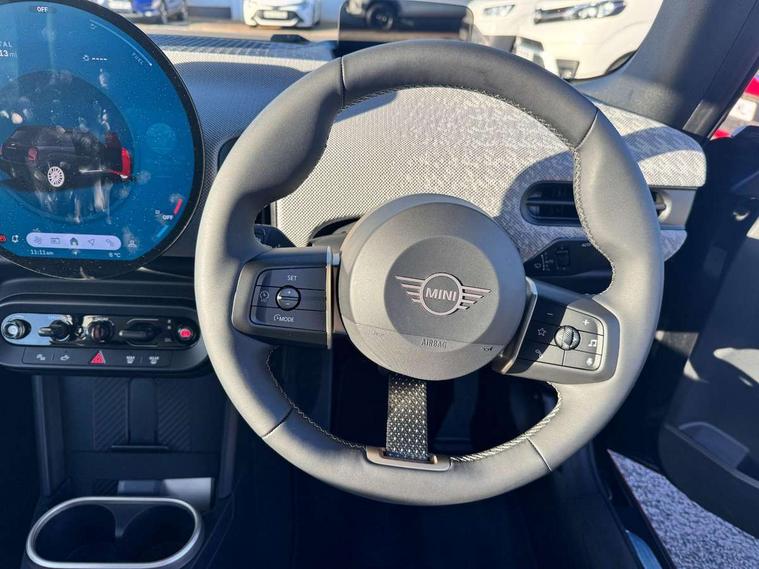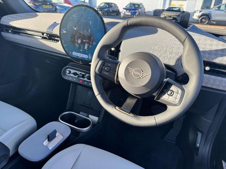 Always open timer, Central toggle bar, Circular OLED Screen, Compatible mobile phone bluetooth with audio streaming, Cruise control, Digital instrument cluster, e-Call (emergency call), MINI Experience Modes, Mini navigation system, On board computer, PAS, Service interval indicator, 7 speed steptronic transmission with double clutch, DAB Digital radio, Personal eSim, Auto headlights, Electric front windows, LED 3rd brake light, LED daytime running lights, LED Headlights, LED indicator lights, LED rear lights, Logos in Vibrant Silver, Rain sensor window wipers, Rear boot, Rear fog lights, Vibrant silver grille surround, Wind deflector, 2 seat bench in second row, 2 zone automatic air conditioning, 60/40 rear seat bench, Ambient lighting, Floor mats, Front and rear head restraints, Front compact armrest, Heated steering wheel, Height adjustable passenger seat, Lidded storage box in grey knit, Light headliner, Luggage compartment lighting, Single front passenger seat, Sport Vescin Steering Wheel black with vibrant silver accents, Sunvisors with vanity mirrors, Vescin synthetic leather upholstery includes dash knit in beige with grey accents, Driving assistant pack - Cooper Convertible, Park assistant pack - Cooper Convertible, 3 point seatbelts on all four seats, 6 Airbags - front, side, head and seat belt tensioners, Anti-lock braking system (ABS), DSC - Dynamic Stability Control, Electronic parking brake, Front and rear disc brakes, Front ISOFIX (iSize), Front passenger airbag deactivation, Traction control, Tyre pressure monitoring system, Alarm, Immobiliser, Physical spare key (not digital), Remote central locking, Blue decorative dash strap, Tyre repair kit,