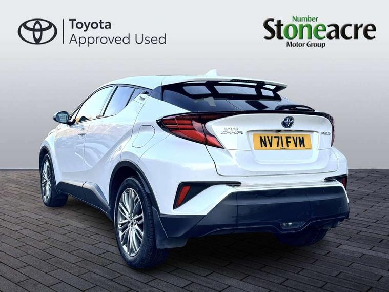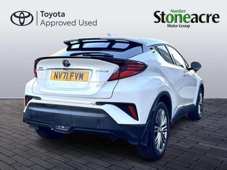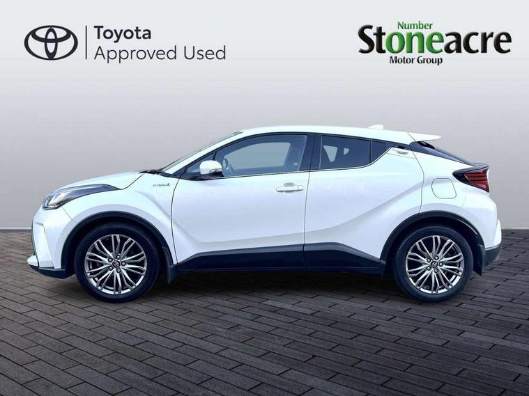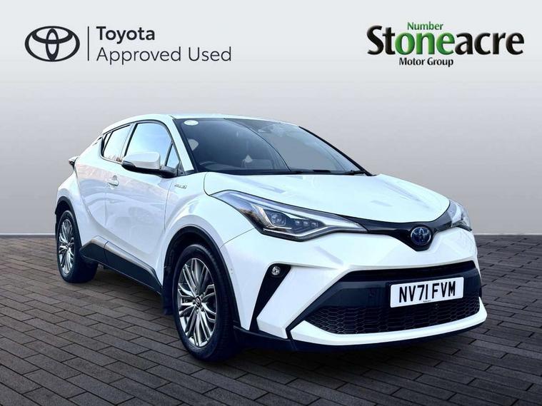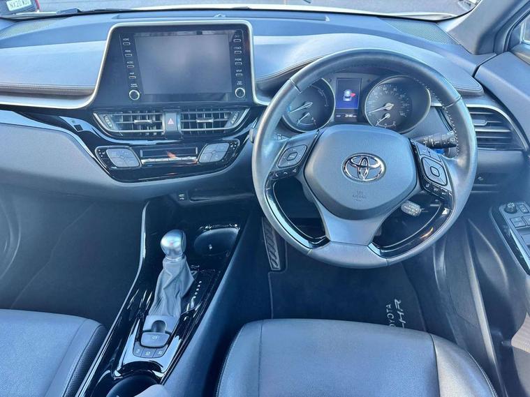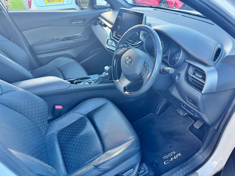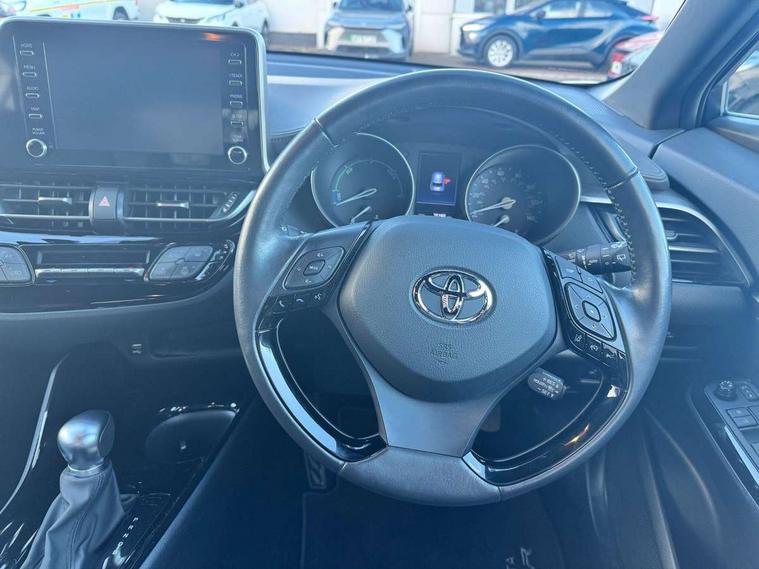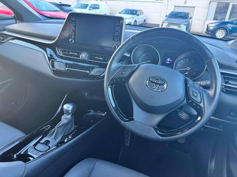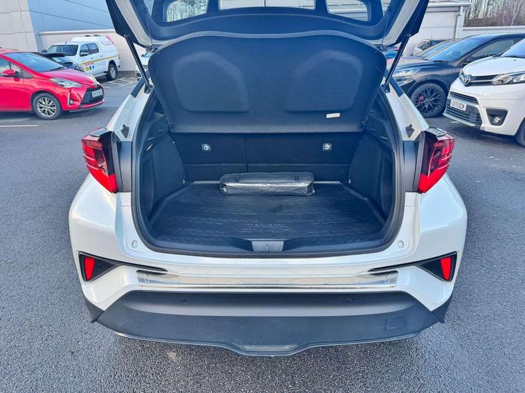 4.2" coloured TFT screen for multi-information display, Adaptive cruise control, Bluetooth connectivity, E-call, Electric power steering, Hybrid system indicator, Lane departure alert with steering control, Remote boot door release in cabin, Remote boot door release in key, Reversing camera, Road sign assist - RSA, Simple Intelligent parking assist, Touch 2 Go navigation system, Trip computer, Voice recognition, Vehicle Stability Control (VSC), 6 speakers, AM/FM radio, DAB Radio (Digital Audio Broadcasting), Toyota touch 2 multimedia system with 8" display, USB connector, Wi-fi connectivity, Adaptive front light system, Adaptive LED Headlights, Anti-jam protection on power windows, Auto high beam, Auto up and down function on all power windows, Automatic headlight levelling, Automatic headlights, Automatic headlights cut-off, Black and body coloured rear bumper, Black upper front grille, Body colour door handles, Body colour door mirrors, Body colour front spoiler lip, Body coloured front bumper, Boot door release with push button, Electric heated door mirrors, Follow me home headlights, Front and rear power windows, Honeycomb lower front grille, LED daytime running lights, LED fog lights, LED front light guide, LED High mounted stop light, LED rear brake lights, LED rear combination lights, Noise reduction layer on front windows and windscreen, Power adjustable door mirrors, Privacy glass, Rain sensor, Rear sequential indicators, Rear side wing doors, Rear spoiler, Rear tailgate, Rear window defogger, Rear window wiper, Shark fin antenna, UV-filter on driver and passenger windows, UV-filter on rear windows, 12v power outlet - front, 3 rear headrests, 3 seat bench in 2nd row, 3 spoke leather steering wheel, 60/40 split folding rear seat, Adjustable rear headrests, Adjustable speed limiter switch on steering wheel, Assist grips front and centre pillar, Audio and telephone switches on steering wheel, Black front door assist grips, Blue ambient lighting on front cup holders, Blue ambient lighting on front doors, Boot light, Chrome interior door handles, Driver and front passenger personal light, Driver and front passenger Whiplash Injury Lessening seats, Driver and passenger seatback pockets, Dual zone automatic air conditioning, Floor mats, Front cupholders, Front head restraints, Front sports seats, Glovebox with internal light, Hard tonneau cover, Heated driver and front passenger seats, Heated steering wheel, Hooks for luggage holding net, Humidifying Nanoe air purifier, Illuminated entry system, Isofix attachments on outer rear seats, Leather gearshift, Light on driver sun visor, Light on passenger sun visor, Manual telescopic steering wheel, Manual tilt steering wheel, Microphone on front personal light, Mirror on driver sun visor, Mirror on passenger sun visor, Multimedia switches on steering wheel, Pollen filter, Power adjustable lumbar support on driver seat, Power tilting cushion on driver seat, Shopping bag hooks, Slow opening on lower glovebox, Voice recognition switch on steering wheel, Leather pack - C-HR, Tech with parking sensor pack - C-HR, 16 Disk front wheel brake, 3x3 point rear seatbelts, ABS+EBD+Brake assist, Electronic parking brake, Front and rear seatbelt reminder, Front passenger airbag on/off switch, Hill start assist control (HAC), Pre collision system with pedestrian detection, Pre-tensioners and force limiters, Rear door child safety locks, SRS Airbags - Driver + Front passenger, front side, front and rear curtain and driver's knee airbags, Toyota safety sense, Tyre pressure monitoring system, Acoustic vehicle alert system (AVAS), Glass-breaking alarm sensors, Immobiliser, Intrusion alarm, Intrusion sensor, Motion sensor alarm, Power door locks, Power passenger window lock, Remote central locking, Black lower dashboard, Dark brown upper dashboard, Piano black console, Silver deco line on upper dashboard, Tyre repair kit,