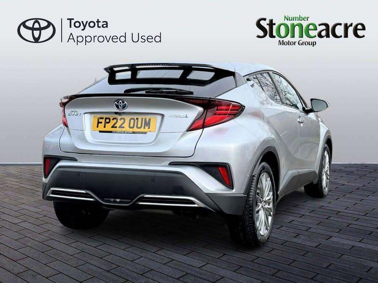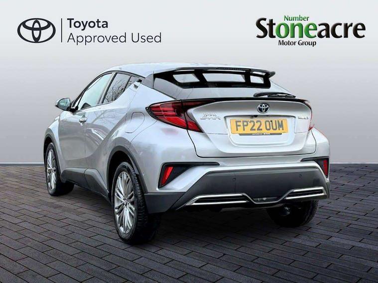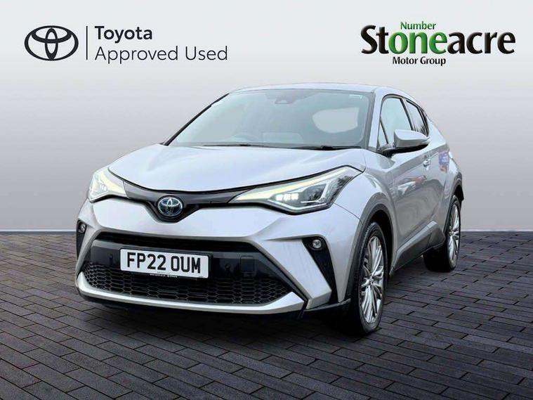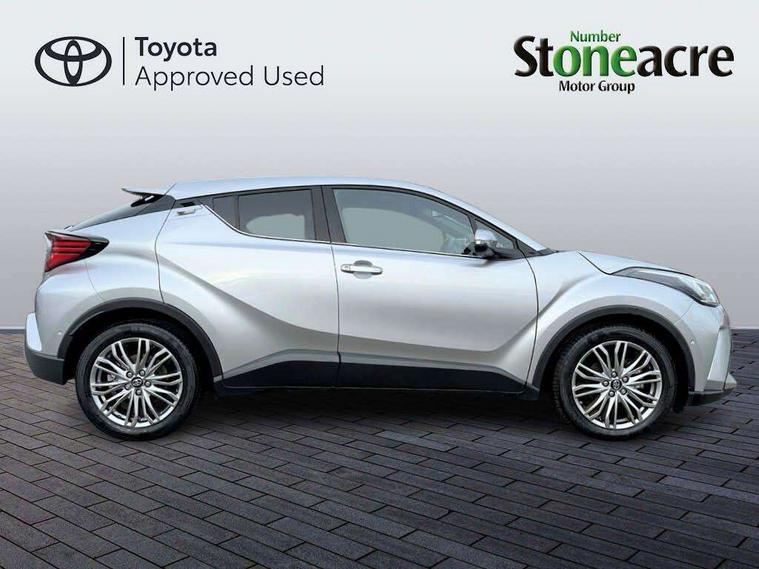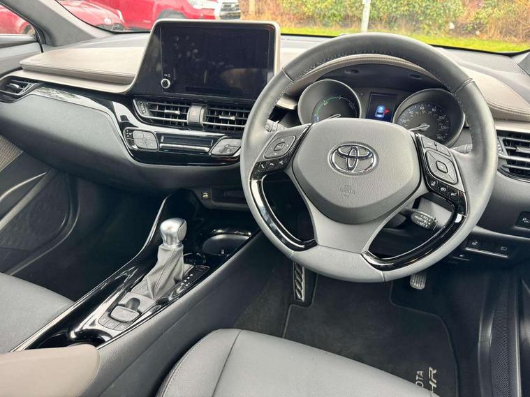 4.2" coloured TFT screen for multi-information display, Adaptive cruise control, Bluetooth connectivity, E-call, Electric power steering, Hybrid system indicator, Lane departure alert with steering control, Remote boot door release in cabin, Remote boot door release in key, Reversing camera, Road sign assist - RSA, Simple Intelligent parking assist, Touch 2 Go navigation system, Trip computer, Voice recognition, Vehicle Stability Control (VSC), 6 speakers, AM/FM radio, DAB Radio (Digital Audio Broadcasting), Toyota touch 2 multimedia system with 8" display, USB connector, Wi-fi connectivity, Adaptive front light system, Adaptive LED Headlights, Anti-jam protection on power windows, Auto high beam, Auto up and down function on all power windows, Automatic headlight levelling, Automatic headlights, Automatic headlights cut-off, Black and body coloured rear bumper, Black upper front grille, Body colour door handles, Body colour door mirrors, Body colour front spoiler lip, Body coloured front bumper, Boot door release with push button, Electric heated door mirrors, Follow me home headlights, Front and rear power windows, Honeycomb lower front grille, LED daytime running lights, LED fog lights, LED front light guide, LED High mounted stop light, LED rear brake lights, LED rear combination lights, Noise reduction layer on front windows and windscreen, Power adjustable door mirrors, Privacy glass, Rain sensor, Rear sequential indicators, Rear side wing doors, Rear spoiler, Rear tailgate, Rear window defogger, Rear window wiper, Shark fin antenna, UV-filter on driver and passenger windows, UV-filter on rear windows, 12v power outlet - front, 3 rear headrests, 3 seat bench in 2nd row, 3 spoke leather steering wheel, 60/40 split folding rear seat, Adjustable rear headrests, Adjustable speed limiter switch on steering wheel, Assist grips front and centre pillar, Audio and telephone switches on steering wheel, Black front door assist grips, Blue ambient lighting on front cup holders, Blue ambient lighting on front doors, Boot light, Chrome interior door handles, Driver and front passenger personal light, Driver and front passenger Whiplash Injury Lessening seats, Driver and passenger seatback pockets, Dual zone automatic air conditioning, Floor mats, Front cupholders, Front head restraints, Front sports seats, Glovebox with internal light, Hard tonneau cover, Heated driver and front passenger seats, Heated steering wheel, Hooks for luggage holding net, Humidifying Nanoe air purifier, Illuminated entry system, Isofix attachments on rear seats, Leather gearshift, Leather wrapped steering wheel, Light on driver sun visor, Light on passenger sun visor, Manual telescopic steering wheel, Manual tilt steering wheel, Microphone on front personal light, Mirror on driver sun visor, Mirror on passenger sun visor, Multimedia switches on steering wheel, Pollen filter, Power adjustable lumbar support on driver seat, Power tilting cushion on driver seat, Shopping bag hooks, Single front passenger seat, Slow opening on lower glovebox, Voice recognition switch on steering wheel, Leather pack - C-HR, Tech with parking sensor pack - C-HR, 16 Disk front wheel brake, 3x3 point rear seatbelts, ABS+EBD+Brake assist, Electronic parking brake, Front and rear seatbelt reminder, Front passenger airbag on/off switch, Hill start assist control (HAC), Pre collision system with pedestrian detection, Pre-tensioners and force limiters, Rear door child safety locks, SRS Airbags - Driver + Front passenger, front side, front and rear curtain and driver's knee airbags, Toyota safety sense, Tyre pressure monitoring system, Acoustic vehicle alert system (AVAS), Glass-breaking alarm sensors, Immobiliser, Intrusion alarm, Intrusion sensor, Motion sensor alarm, Power door locks, Power passenger window lock, Remote central locking, Black lower dashboard, Dark brown upper dashboard, Piano black console, Silver deco line on upper dashboard, Tyre repair kit,