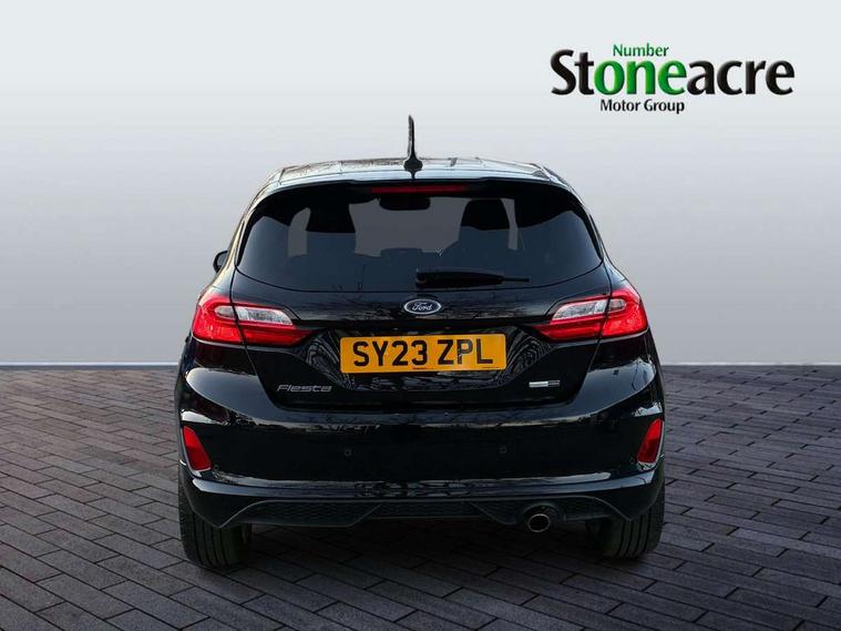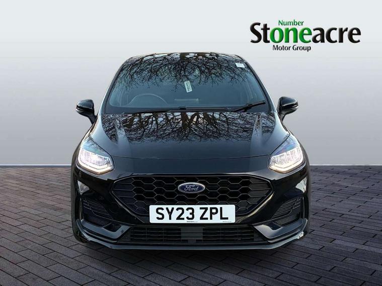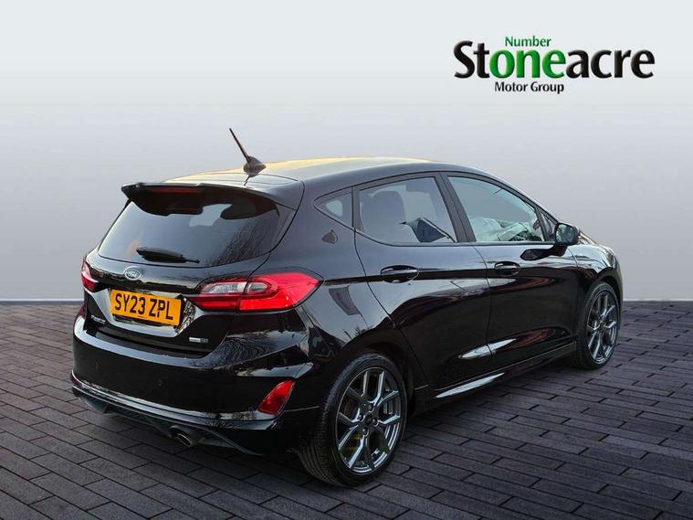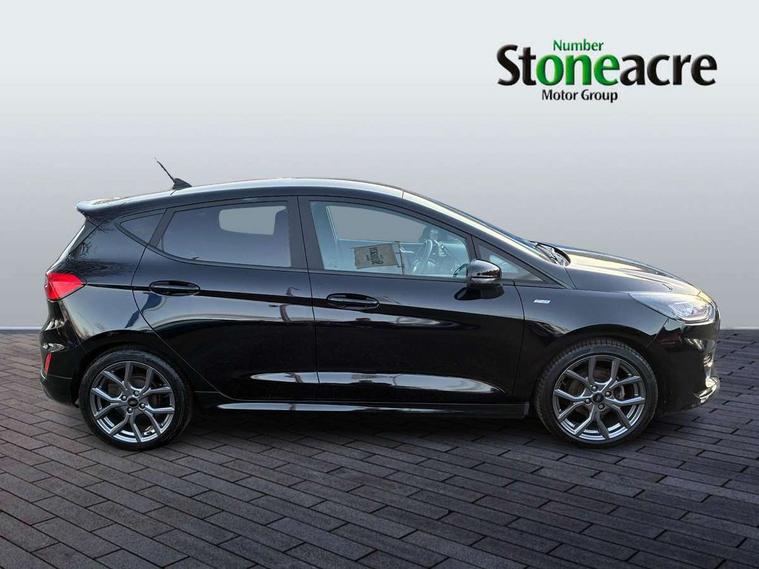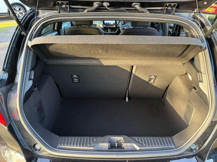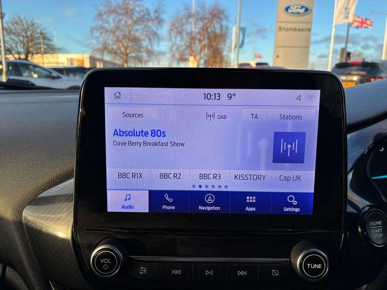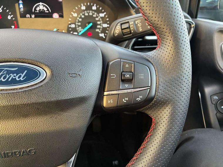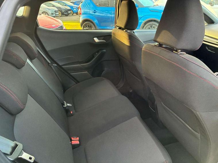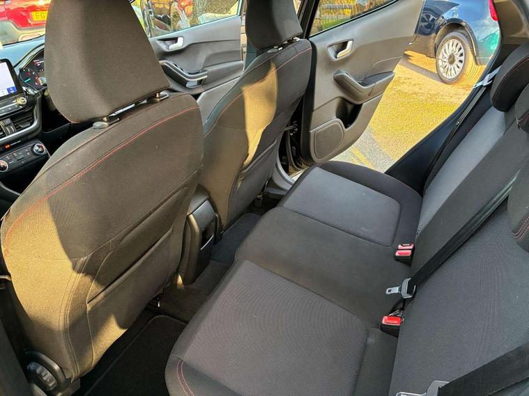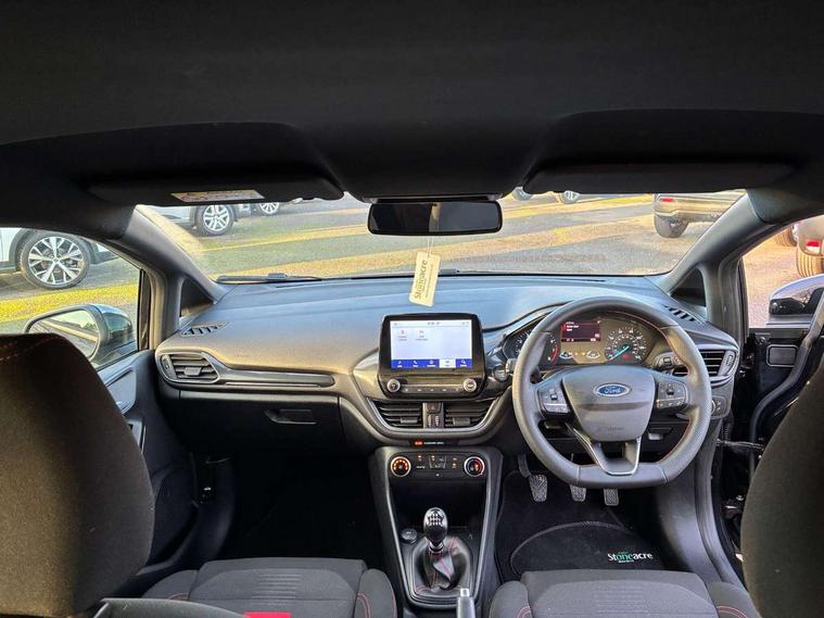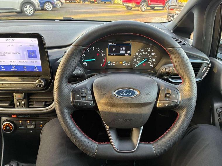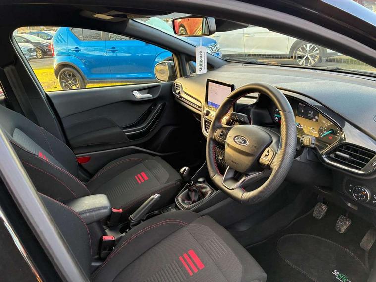 Bluetooth system, Electric power steering, Ford easy fuel, Ford SYNC 3 Navigation system incl 8" touchscreen, 7 speakers, FordPass connect, Apple carplay, android auto, voice control and emergency assistance, Rear parking distance sensors, Selectable drive modes (Normal, Sport, Track), Trip computer, Sports suspension, 2 USB ports, Auxiliary input socket, DAB Digital radio, Steering wheel mounted controls, Body colour bumpers, Body colour door handles, Body colour large rear spoiler, Body coloured electrically operated and heated door mirrors with side indicators, Cornering front fog lights, Electric front windows/one touch facility, Electric rear windows, LED Night signature to rear lights, Quickclear heated windscreen, Rain sensing wipers and auto dimming rear view mirror, Rear privacy glass, Rear wiper, Unique ST-Line upper grille & full bodystyling kit with ST-Line wing badges, 3 spoke flat bottomed leather steering wheel, 60/40 split folding rear seat, Adjustable head restraints, Black headlining, Boot carpet, Centre console with opening armrest, 2x cupholders, 12v and USB, Chrome inner door handles, Cloth upholstery, Footwell illumination, Front floor mats in velour, Front map reading lights, Front seat and rear pockets, Illuminated glovebox, Leather gaiter, Load area light, Manual 2 way passenger seat adjust, Manual 4-way driver seat adjust, Manual air conditioning, Overhead console with sunglasses holder, Pollen filter, Rake/reach adjustable steering wheel, Sensico wrapped steering wheel, Sports front seats, NCAP Pack - Fiesta, 3 point seatbelts on all rear seats, ABS+EBA, Curtain airbags, Driver and passenger airbags, Drivers knee airbag, Electronic stability control with hill start assist, Front passenger airbag deactivation, Front side airbags, Seatbelt warning, Two tone horn, Tyre pressure monitoring system, Keyless start with 'Ford Power' starter button, MyKey system, Remote central locking & engine immobiliser, Thatcham Cat.1 alarm, 17" 5 spoke alloy wheels with rock metallic finish,