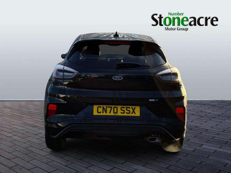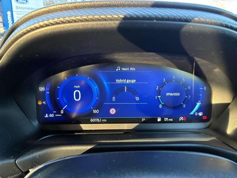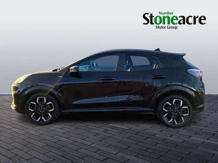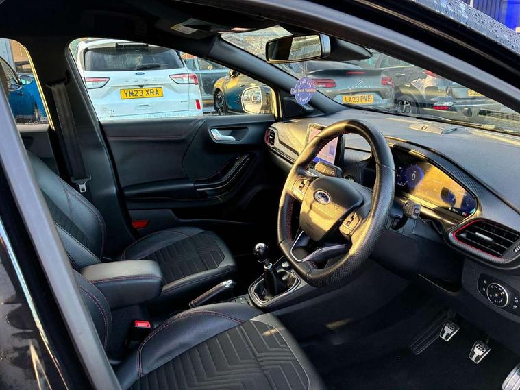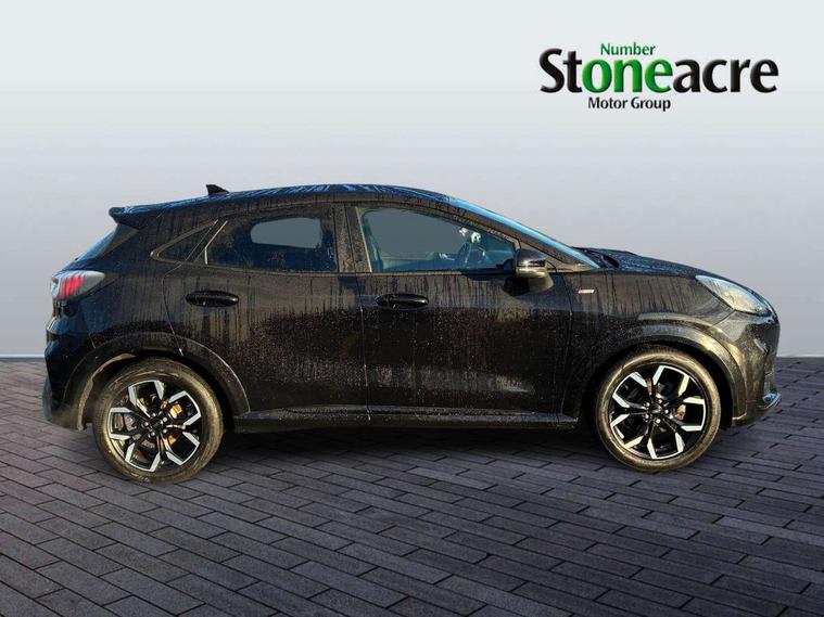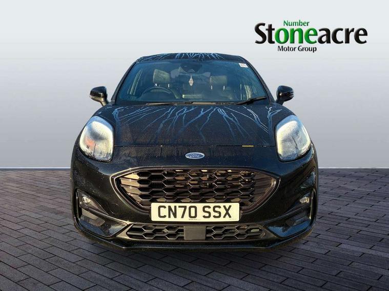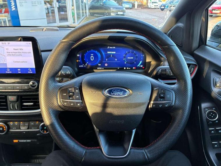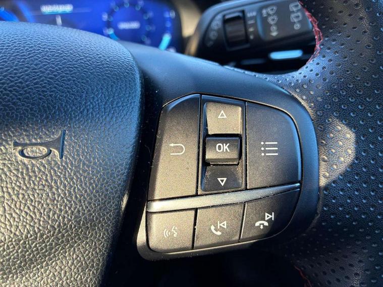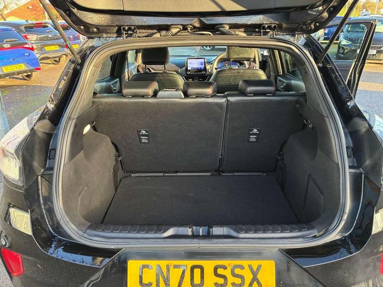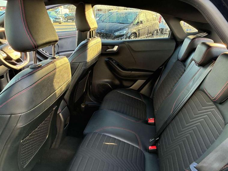 Ford easy fuel, Full digital 12.3" instrument cluster, Lane keeping aid with lane departure warning, Power assist steering, Rear parking sensor, Selectable drive modes(Normal, sport, Eco, trail, slippery), Wireless charging pad, Automatic headlights with rain sensing wipers and auto high beam, Body coloured door mirrors, Front fog lights with cornering lights and LED rear lamps, Power foldable heated door mirrors with puddle lamps, Privacy glass to side rear windows and tailgate glass, Quickclear heated windscreen, Rear wiper, ST-Line body kit with large rear spoiler wth sports suspension, Alloy sports pedals, Centre console with armrest and stowage, Driver and passenger seat lumbar and height adjust, Ford megabox extended bootspace, Front and rear floor mats, Front and rear head restraints, Manual air conditioning, Sensico partial premium upholstery, ST-Line flat bottomed sensico leather steering wheel with leather handbrake and aluminium gear knob, B&O Premium Audio system + Ford SYNC 3 navigation pack - Puma, 3 rear seatbelts, Electronic stability control (ESC) and hill start assist, Pre-collision assist with autonomous emergency braking, pedestrian/cyclist detection & post-collision braking, Tyre pressure monitoring system (TPMS), Thatcham alarm, Carbon look interior deco spears,