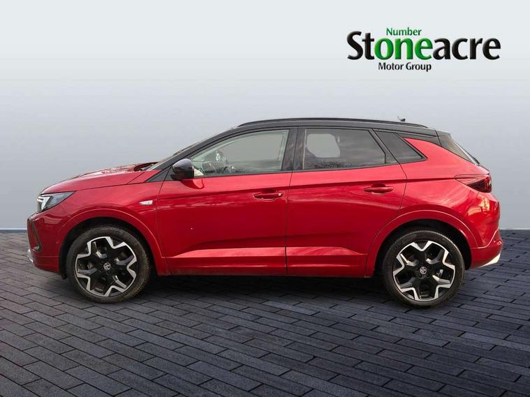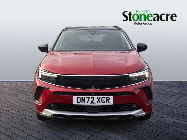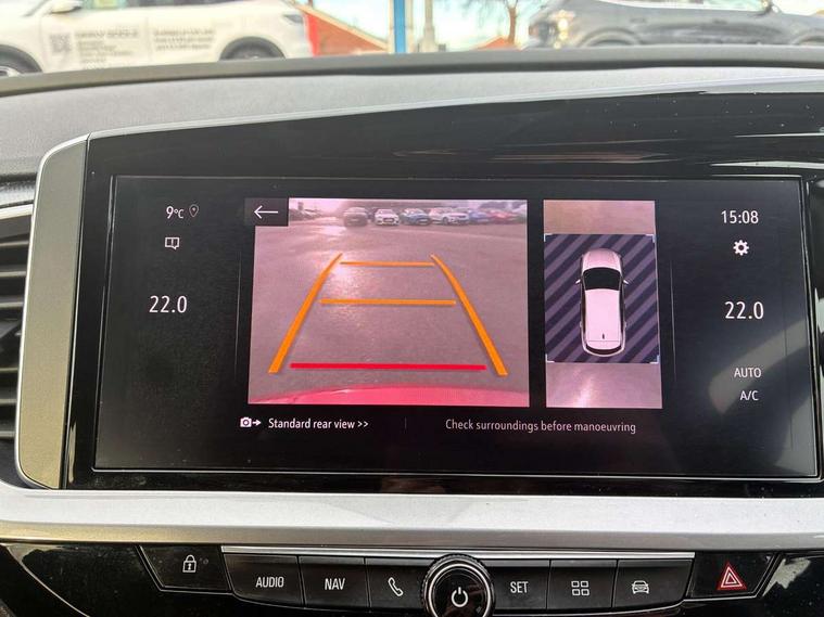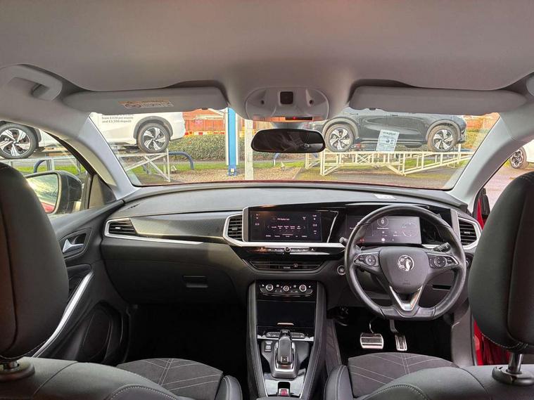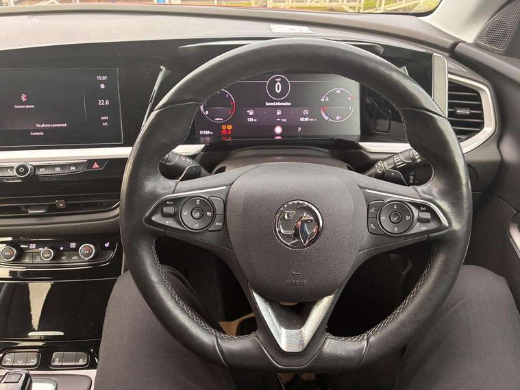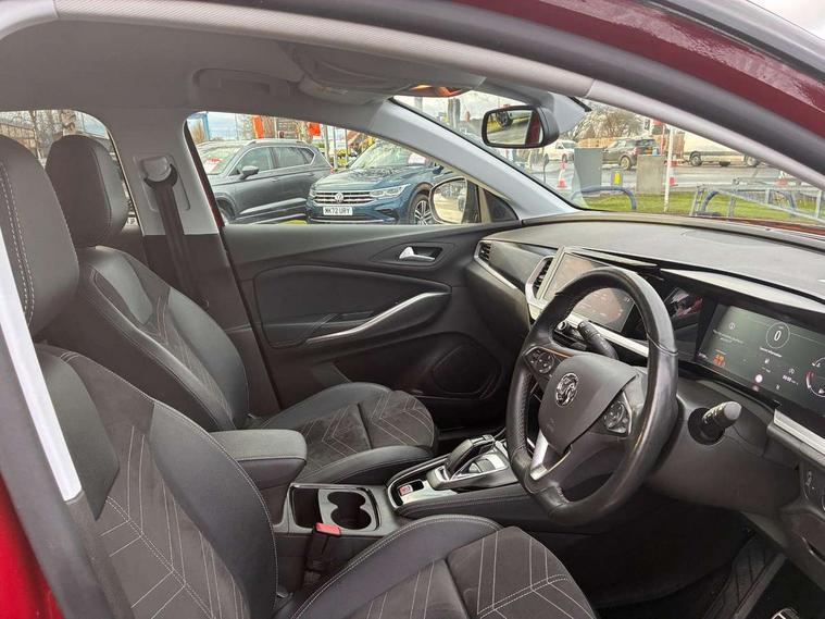 12" colour digital cluster, Central facia display with digital clock, outside air temperature and audio information, Digital fuel gauge with low fuel level warning light, Digital rev counter, Digital speedometer, Digital water temperature gauge with warning light, Driver drowsiness alert system, Driver information - Total mileage, service indicator, oil life, Front and rear parking distance sensors with 360 degree rear view camera and advanced park assist, Gearshift up/down indication light, Highway integration assist (Lane positioning assistant and Adaptive cruise control), Lane departure warning system, Lane keep assist, Lights on audible warning, Multi function trip computer - Trip odometer, vehicle range, average speed and fuel economy, instantaneous fuel economy and driving time, Multimedia navi pro with 10" colour touch+ sat nav+AM/FM/DAB radio, bluetooth audio streaming/mobile phone portal, Apple carplay/Android auto, USB, Power operated tailgate with foot sensor, Side blind spot alert, Speed sensitive electric power assisted steering, Speed sign recognition, Vauxhall connect including Emergency call (SOS e-call) and Breakdown call (b-call), Wireless charger for mobile devices, Six speaker - four front + two rear, Steering wheel mounted audio/phone/cruise controls, Alloy effect front and rear skid plates, Automatic lighting control, Automatically dimming anti dazzle rear view mirror, Black door mirrors, Black side window trim, Body colour door handles, Body colour lower front and rear bumpers, protective wheel arches and lower door cladding, Body colour upper front bumper, Collapsible windscreen wipers, Dark tinted rear side and tailgate windows, Door to door illumination, Electrically operated front and rear windows with safety auto reverse and one touch up/down facility, Front wiper system spraying directly from wipers, Hazard warning lights, Heated rear screen with timed cut off, Heated windscreen, High beam assist, High gloss black Griffin for Vizor and tailgate with high gloss black Grandland tailgate lettering, High gloss black roof rails, High level centre rear brake light, IntelliLux adaptive LED pixel headlights and LED tail lights, Intermittent rear window wash/wipe, LED daytime running lights, LED front fog lights, Magic wash, Manual headlight beam levelling, Rain sensor windscreen wipers, Rear side wing doors, Rear spoiler, Reversing light, Shark fin aerial, Silver effect protective front and rear skid plate, Soundproof insulated windscreen, Tinted windows, Twin electrically adjustable and heated power door mirrors (wide-angle on drivers side) with automatic timed cut-off, Two speed windscreen wipers with variable intermittent wipe, Upper and lower bumper design, Vizor front grille, Welcome lighting, 12v plug in front console and 12v plug in boot, 3 bench rear seats in 2nd row, 3 spoke flat bottom leather steering wheel with satin chrome effect bezel, 4 way electric driver lumbar support, 4 way passenger electric lumbar support, 60/40 split folding rear seat with centre rear seat armrest and load though facility, Advanced predictive logic control system using a sun sensor, Alcantara upholstery, Alloy sports pedals, Ambient centre console downlighter, Automatic air direction and fan speed with manual override, Charcoal filter, Chrome effect interior door handles, Covered storage compartment in centre console and in driver armrest, Driver's centre armrest, Drivers and front passengers seat with height, reach, tilt, backrest adjustment and seat cushion extension, Dual zone electronic climate control, Ergonomic active drivers sports style seat, Ergonomic active front passenger sports style seat, Front door pockets with 2.6 litre capacity, Front seat back storage pockets, Fully carpeted luggage area, Height adjustable headrests, Illuminated driver/passenger sunvisors with vanity mirror, Illuminated luggage area, ISOFIX on front passenger and rear outer seats, Luggage compartment cover, Reach + rake adjustable steering column, Rear centre seat head restraint, Rear door pockets with 1.8 litre capacity, Rear passenger compartment heating ducts, Rear reading lights, Two drinks holders in centre console, Winter pack - Grandland, Anti-lock braking system (ABS), Automatic emergency braking with pedestrian detection, Child proof locks on rear doors, CSC - Cornering stability control, Deactivation switch for front passenger front and side impact airbags, Deflation detection system, Driver airbag, Dual seatbelt pretensioners on front seats, EBD - Electronic brakeforce distribution, Electronic parking brake, Electronic stability program (ESP) including traction control, Front passenger airbag, Front seat side impact airbags, Full size curtain airbags for driver, front seat passenger and outer rear seat passengers, Hill start assist, Hydraulic Brake Assist (HBA), Inertia reel lap and diagonal seatbelts for all seats, Load limiters on outer rear seatbelt retractors, Pretensioners on outer rear seatbelt retractors, Smart seatbelt reminder for front and rear seats, Tyre pressure monitoring system, Deadlocking system, Electronically protected audio equipment, Engine deadlock immobiliser, Keyless entry and start, Locking wheel nuts, Remote control central locking activation switch on driver door, Remote security alarm system, Black door panels with black premium leather effect inserts, Dax decor facia panel with palladium medium finish, 19" diamond cut bi-colour alloy wheel, Tyre inflation kit,