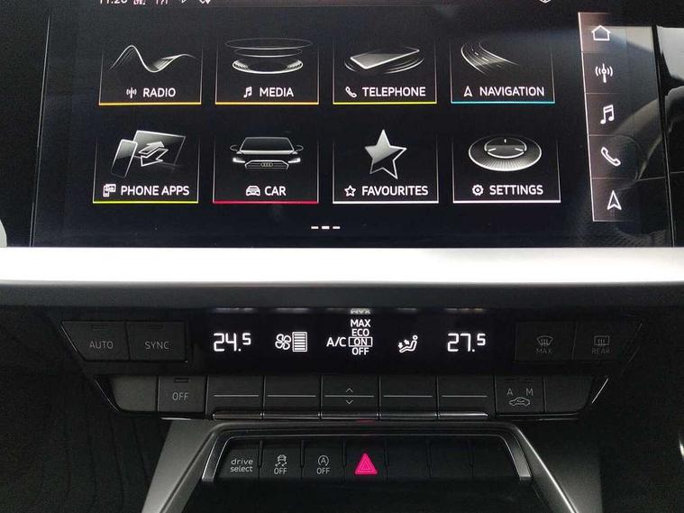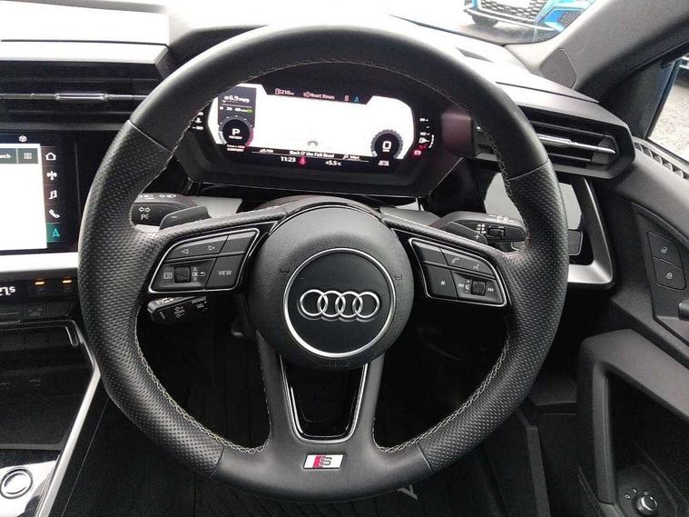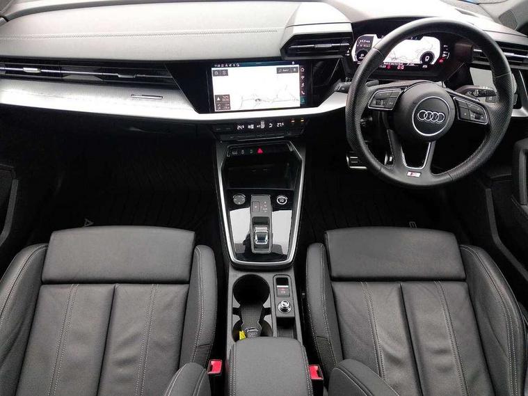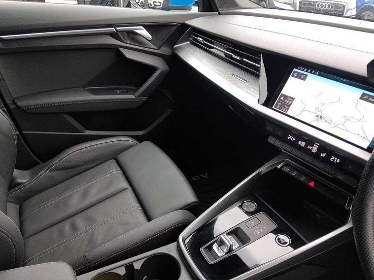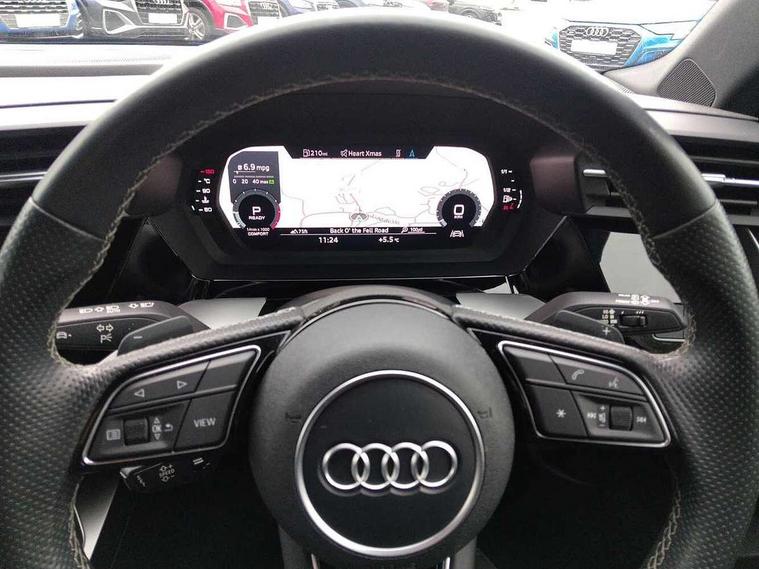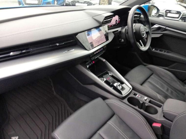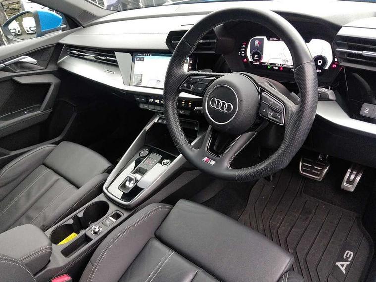 Audi drive select (Auto, Comfort, Dynamic, Efficiency and Individual), Audi smartphone interface, Audi Virtual Cockpit - 10.25" digital and colour instrument cluster, Automatic start/stop system with recuperation, Bluetooth interface, Collision avoidance assistant, e-Call (emergency call), Electromechanical power speed sensitive steering, Lane departure warning system, MMI Navigation Plus with high resolution 10.1" colour touch screen display, Service indicator, Trip computer, Voice control system with natural language interaction, 2xUSB-C connection with data and charging functions, 6 passive loudspeakers, DAB Digital radio, 3rd brake light, Acoustic glass windscreen, Aluminium window trim, Auto dimming frameless rear view mirror, Electrically adjustable/heated/folding/dimming door mirrors with kerb view includes integrated LED indications + kerb view function for passenger side, Front electric windows, Illuminated aluminium inserts front door sills with S logo, LED daytime running lights, LED headlights with LED rear lights and dynamic rear indicators, Light and rain sensors, Privacy glass - dark tinted rear window, rear door and side windows, Rear electric windows, Rear side air outlets in grained matt black, Rear side wing doors, Rear wiper, S line bumpers, S roof spoiler, 12V socket and storage compartment in front centre console, 3 seat bench in 2nd row, 40/20/40 split folding rear seat bench with cupholder, Black cloth headlining, Dual zone electronic climate control, Front and rear centre armrest in leather, Front and rear headrests, Front/rear floor mats, Height and reach adjustable steering wheel, Illuminated vanity mirror, Interior lighting - glove compartment light and right hand side, Luggage compartment floor covering, Manual boot compartment lid, Manually adjustable front seats, Seat side bolsters, Single front passenger seat, Stainless steel pedals and front footrest in black, Twin leather upholstery with front sports seats S embossed logo, Aluminium interior elements pack - A3 Sportback, S line styling pack - A3 Sportback, 3x3 point rear seat belts, Audi pre sense front, Driver and front passenger airbag with passenger airbag deactivation, Electronic Stabilisation Control (ESC) including ABS, ASR and EDL, First aid kit with warning triangle and 2 safety vests, Front side airbags with head airbags and interaction airbag, Pre-sense front with pedestrian and cyclist detection, Seatbelt monitoring, Tyre pressure loss indicator, Anti theft alarm, Anti-theft wheel bolts, Immobiliser, Manual child locks, Remote control central locking, Accent surfaces in the dashboard and centre console in platinum grey silk effect paint finish, Dark spectrum aluminium inlays,