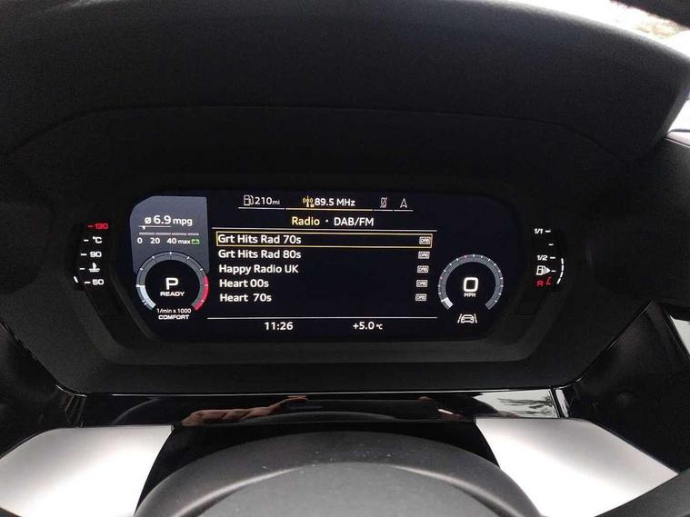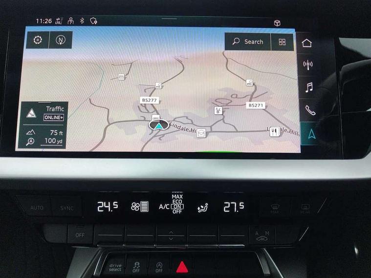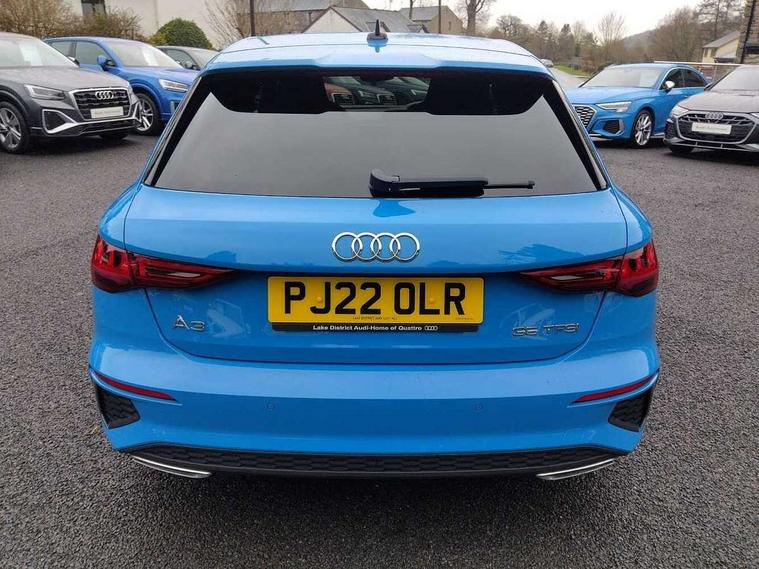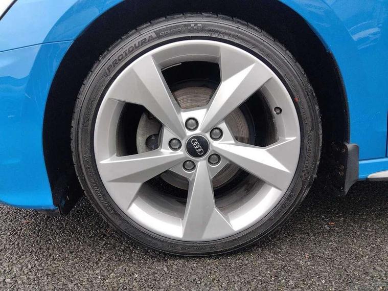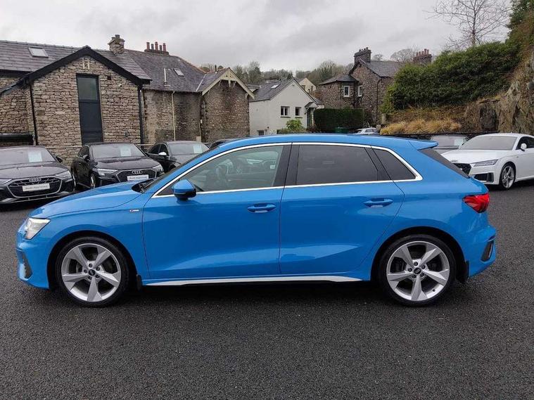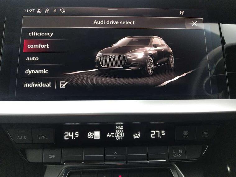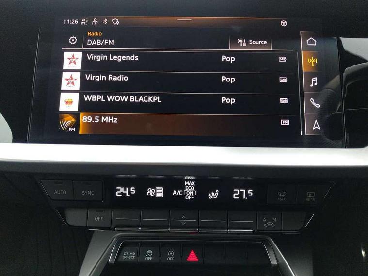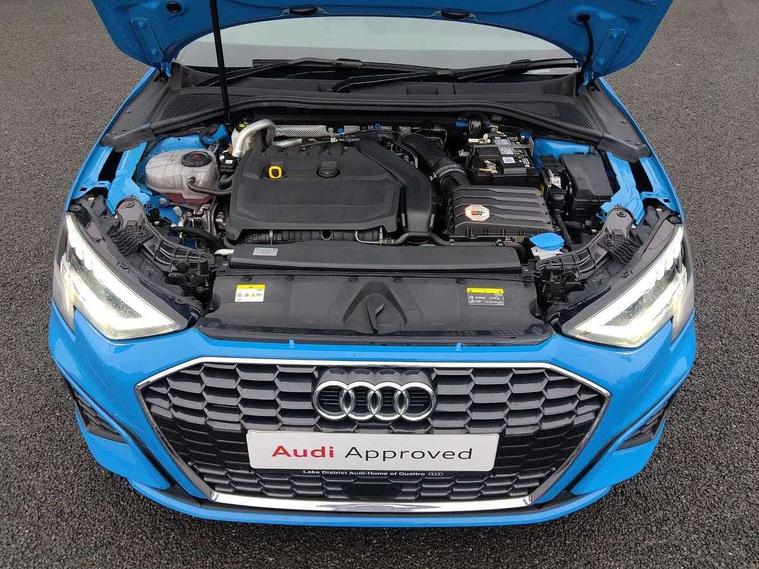 Audi drive select (Auto, Comfort, Dynamic, Efficiency and Individual), Audi smartphone interface, Audi Virtual Cockpit - 10.25" digital and colour instrument cluster, Automatic start/stop system with recuperation, Bluetooth interface, Collision avoidance assistant, e-Call (emergency call), Electromechanical power speed sensitive steering, Lane departure warning system, MMI Navigation Plus with high resolution 10.1" colour touch screen display, Service indicator, Trip computer, Voice control system with natural language interaction, 2xUSB-C connection with data and charging functions, 6 passive loudspeakers, DAB Digital radio, 3rd brake light, Acoustic glass windscreen, Aluminium window trim, Auto dimming frameless rear view mirror, Electrically adjustable/heated/folding/dimming door mirrors with kerb view includes integrated LED indications + kerb view function for passenger side, Front electric windows, Illuminated aluminium inserts front door sills with S logo, LED daytime running lights, LED headlights with LED rear lights and dynamic rear indicators, Light and rain sensors, Privacy glass - dark tinted rear window, rear door and side windows, Rear electric windows, Rear side air outlets in grained matt black, Rear side wing doors, Rear wiper, S line bumpers, S roof spoiler, 12V socket and storage compartment in front centre console, 3 seat bench in 2nd row, 40/20/40 split folding rear seat bench with cupholder, Black cloth headlining, Dual zone electronic climate control, Front and rear centre armrest in leather, Front and rear headrests, Front/rear floor mats, Height and reach adjustable steering wheel, Illuminated vanity mirror, Interior lighting - glove compartment light and right hand side, Luggage compartment floor covering, Manual boot compartment lid, Manually adjustable front seats, Seat side bolsters, Single front passenger seat, Stainless steel pedals and front footrest in black, Twin leather upholstery with front sports seats S embossed logo, Aluminium interior elements pack - A3 Sportback, S line styling pack - A3 Sportback, 3x3 point rear seat belts, Audi pre sense front, Driver and front passenger airbag with passenger airbag deactivation, Electronic Stabilisation Control (ESC) including ABS, ASR and EDL, First aid kit with warning triangle and 2 safety vests, Front side airbags with head airbags and interaction airbag, Pre-sense front with pedestrian and cyclist detection, Seatbelt monitoring, Tyre pressure loss indicator, Anti theft alarm, Anti-theft wheel bolts, Immobiliser, Manual child locks, Remote control central locking, Accent surfaces in the dashboard and centre console in platinum grey silk effect paint finish, Dark spectrum aluminium inlays,