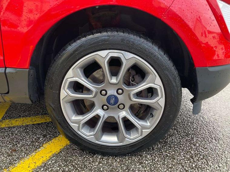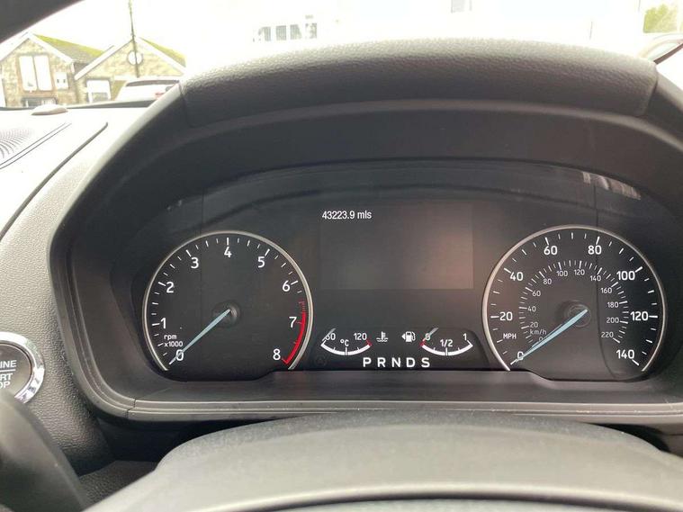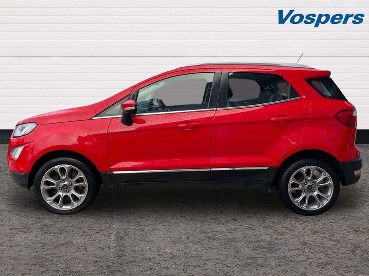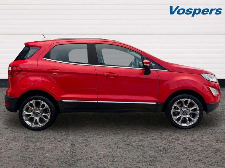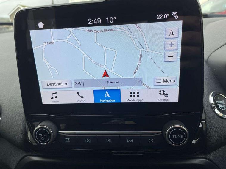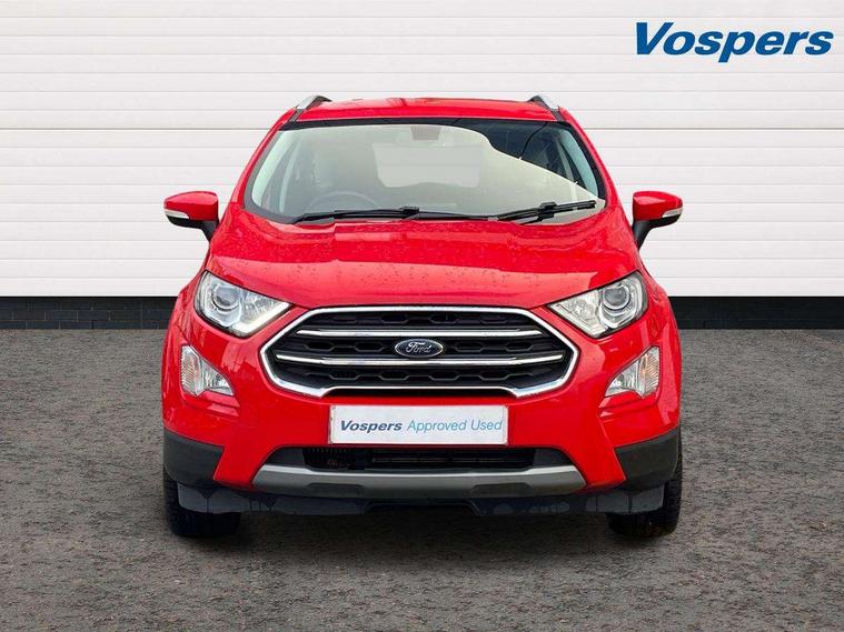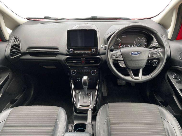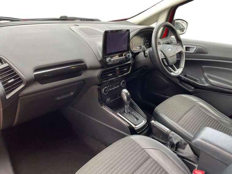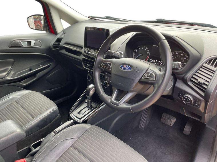 Cruise control, Easy fuel capless refuelling system, PAS, Trip computer, 'Quickclear' heated windscreen/heated washer jets, Ambient light, Auto dimming rear view mirror, Automatic headlights, Body colour door handles, Body coloured bumpers, Electrically adjustable and heated door mirrors, Front door threshold plates, Front fog lights, Front grille with chrome trim surround, Headlamps with LED day running lights, Headlight levelling control, Power foldable door mirrors with puddle lights, Power front and rear windows with global opening/closing, Rain sensing front wipers, Rear wiper, 12V socket in front and rear, 60/40 split rear seats, 7 shade adjustable ambient lighting, Centre console with sliding front armrest, Cooled glovebox, Courtesy lights with map reading light, Driver seat height/lumbar adjust, Driver's side glovebox, Driver/passenger sunvisors and lidded vanity mirrors, EATC - Electronic Auto Temperature control, Folding grab handles, Footwell ambient lighting, Front head restraints, Front seat back map pockets, Front/rear floor mats, Groove cloth/leather upholstery, Illuminated glovebox, Illuminated luggage compartment, Isofix system on outer rear seats, Leather gear knob and handbrake grip, Leather steering wheel with audio controls, Luggage compartment carpet, Overhead console with sunglasses holder, Rake adjustable rear seats, Reach + rake adjustable steering column, Rear headrests, Steering wheel with chrome inserts, Storage drawers under front seats, Tie down hooks, Variable boot floor, Rear view camera pack - Ecosport, 3x3 point rear seatbelts, ABS, Child locks on rear doors, Curtain airbags, Driver airbag, Drivers knee airbag, Electronic Stability Programme with hill launch assist, Emergency brake assist, Front passenger airbag deactivation, Front side airbags, Passenger airbag, Seatbelt reminder for driver and front passenger, Traction control, Tyre pressure monitoring system, Immobiliser, MyKey system, Remote central locking, Thatcham 1 volume sensing alarm, Tyre inflation kit,